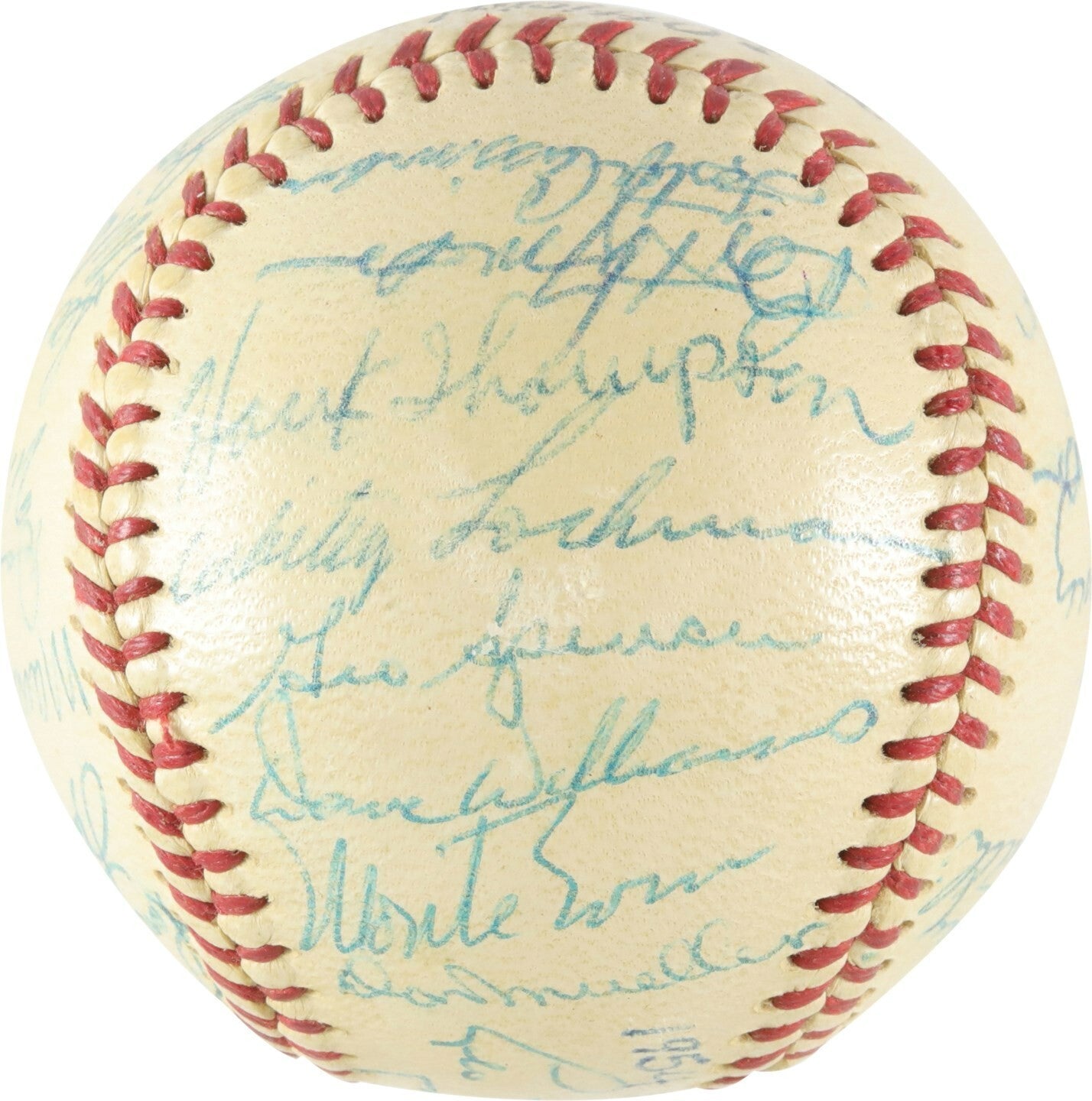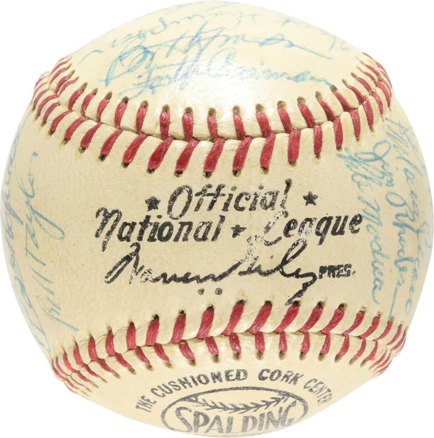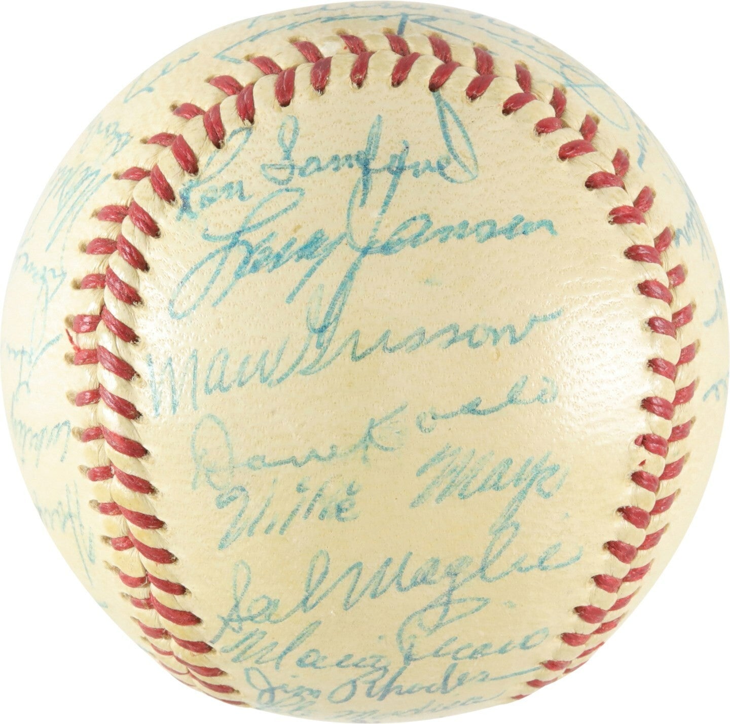 Official National League (Warren Giles) baseball features twenty-nine (29) 1954 World Champion New York Giants signatures including Willie Mays, Leo Durocher, Monte Irvin, Maglie, Rhodes, St. Clair, Spencer, Williams, and others. ALL the signatures are authentic, there are NO clubhouse signatures (very rare). Ball rates a strong EX-MT to NM condition overall. Comes with PSA LOA.