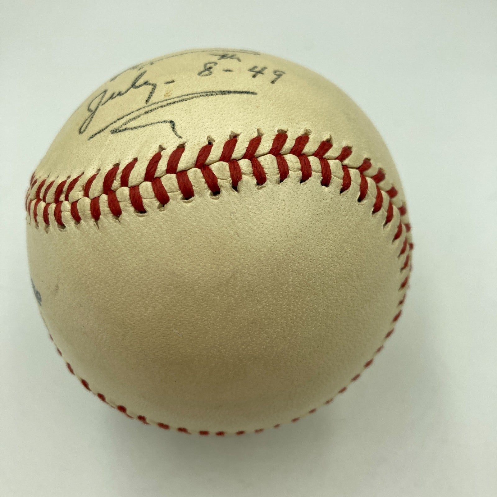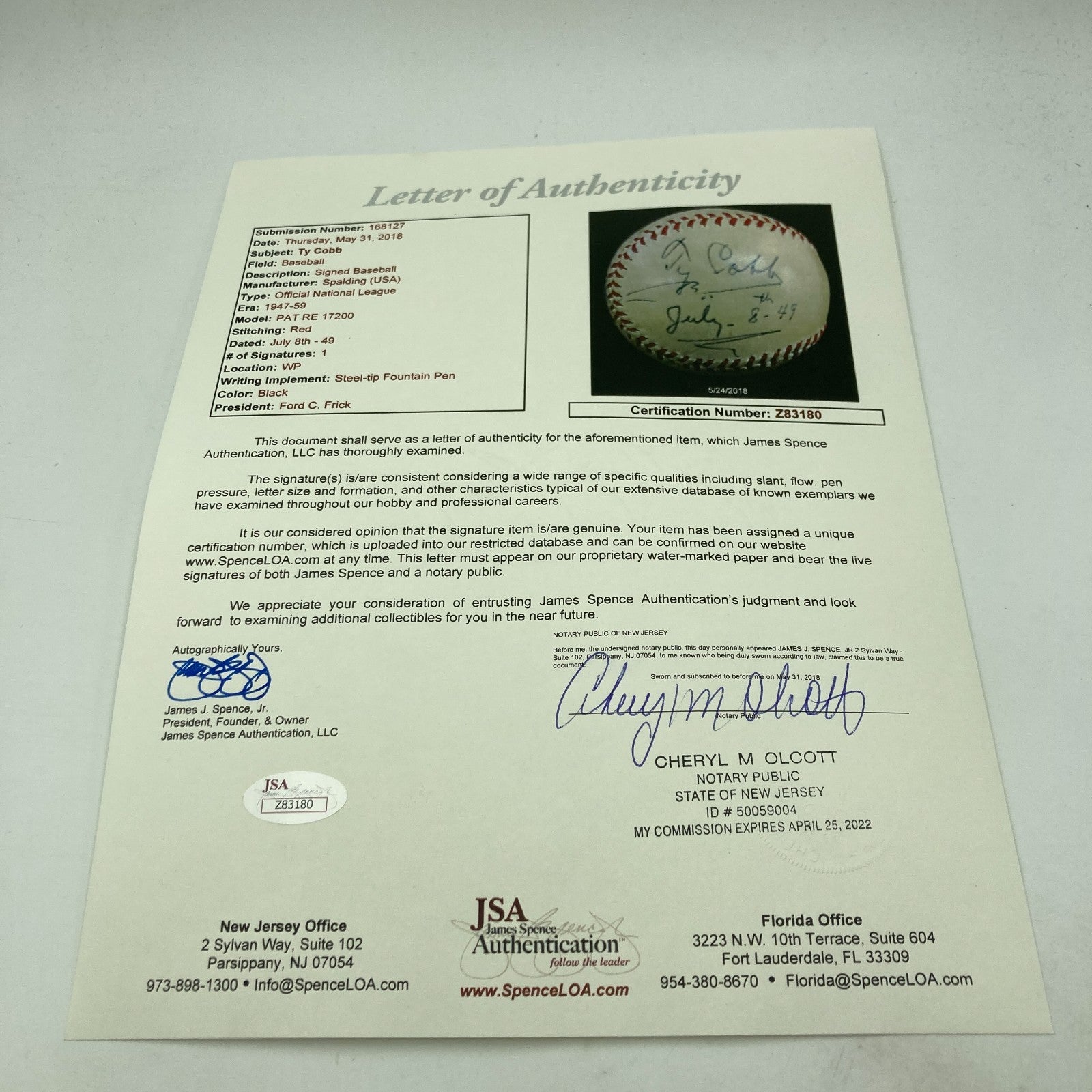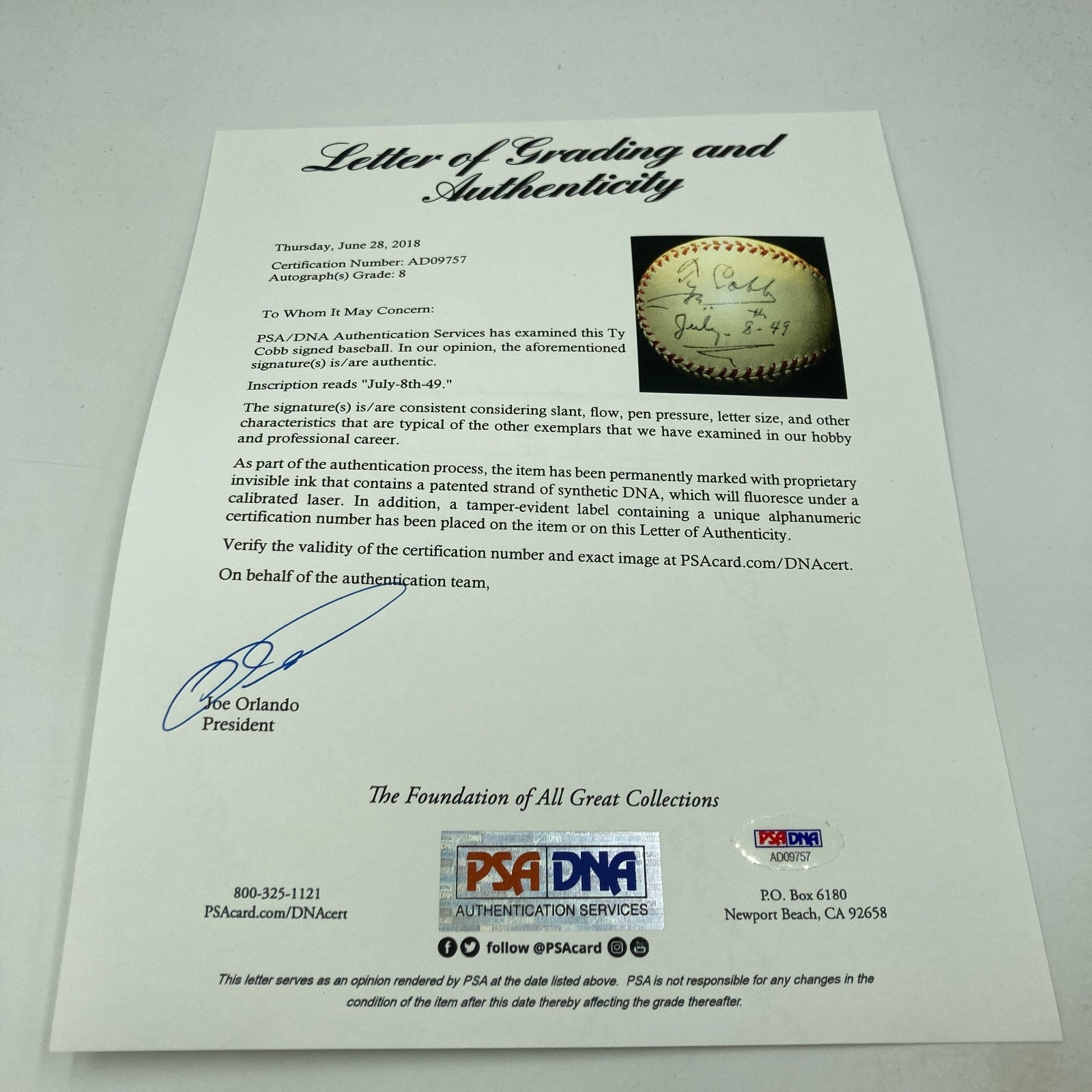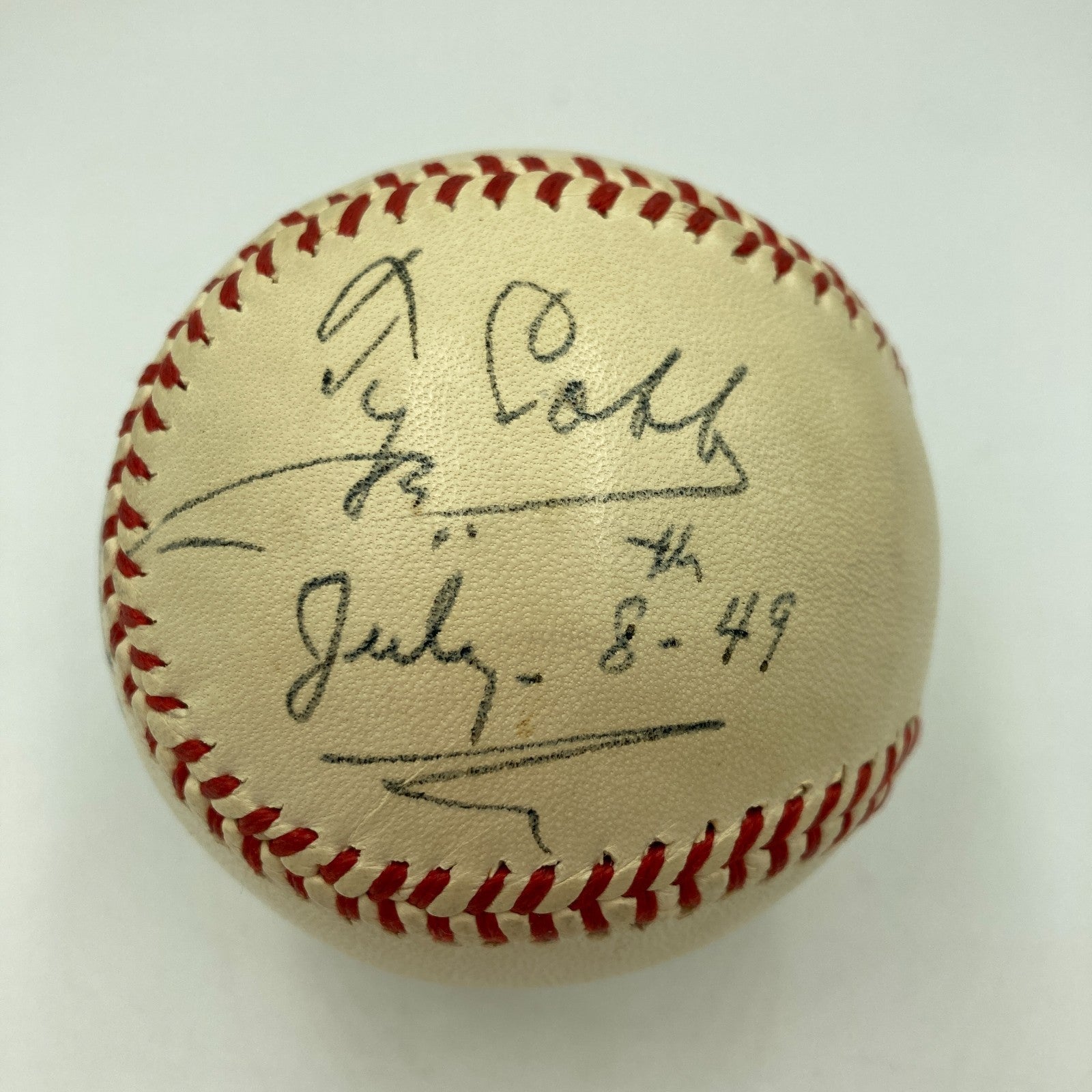 The Finest Ty Cobb Single Signed 1940's National League Ford Frick Baseball. Stunning white baseball with a bold fountain pen signature. Cobb signed the ball and inscribed "7-8-1949". Comes with full letter PSA DNA COA graded Near MINT 8 and full letter JSA COA.