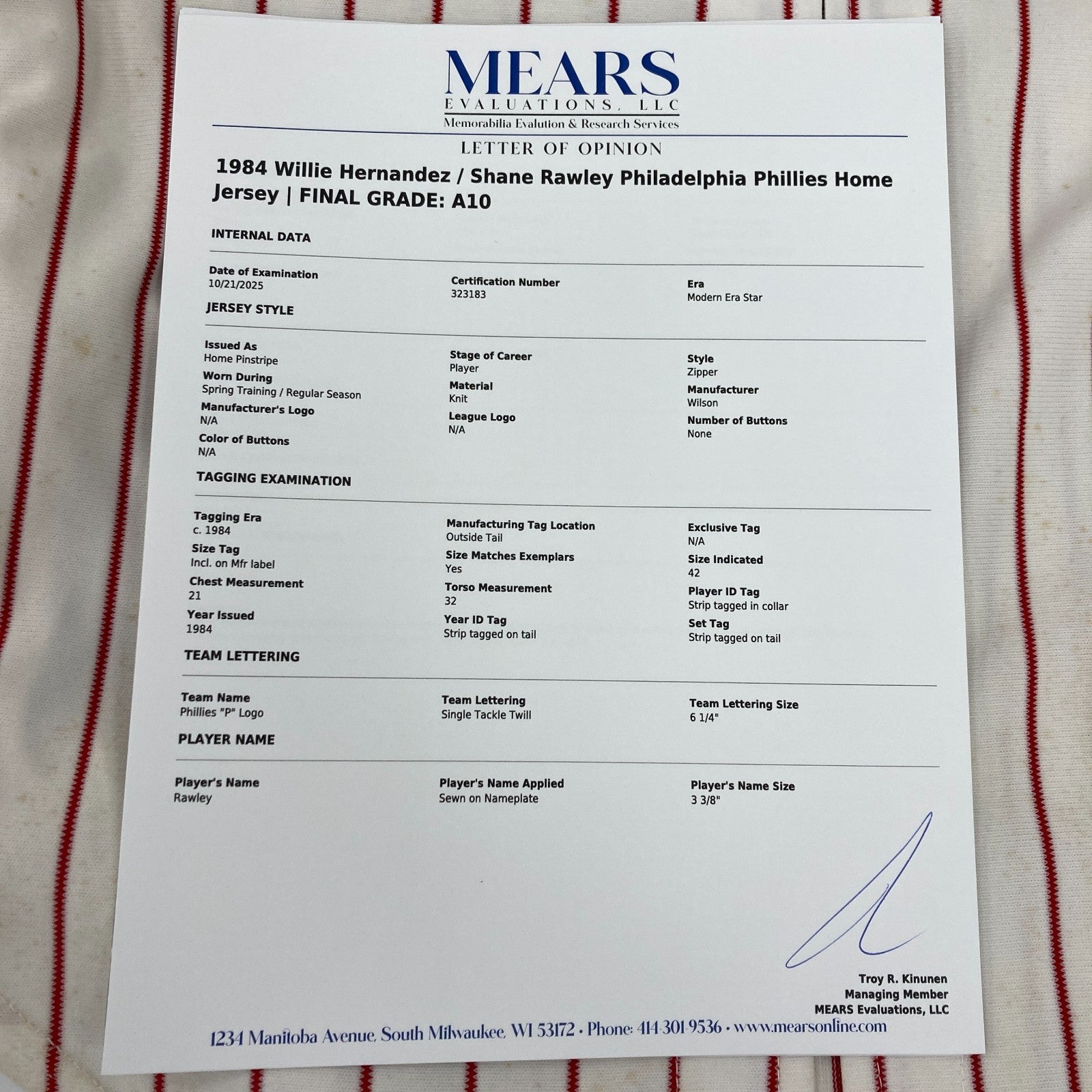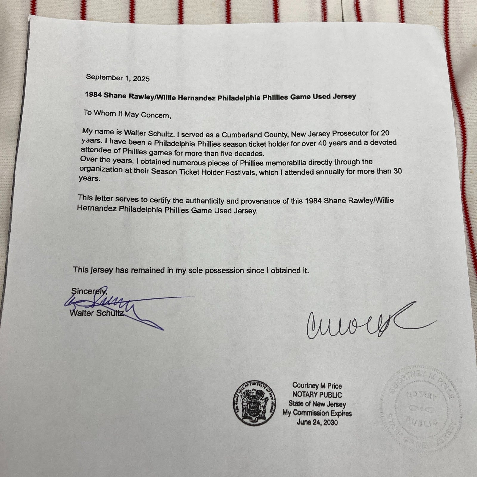 Comes with full letter COA from MEARS and signed and notarized Letter Of Provenance from the original Owner who got it directly from the Phillies.