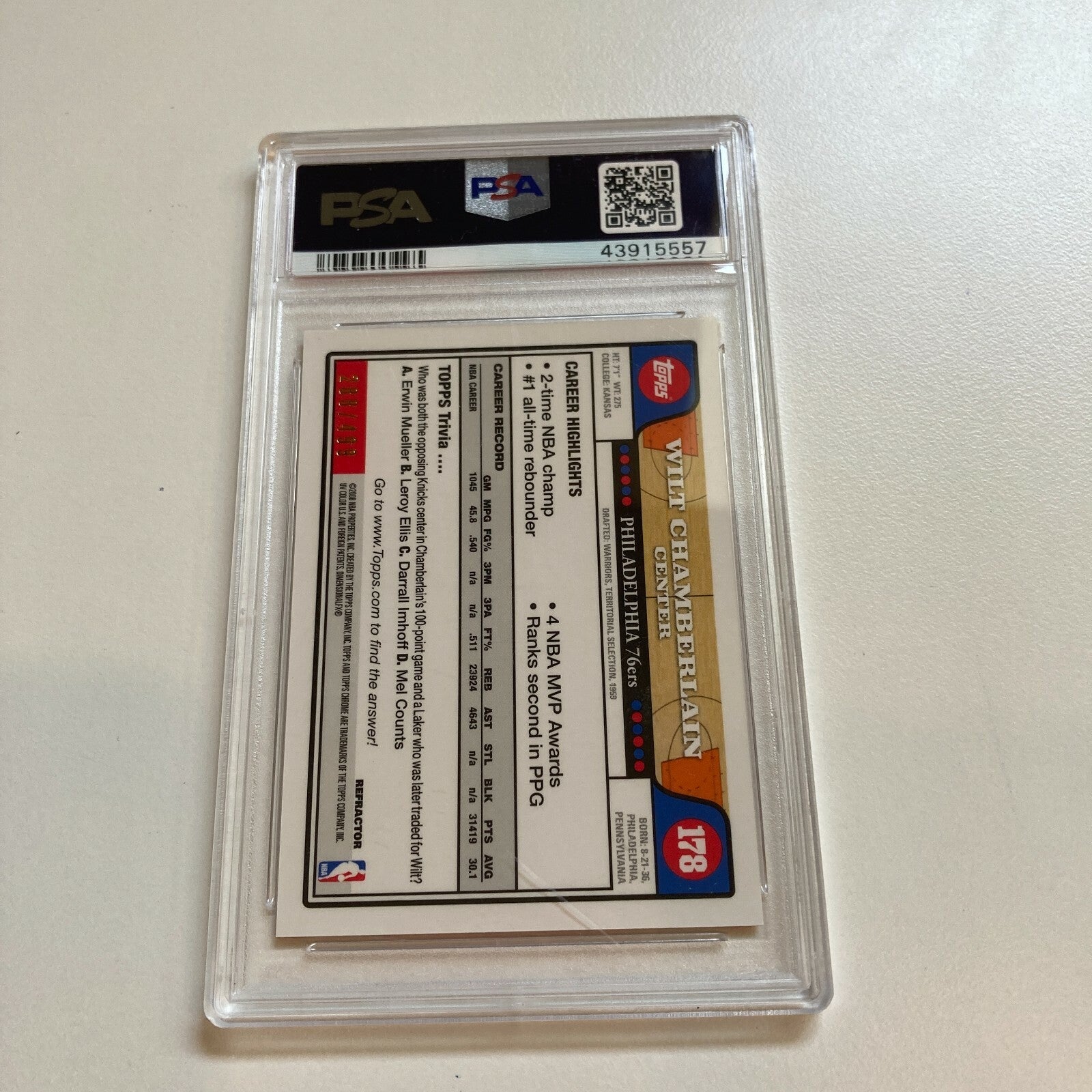 Wilt Chamberlain 2008-09 Topps Chrome #178 Orange Refractor /499 PSA 10 Gem Mint