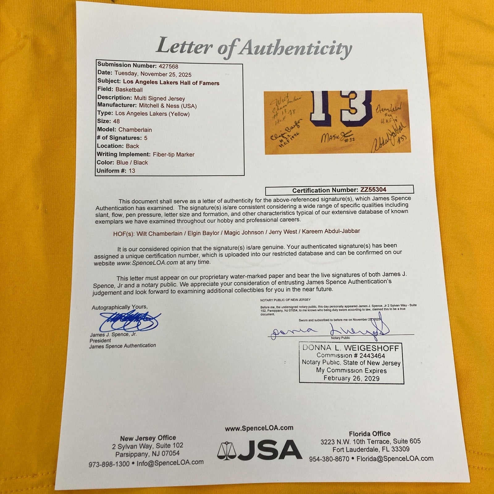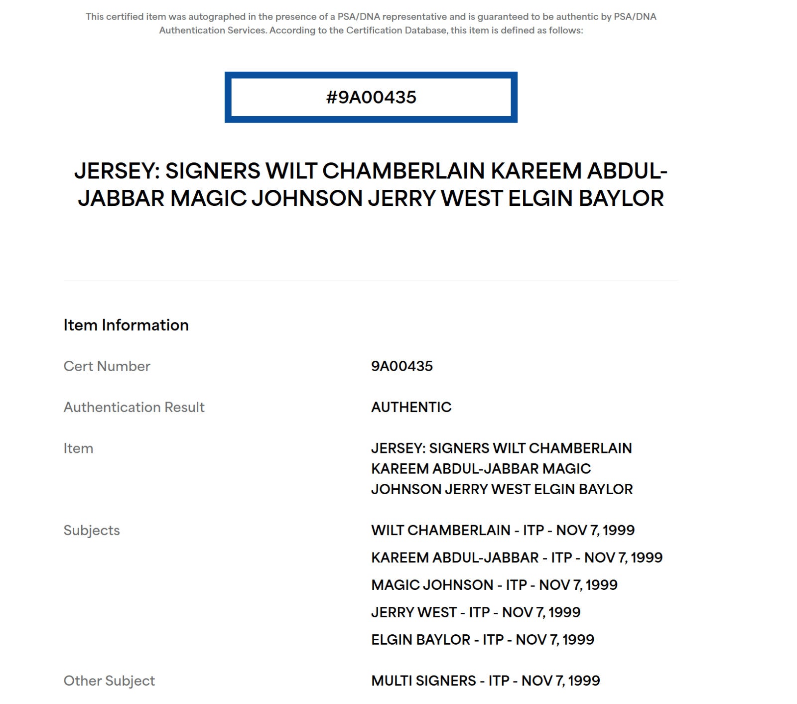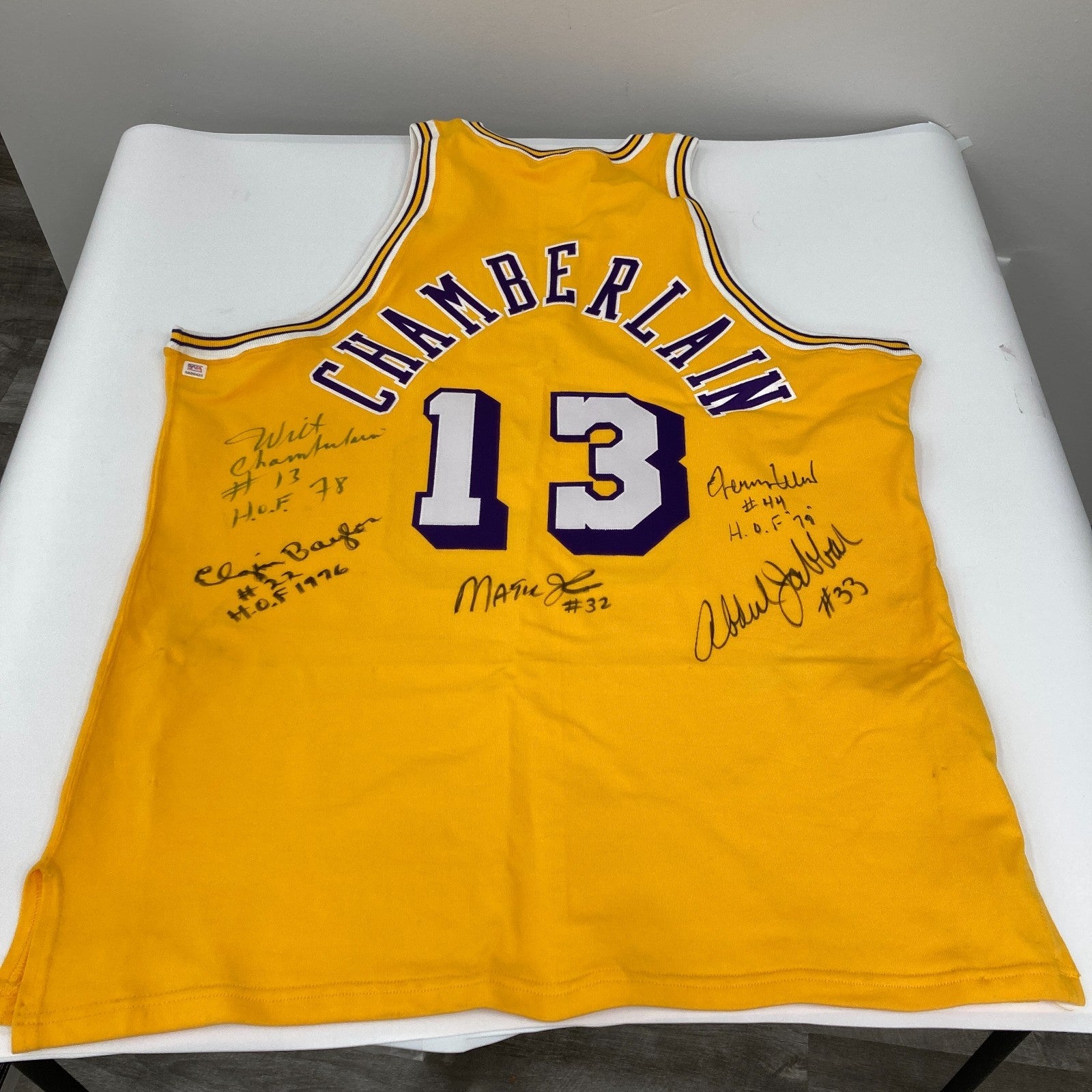 5 signatures with Wilt Chamberlain, Elgin Baylor, Magic Johnson, Jerry West, Kareem Abdul-Jabbar. Wilt inscribed "#13 HOF 1978". Some of the other players inscribed their HOF year as well. Comes with full letter JSA COA and a PSA DNA COA. PSA witnessed this jersey being signed in 1999.