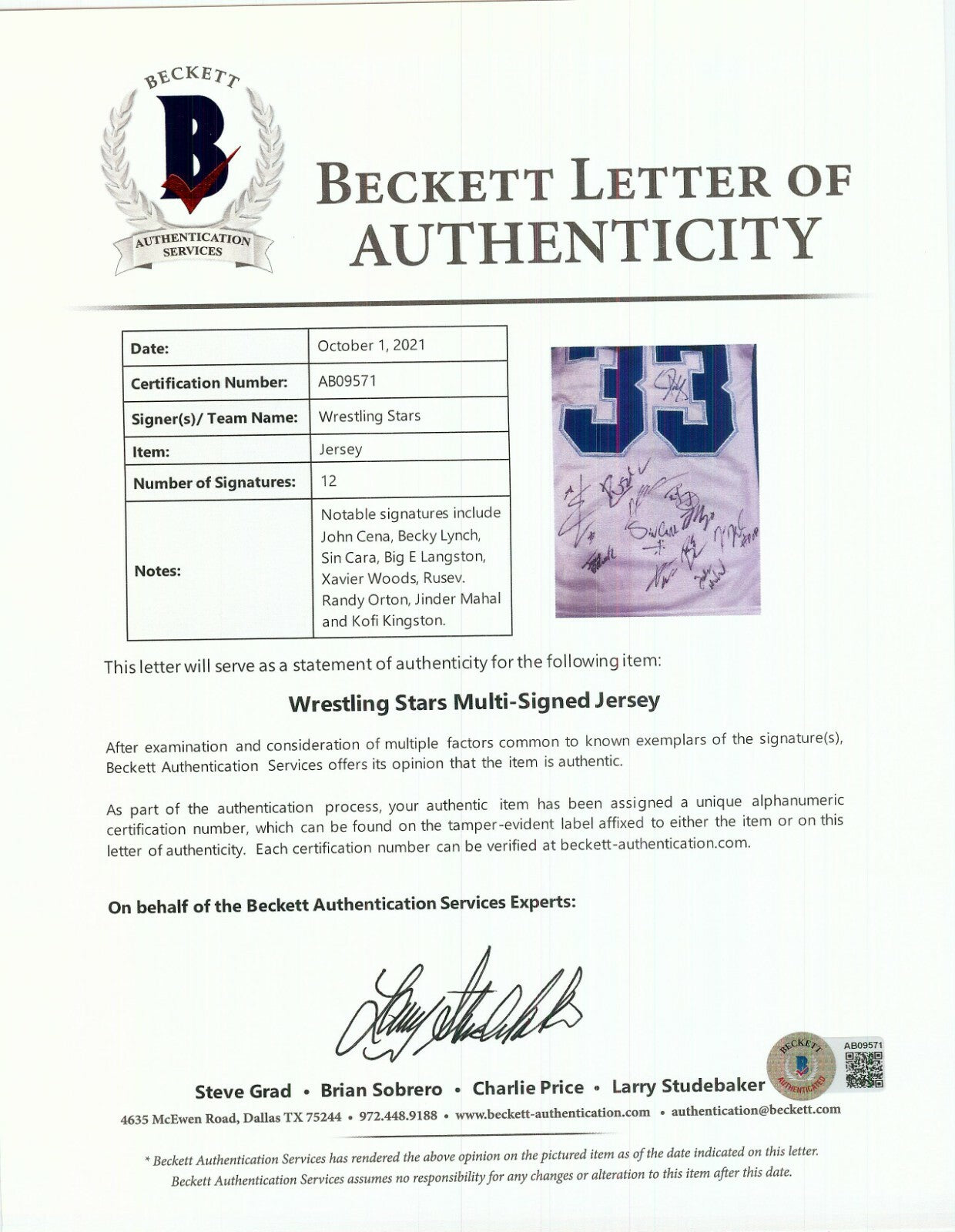 This Wrestlemania 33 football jersey is signed by 12 different notable wrestlers, led by John Cena. Other signatures include: Becky Lynch, Sin Cara, Big E Langston, Xavier Woods, Rusev Day, Randy Orton, Jinder Mahal, Kofi Kingston and more. Full LOA from BAS.
