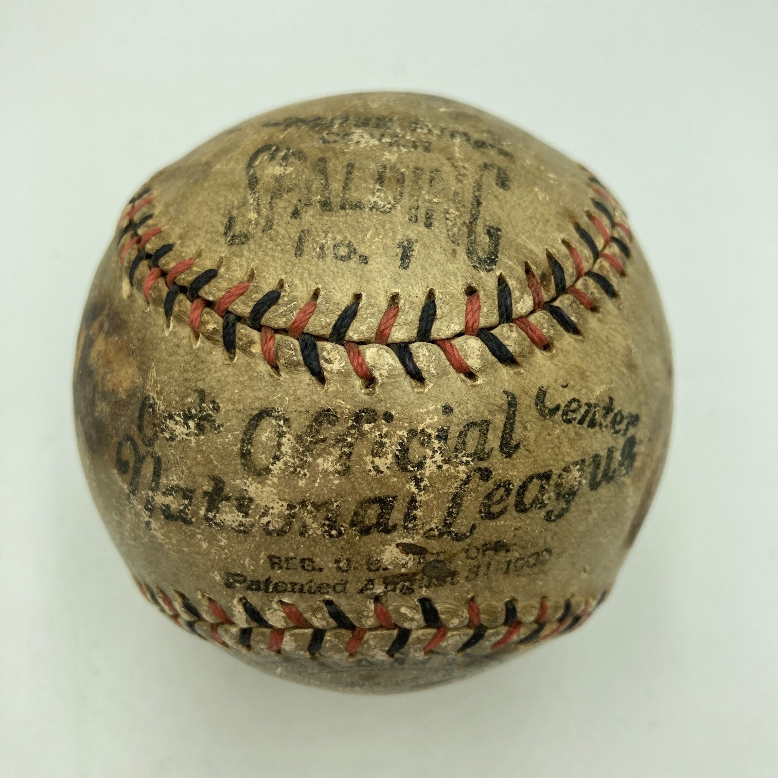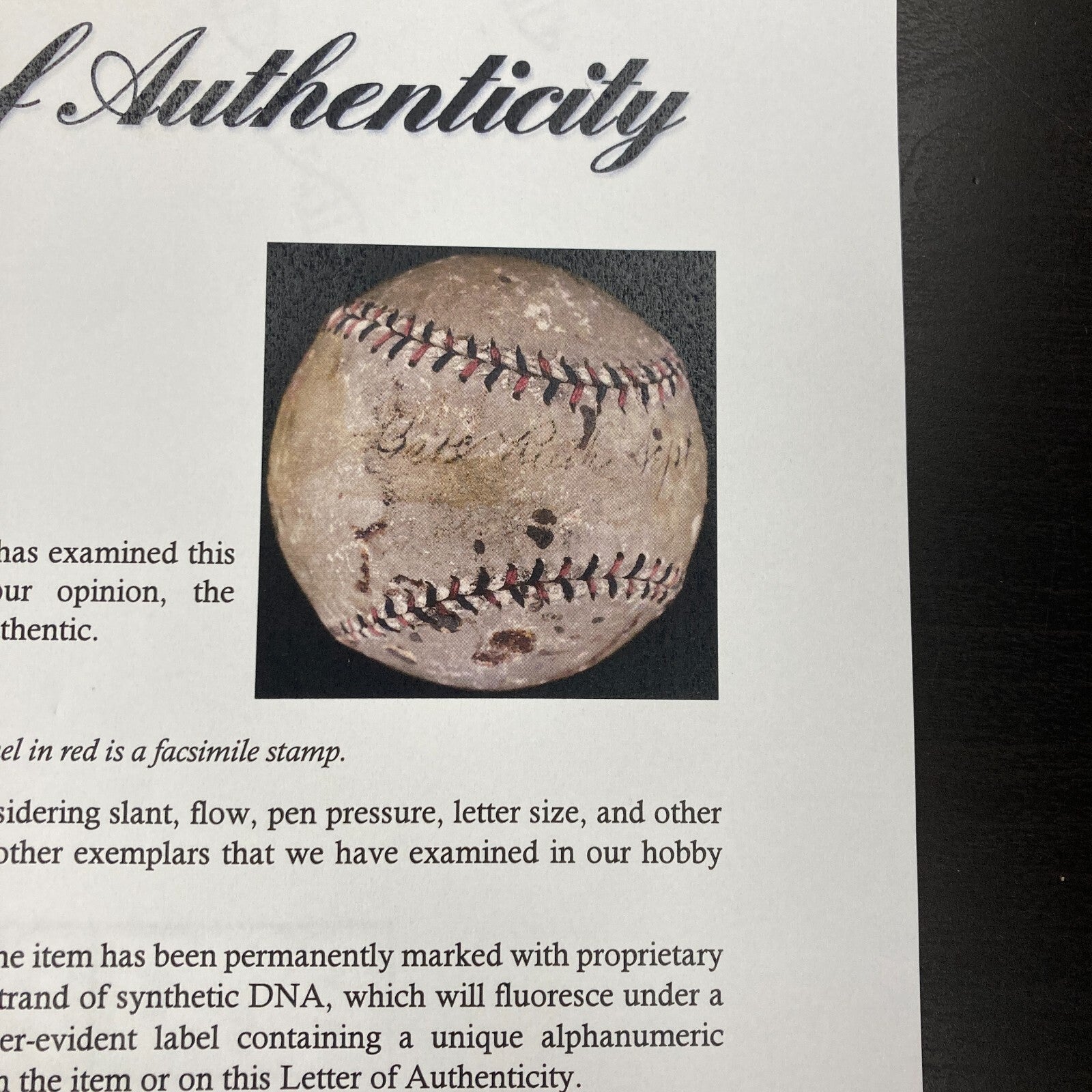 This ball was signed when Ruth was just beginning to don pinstripes. Ruth signed the sweet spot in black fountain pen and also inscribed "Sept. 8, 1920" to the right of his autograph. On September 7, 1920 the Yankees played at home against Philadelphia before heading to Cleveland the next day. Scattered toning/staining appears throughout the toned orb. A quality single from when Ruth transformed the Yankees. Full LOA from PSA/DNA.