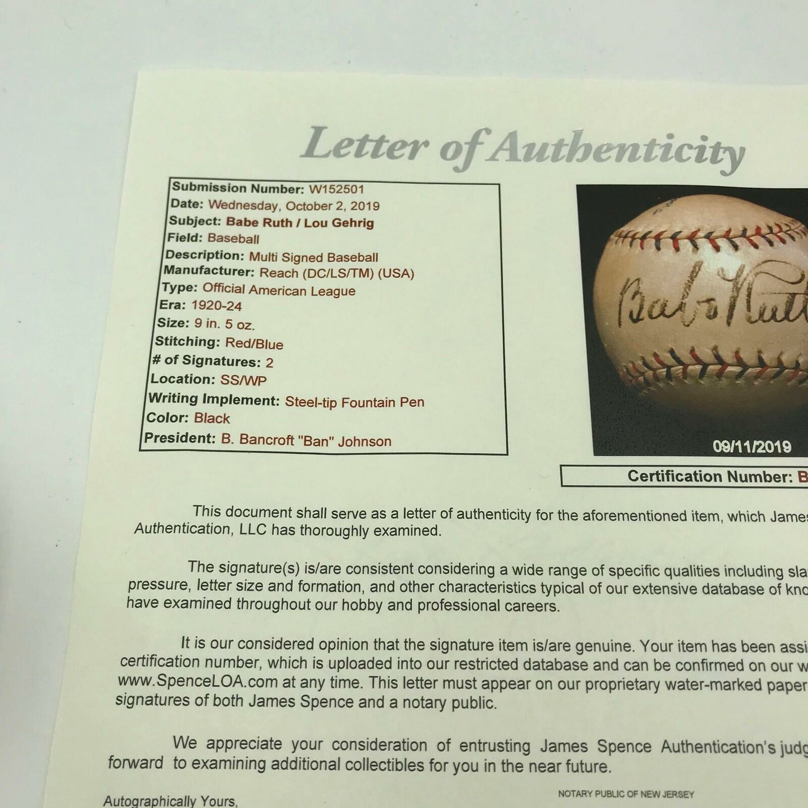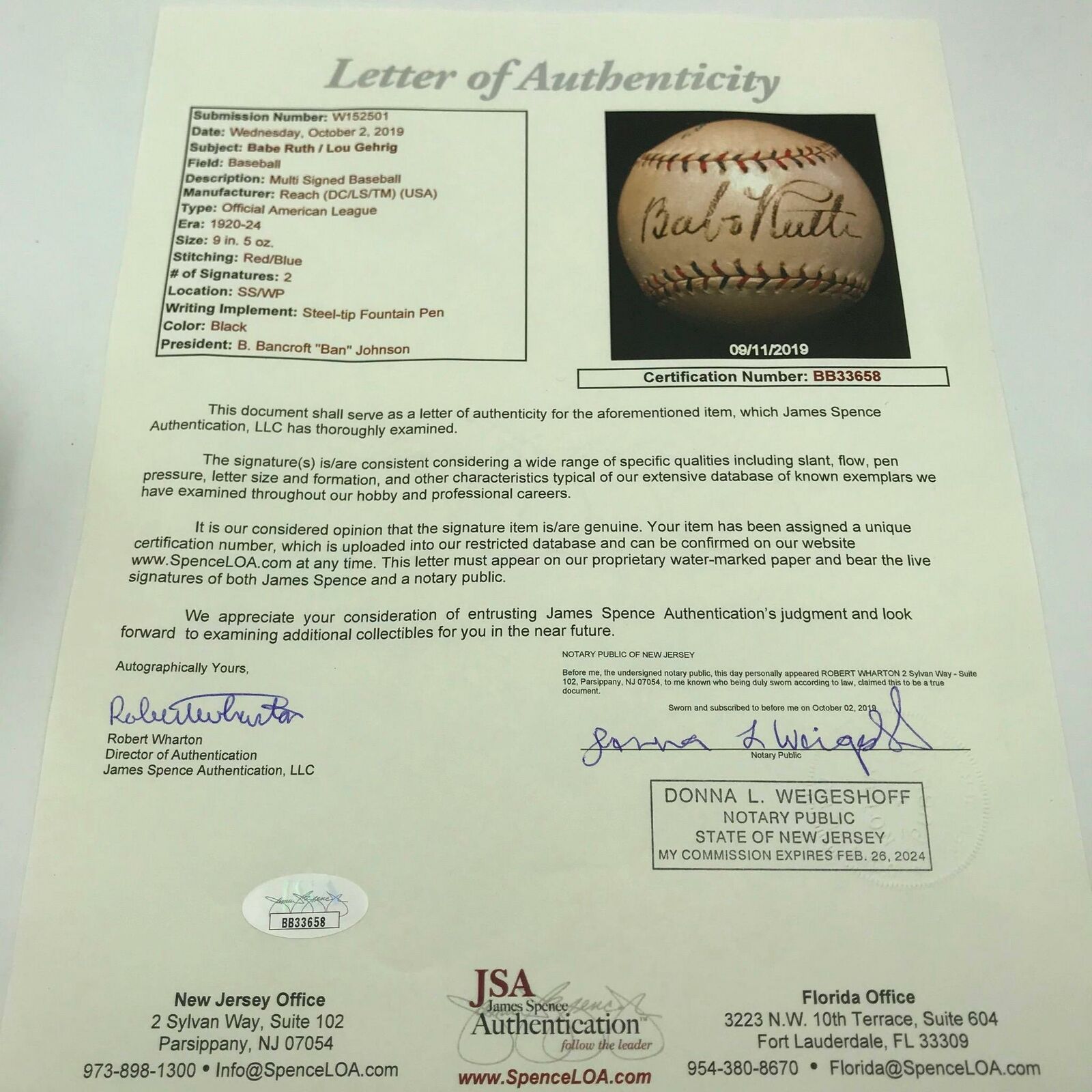 Beautiful Babe Ruth & Lou Gehrig 1923 Rookie Signed Official American League (Ban Johnson) Baseball. This baseball was produced between 1920-24 (Gehrig's Rookie Season Era). Comes with full letter Certificate COA from JSA and baseball cube.