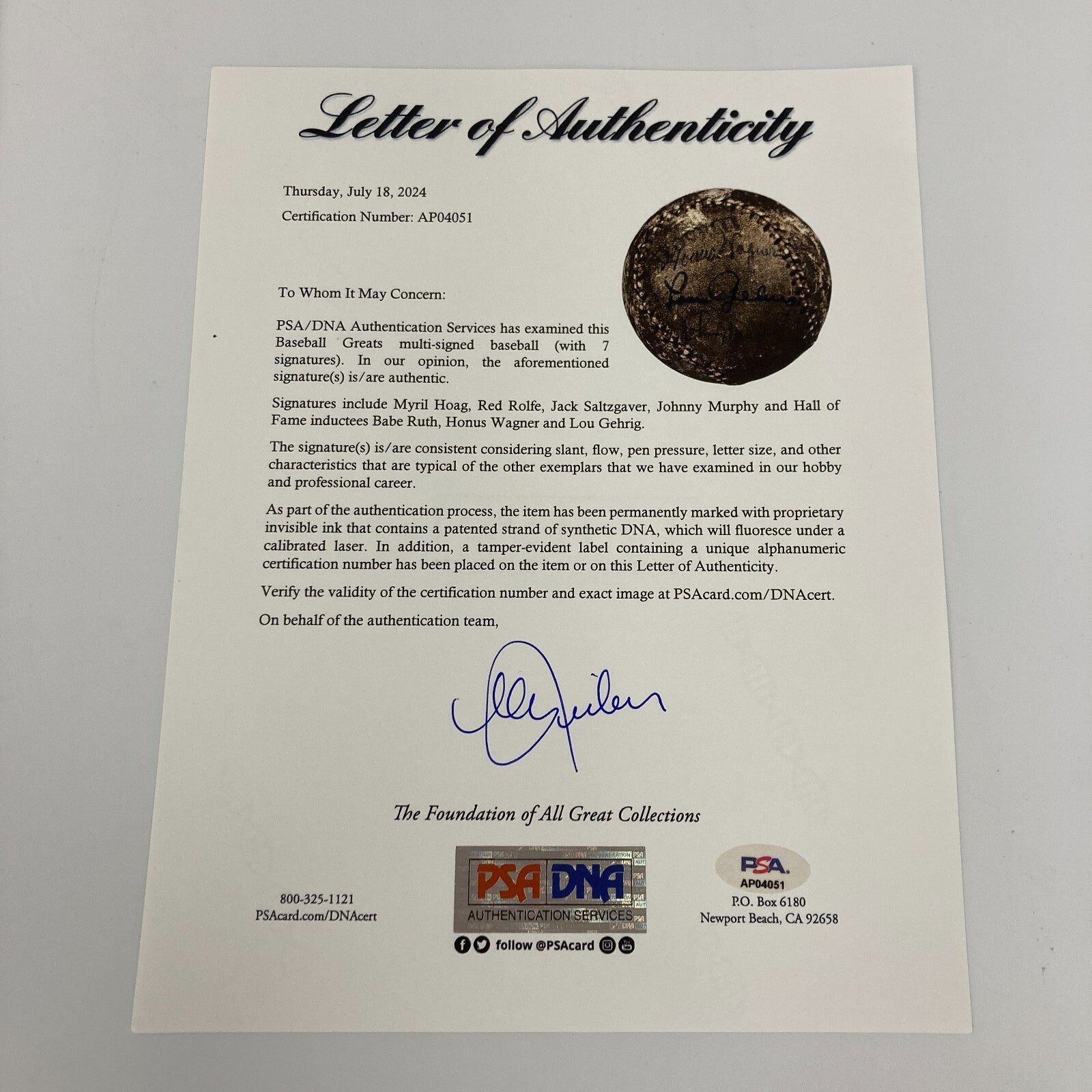 Both appear here, next to each other on the side panel of this Wilson baseball. Also signed by Babe Ruth on his own panel. The sphere is also signed by Red Rolfe, Myril Hoag, Jack Saltzgaver and Johnny Murphy. Full LOA from PSA/DNA.
