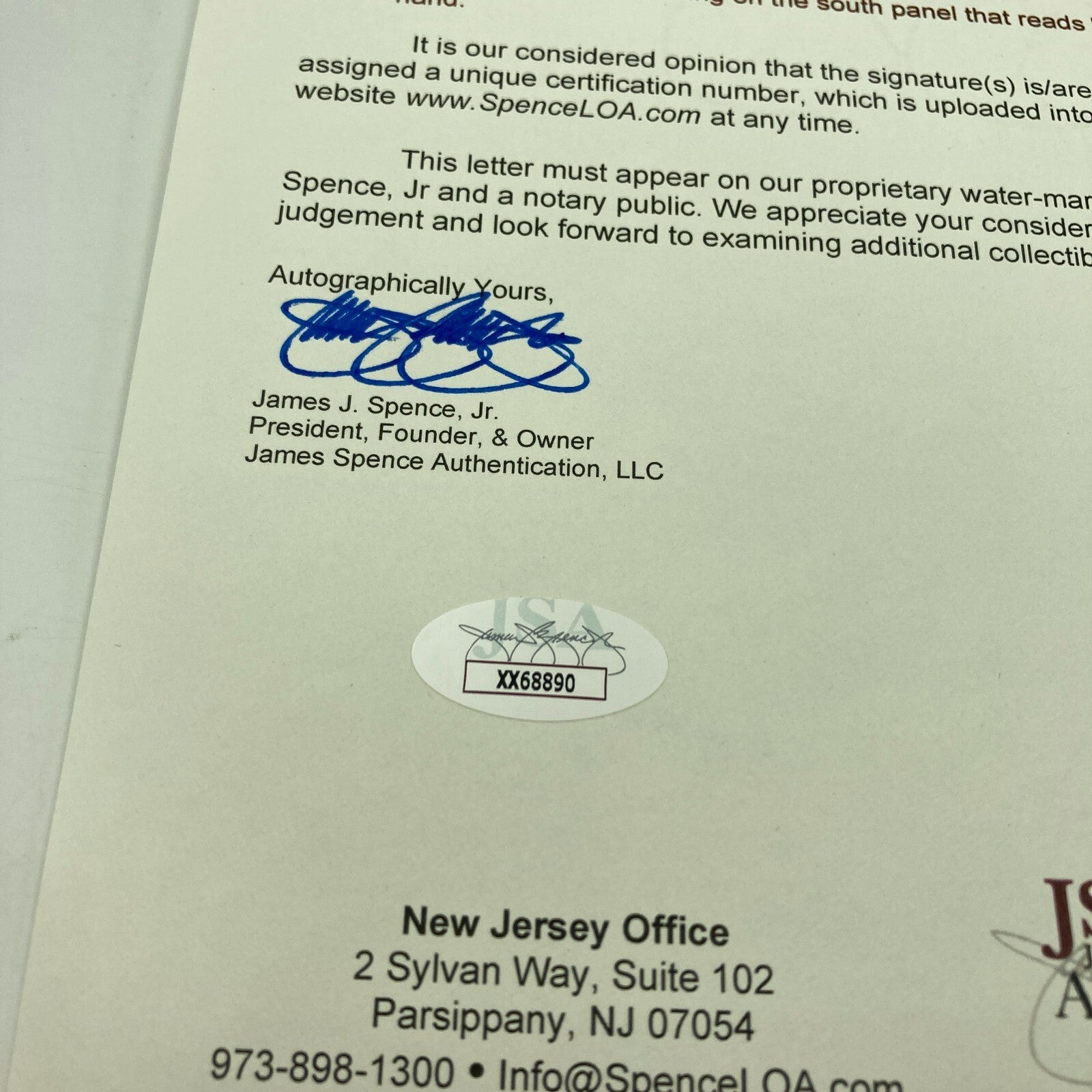 This ball is a Harwood Official National League ball with red and green stitching. Ruth has inked the sweet spot, while Gehrig has signed a side panel and Foxx another panel. Comes with Full letter JSA COA.