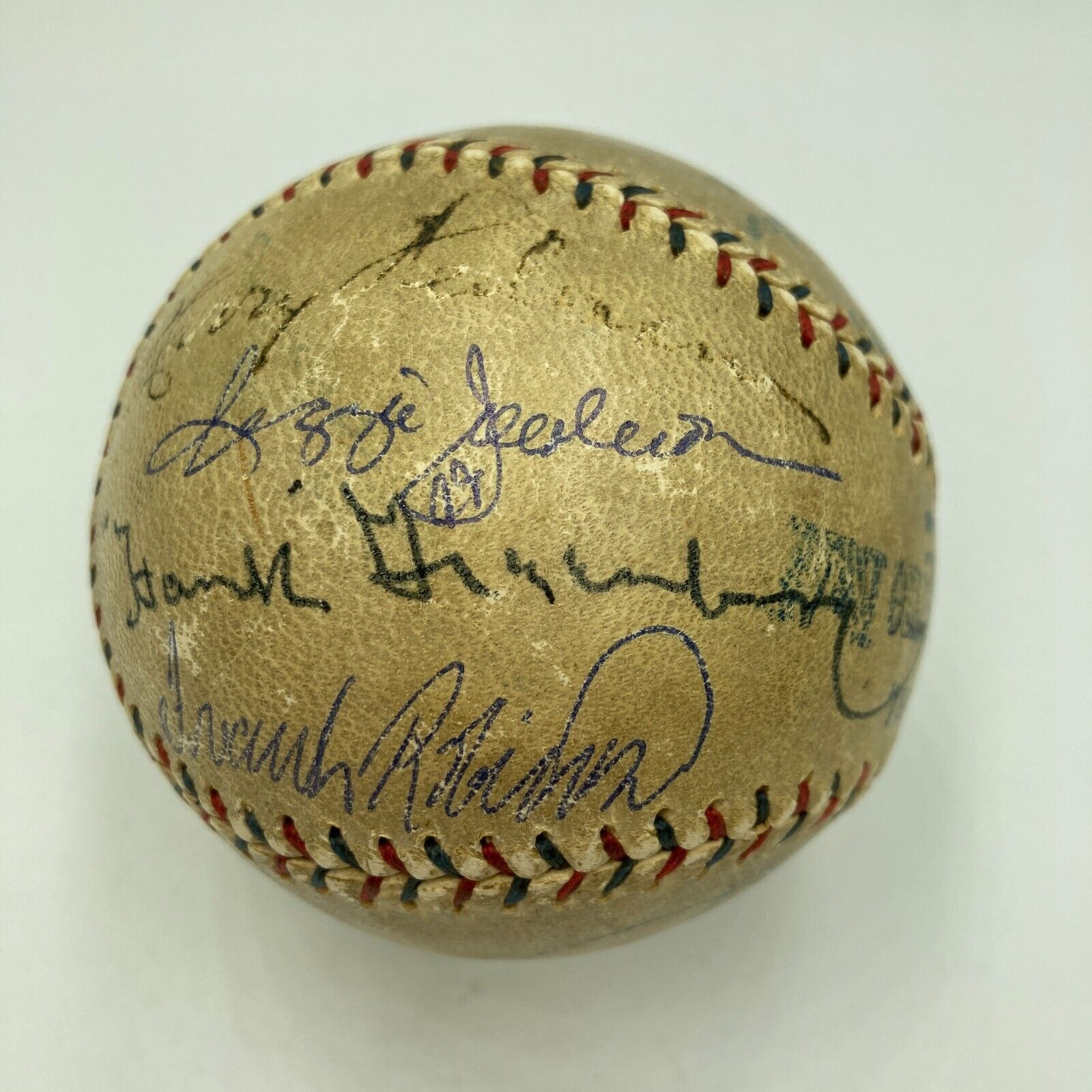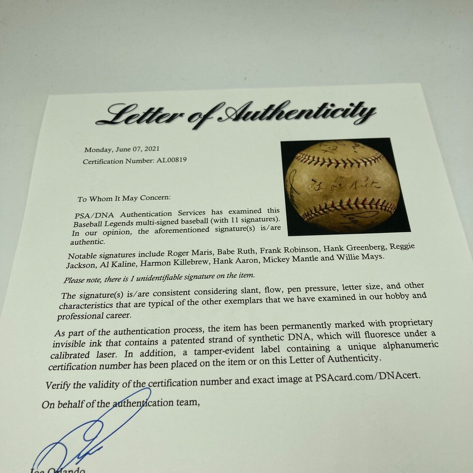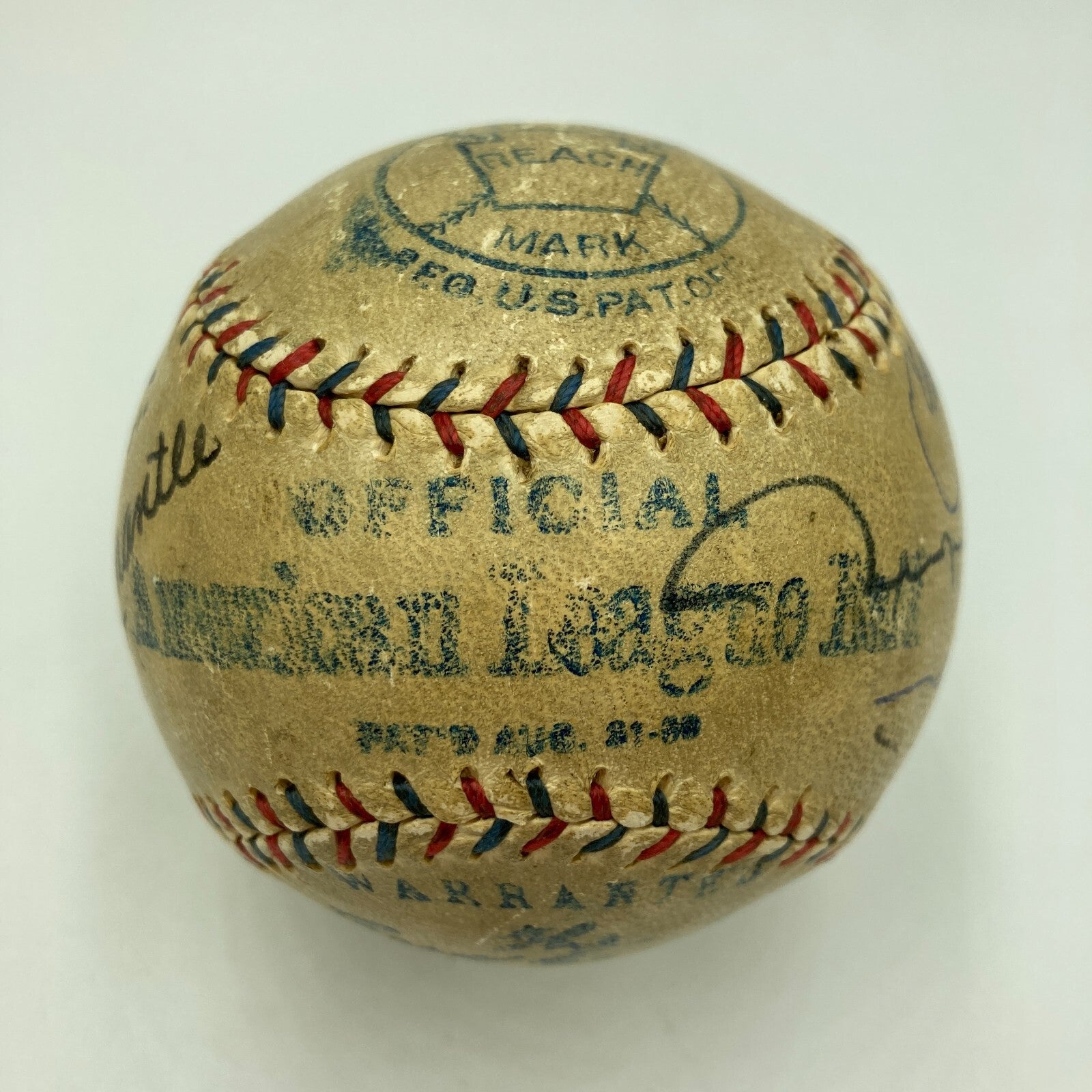 Extraordinary Home Run Kings multi signed baseball. Official American League Baseball from the early 1920's signed on the sweet spot by Babe Ruth. At a later date the owner of the baseball had it signed by Home Run Kings Roger Maris and Hank Aaron. Other signatures on the baseball include Mickey Mantle, Hank Greenberg, Harry Heilmann, Willie Mays, Frank Robinson, Reggie Jackson, Harmon Killebrew and Al Kaline. Most of those signatures are 500 Home Run members. This is one of only a few baseballs known to be signed by Babe Ruth, Roger Maris and Hank Aaron.