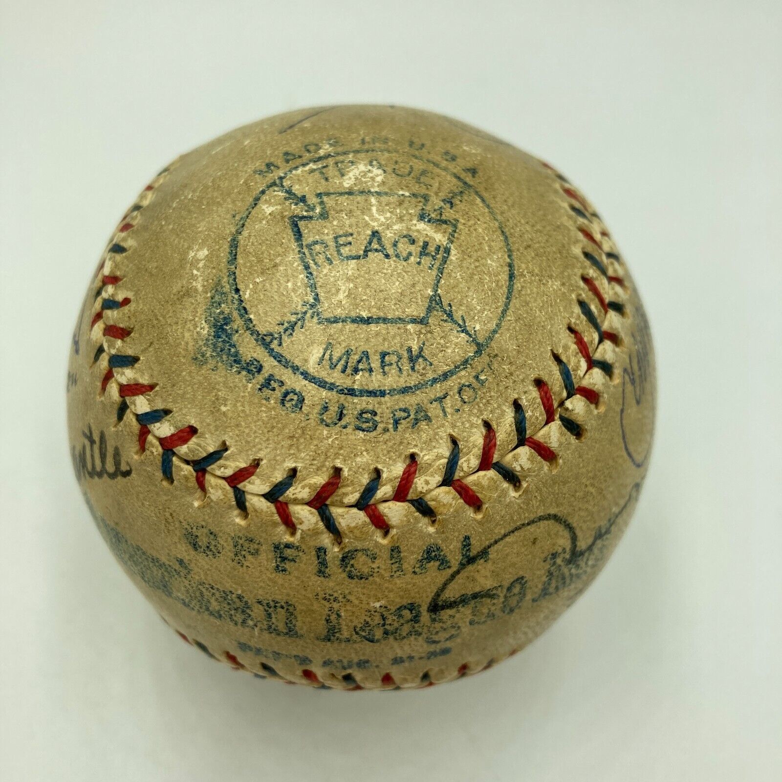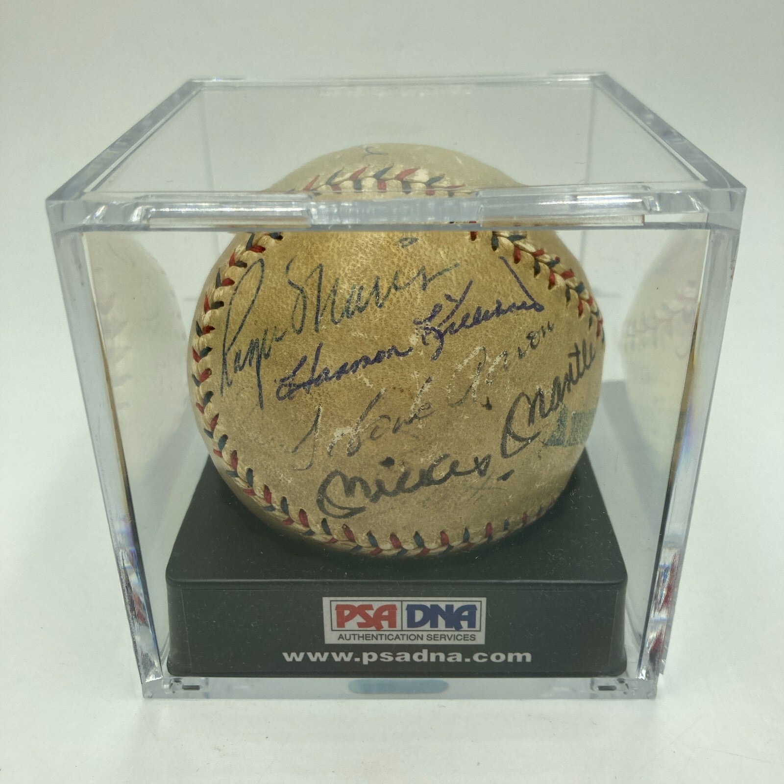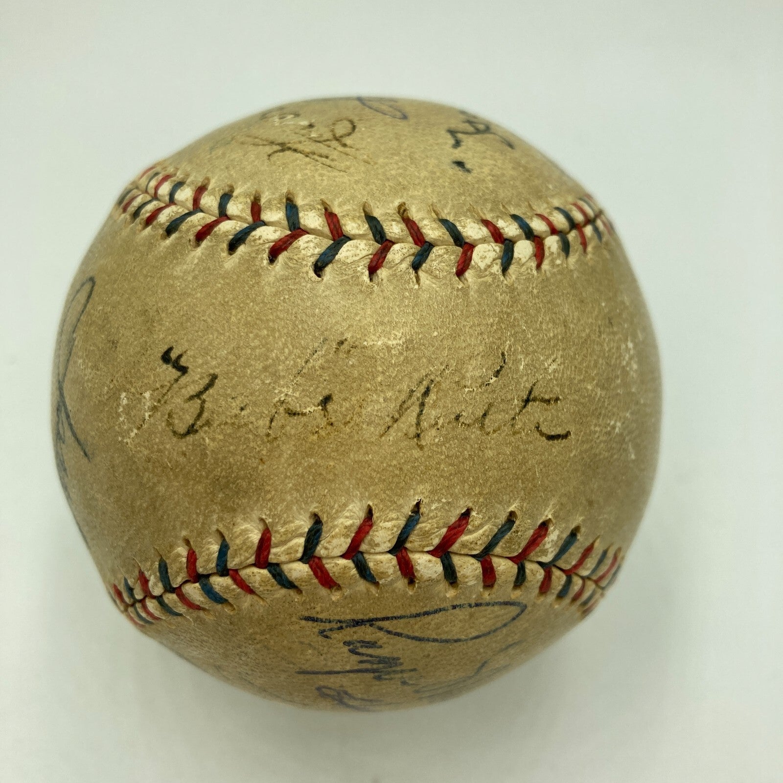 Extraordinary Home Run Kings multi signed baseball. Official American League Baseball from the early 1920's signed on the sweet spot by Babe Ruth. At a later date the owner of the baseball had it signed by Home Run Kings Roger Maris and Hank Aaron. Other signatures on the baseball include Mickey Mantle, Hank Greenberg, Harry Heilmann, Willie Mays, Frank Robinson, Reggie Jackson, Harmon Killebrew and Al Kaline. Most of those signatures are 500 Home Run members. This is one of only a few baseballs known to be signed by Babe Ruth, Roger Maris and Hank Aaron.