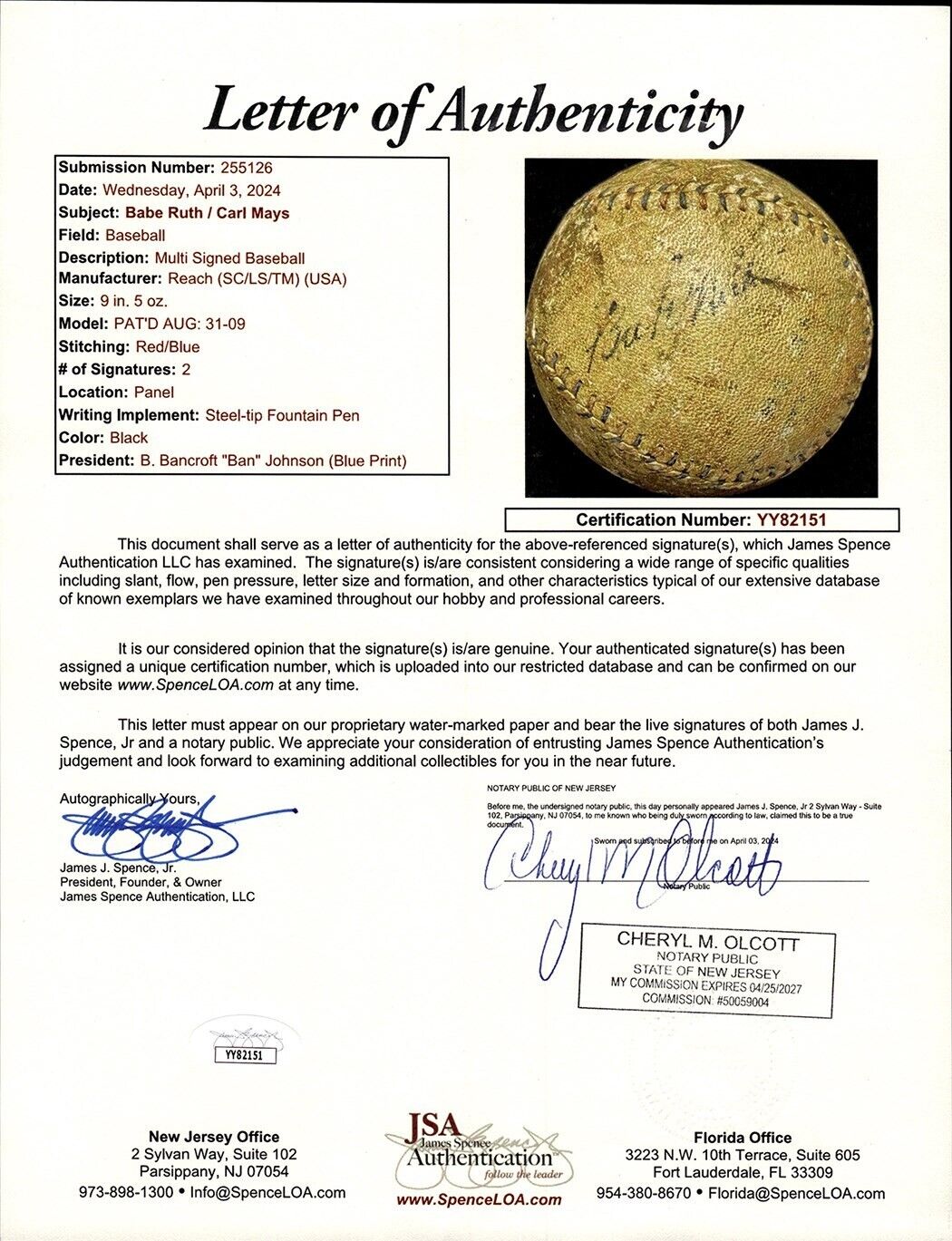 Though they never faced one another, Ruth and Mays were teammates from 1915 through 1919 on the Boston Red Sox, and again from 1920 through 1923 on the New York Yankees. The Yankees sold Mays to Cincinnati in December of 1923. Mays would remain in the National League until his career ended after the 1929 season, Ruth remaining with the Yankees until 1935. The baseball lists Ban Johnson as league president, dating it to pre-1927.