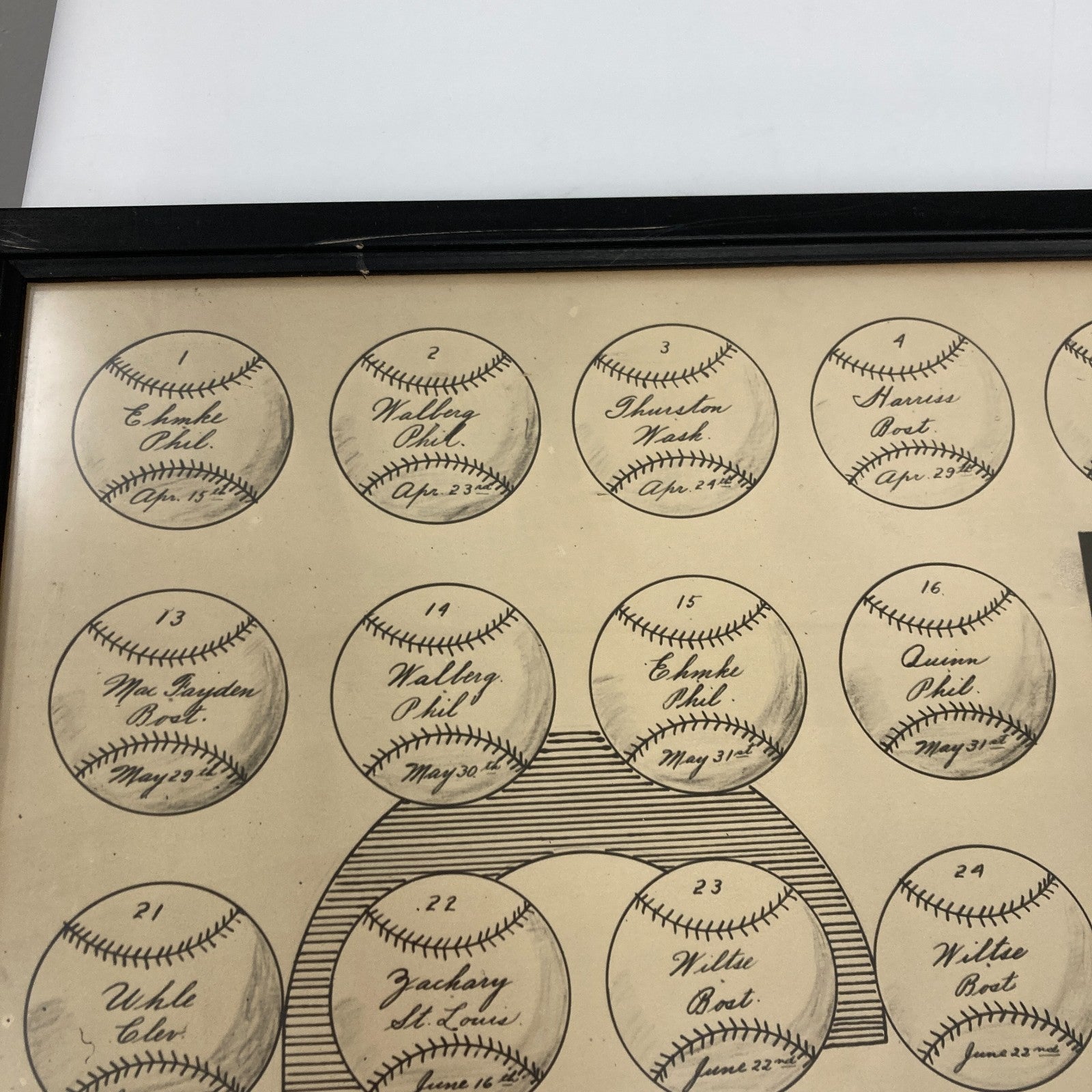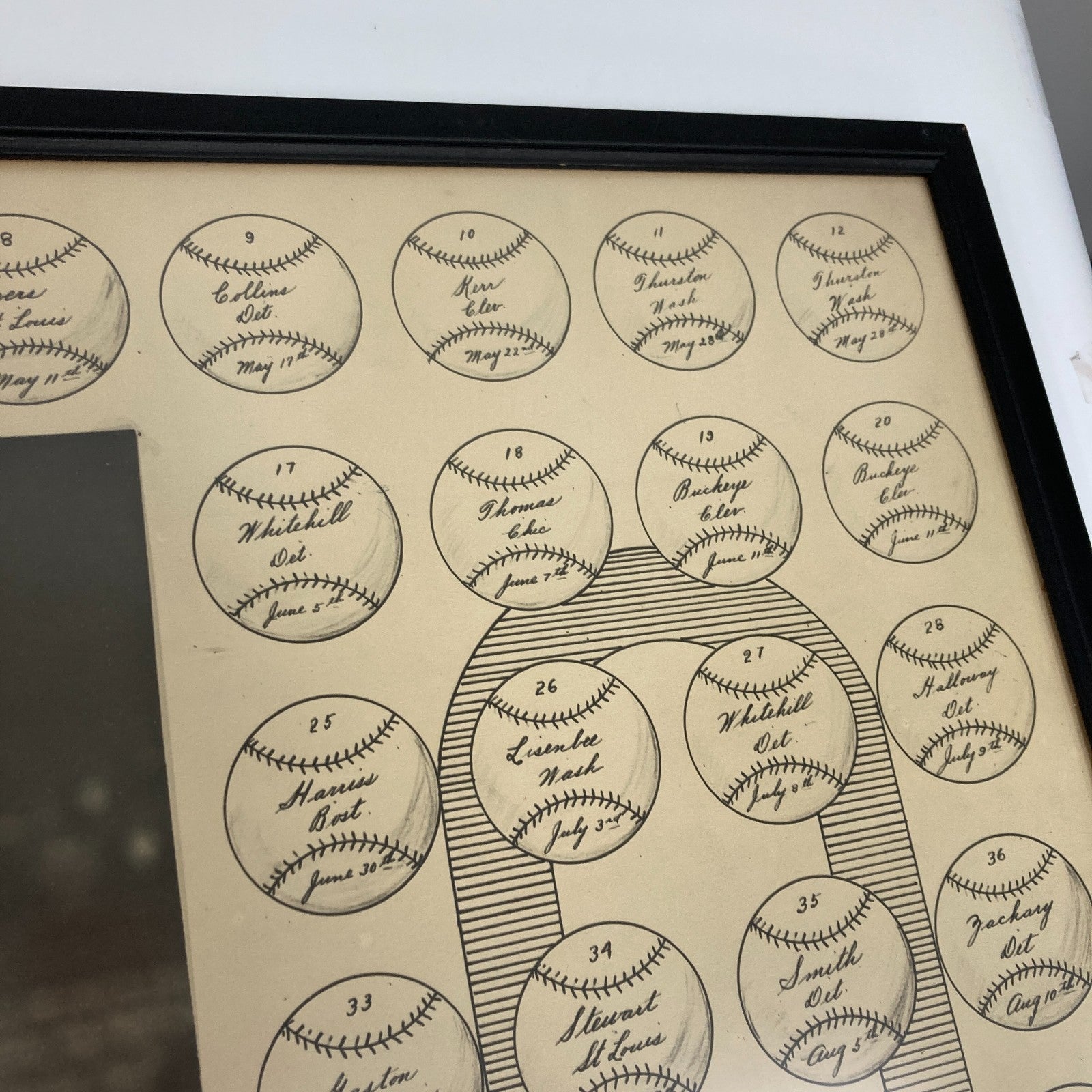 Surrounding the signed image are baseballs detailing each and every 1927 homer—from #1 against Philadelphia A's righty Howard Ehmke on April 15th, all the way through #60 off Washington Senator southpaw Tom Zachary. (Two bonus balls at bottom center denote Fall Classic clouts off Pittsburgh's Mike Cvengros and Carmen Hill in Games 3 and 4, respectively. By our count, Ruth victimized 34 pitchers, among them a pair of 4-timers—Milt Gaston (STL) and Rube Walberg (PHL)—and a couple of Hall of Famers named Lyons and Grove.)