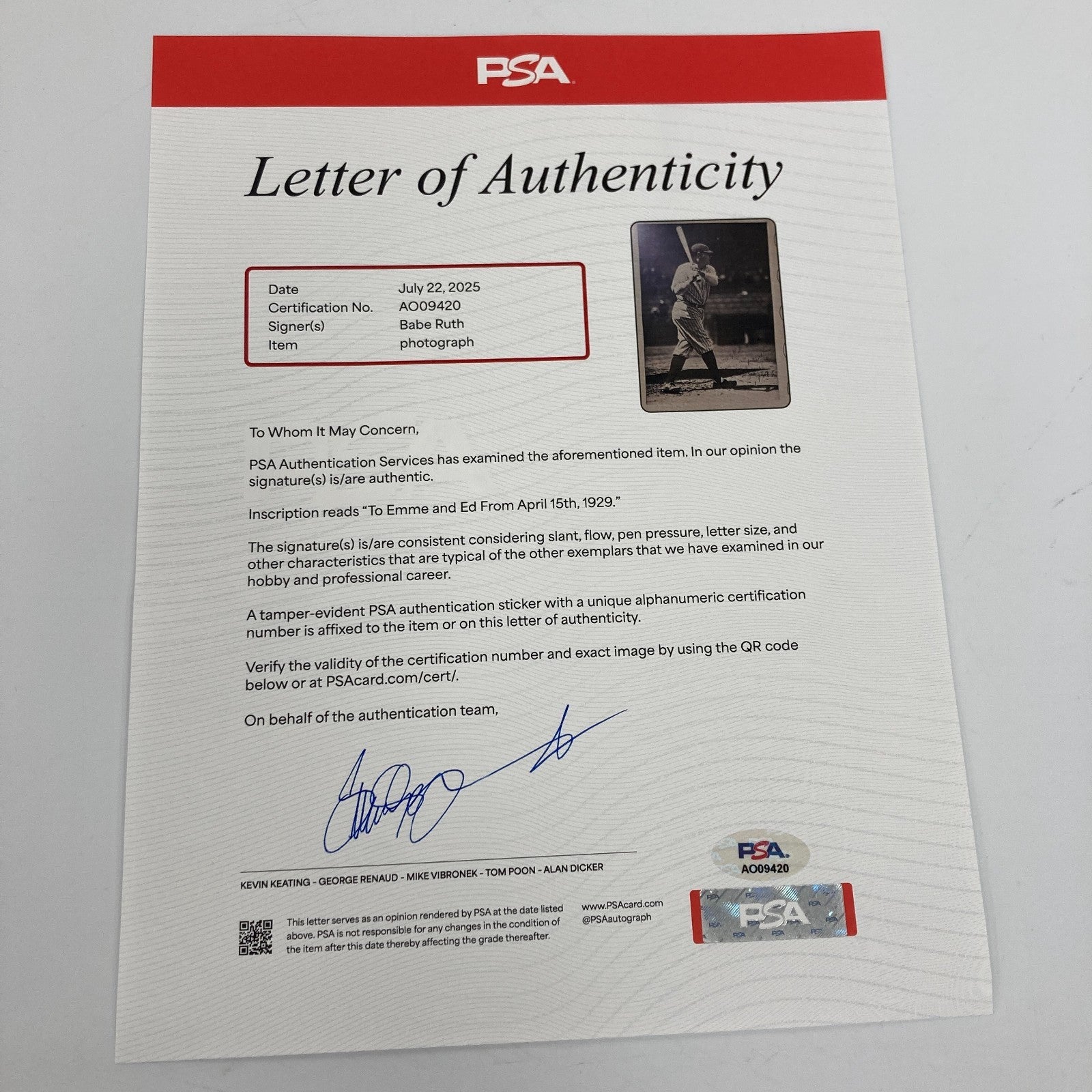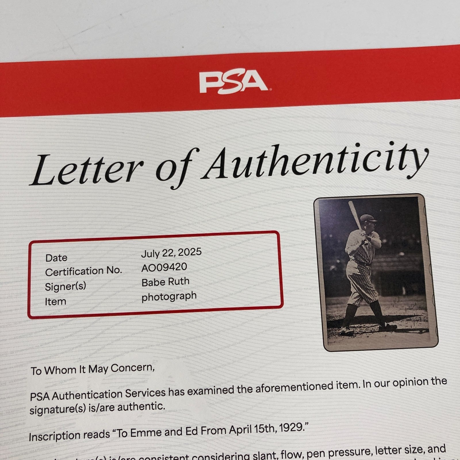 Large format photographic composite offers a sizable image of Babe Ruth with bat in hand and the year (1927) is noted below. "60" Numerals denoting his record setting home run total and it is decorated throughout with a baseball corresponding to each that lists the date it was hit and pitcher who gave it up. These oversized pieces (21"x32" in frame) are among the more desirable related to the great slugger which were issued during this prolific time in his career and the select few which remain generally originate from individuals with whom he shared a close relationship. The offered example has been signed "To Ann + Ed Wells, From Babe Ruth, April 15th 1929." Wells had joined the Yankees in 1929 and was assigned the locker in between Ruth and Lou Gehrig. He would play alongside the legendary duo until 1932.