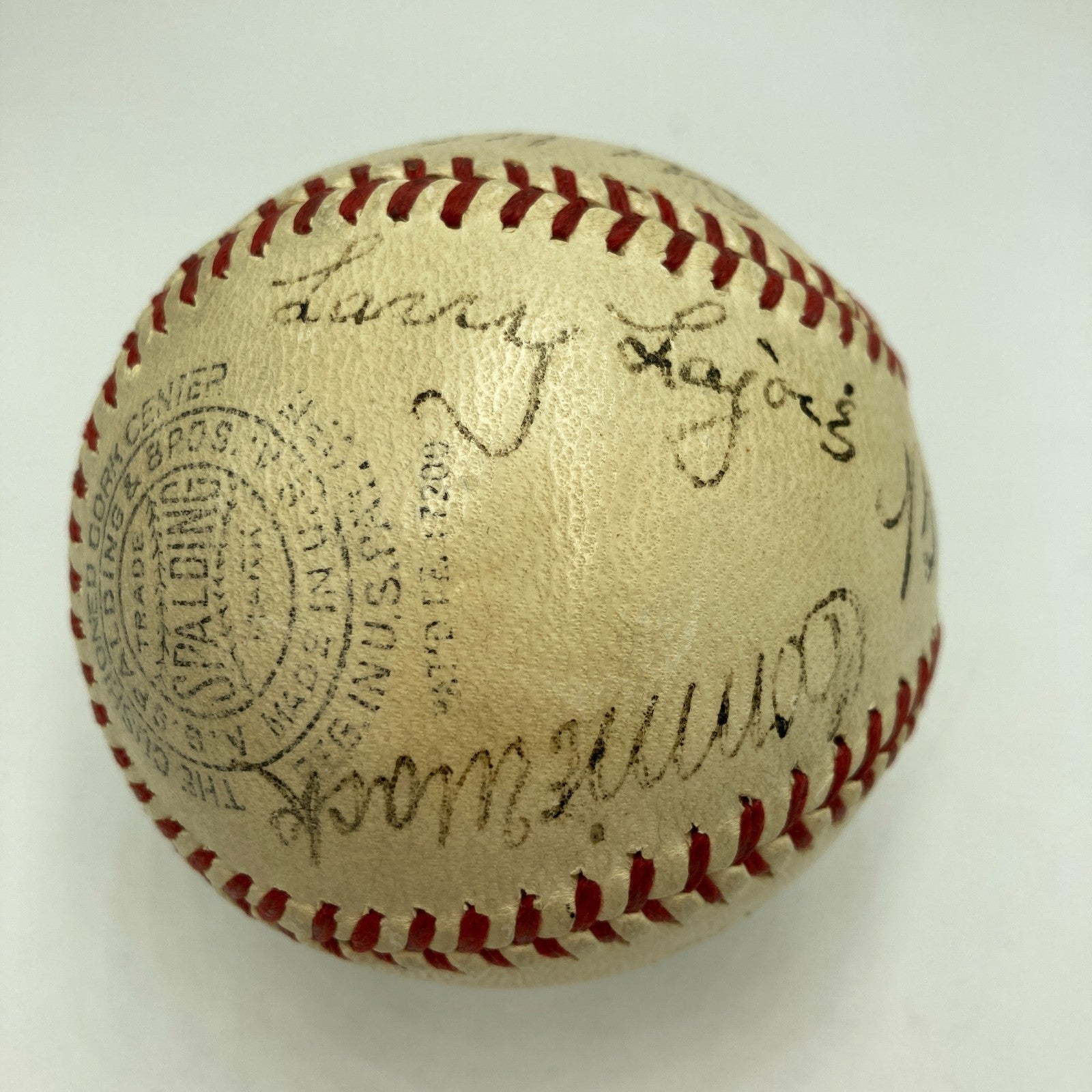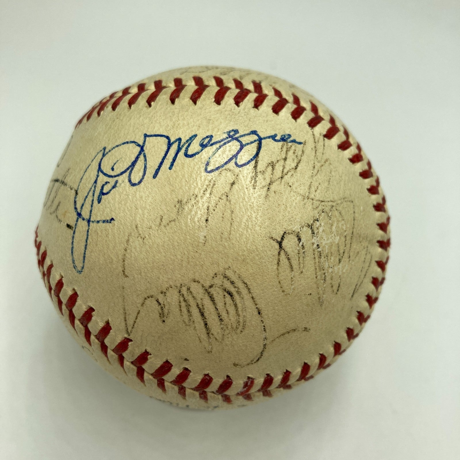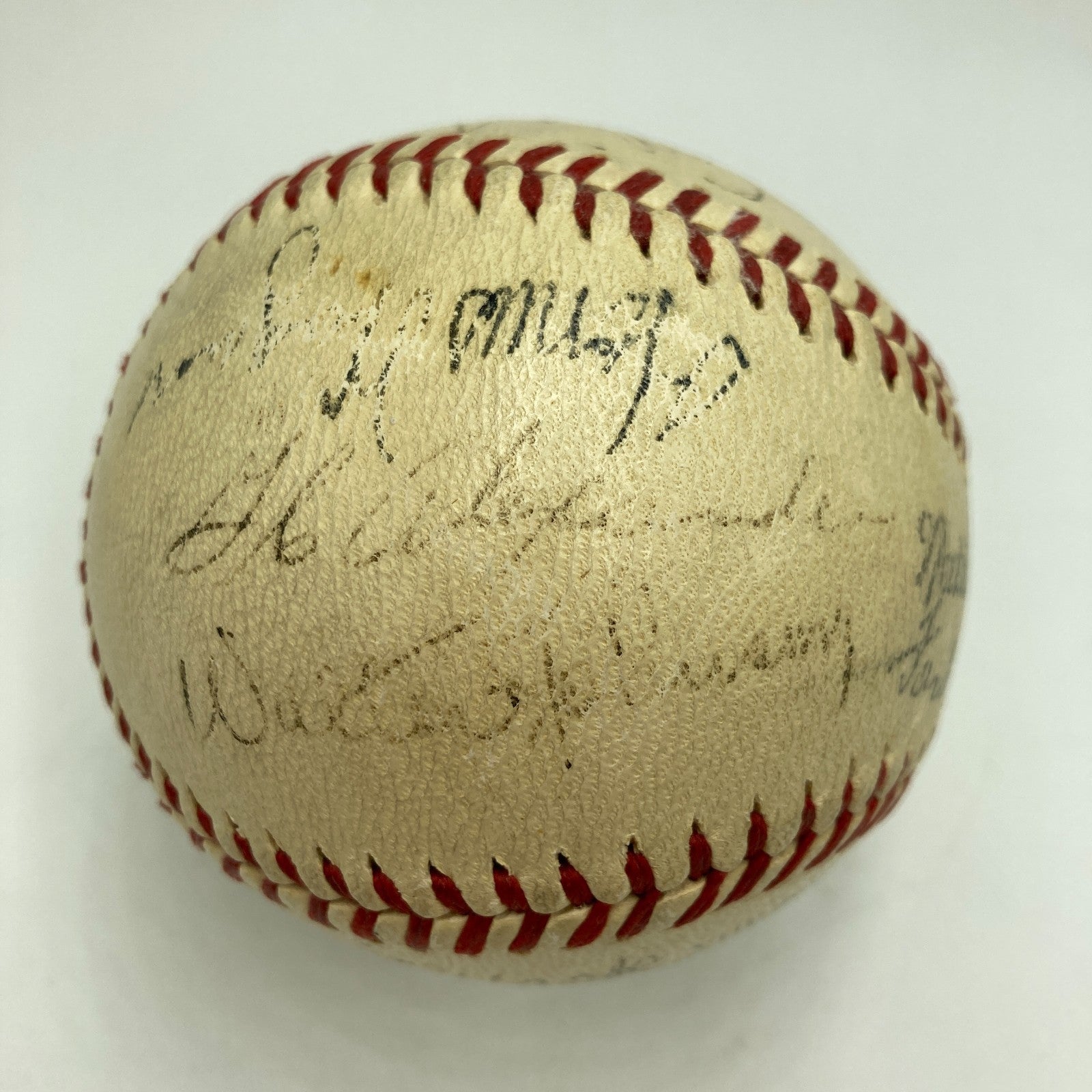 A dozen legends of the pre-war game were honored as the inaugural class, and only two of them are absent from the presented 1939 Official National League (Ford Frick) baseball--the deceased Christy Mathewson and Tris Speaker. The balance of that esteemed brotherhood is present: Babe Ruth, Connie Mack, Napoleon "Larry" Lajoie, Eddie Collins, Cy Young, Ty Cobb, George Sisler, Honus Wagner, Grover Cleveland Alexander and Walter Johnson. Joining that cast of characters are three participants in the Hall Of Fame Doubleday Field contest that would likewise find their way into the hallowed halls of Cooperstown: Joe DiMaggio, Lefty Grove and Dizzy Dean.