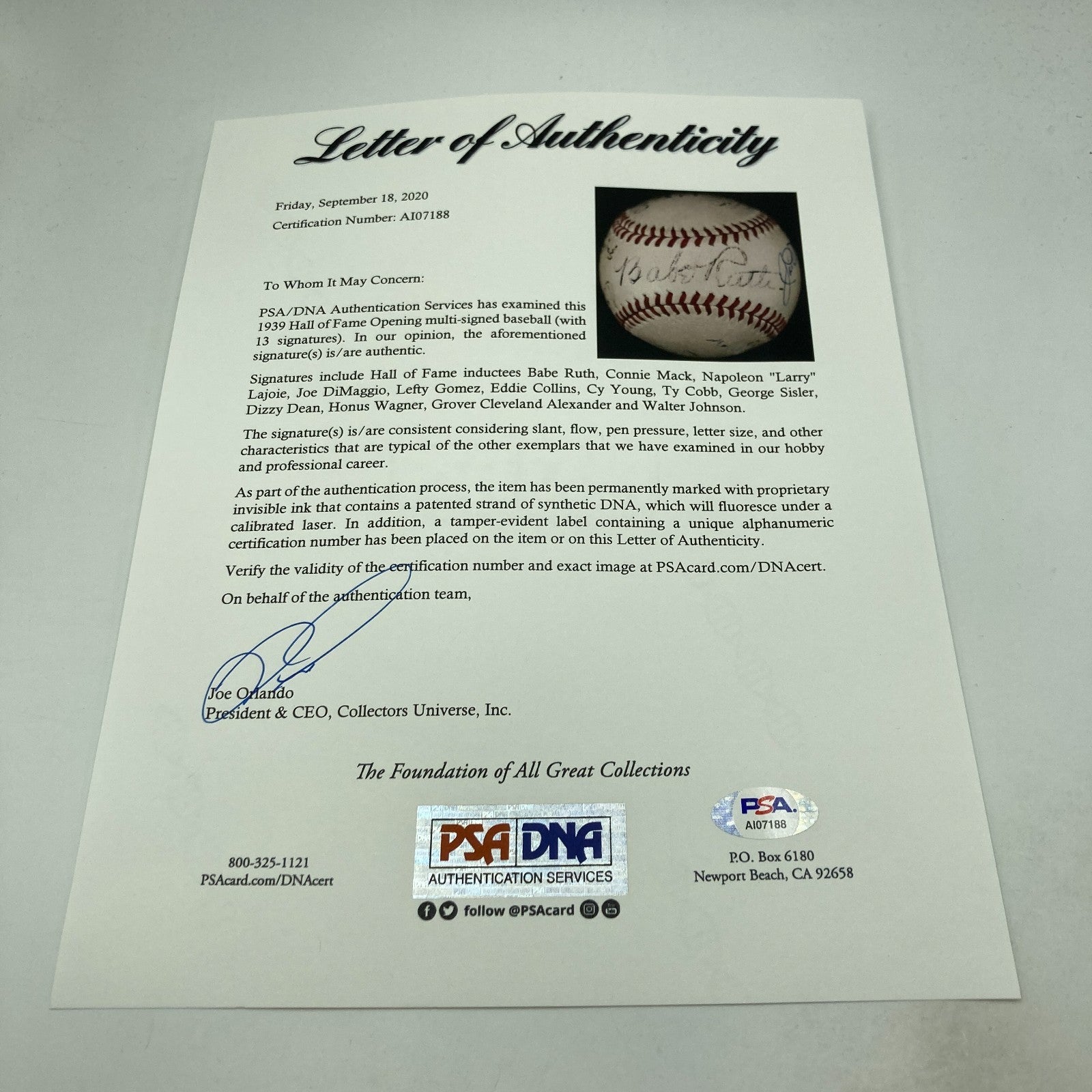 A spectacularly rare and desirable relic from one of the most important events in 20th century baseball history. Full LOA from PSA/DNA.