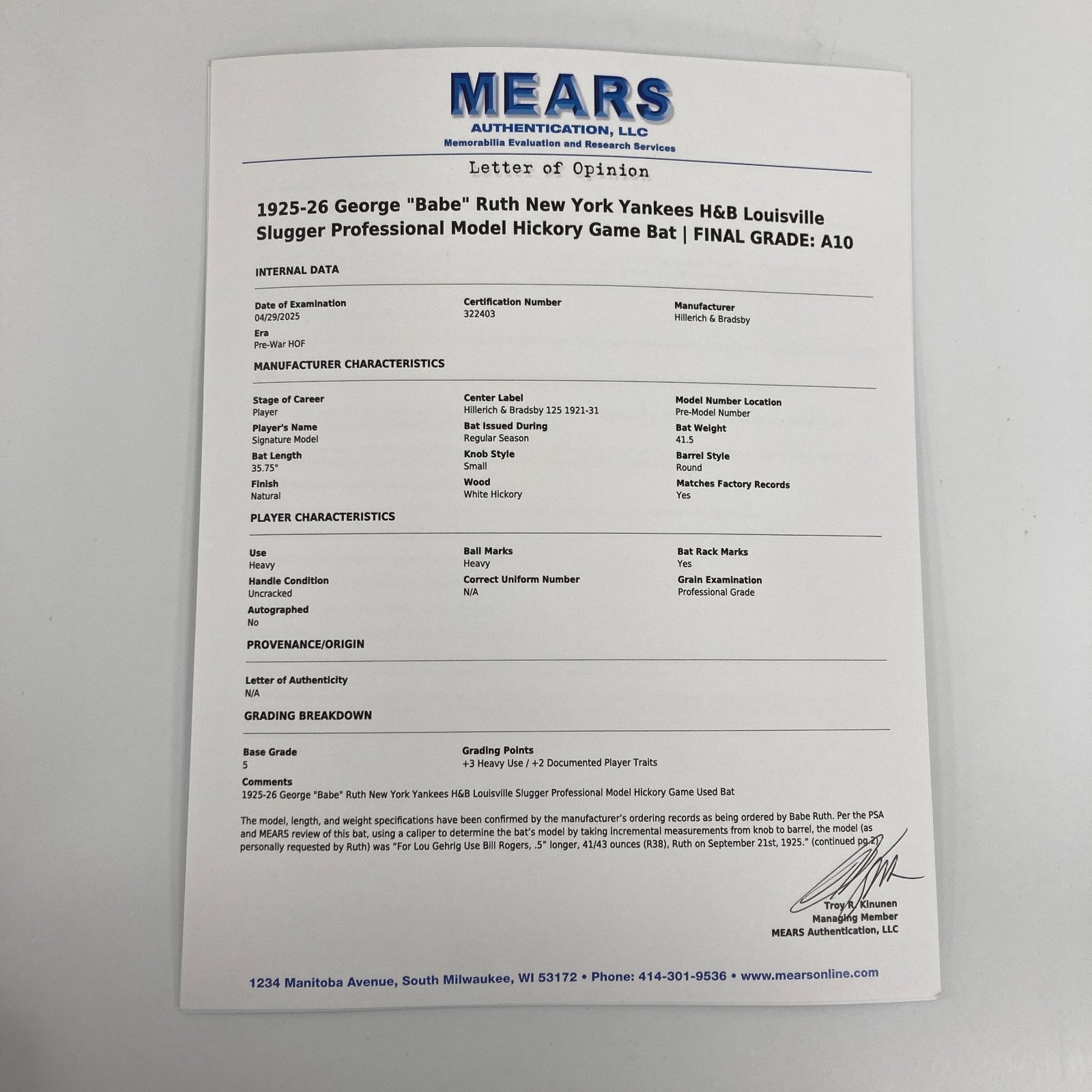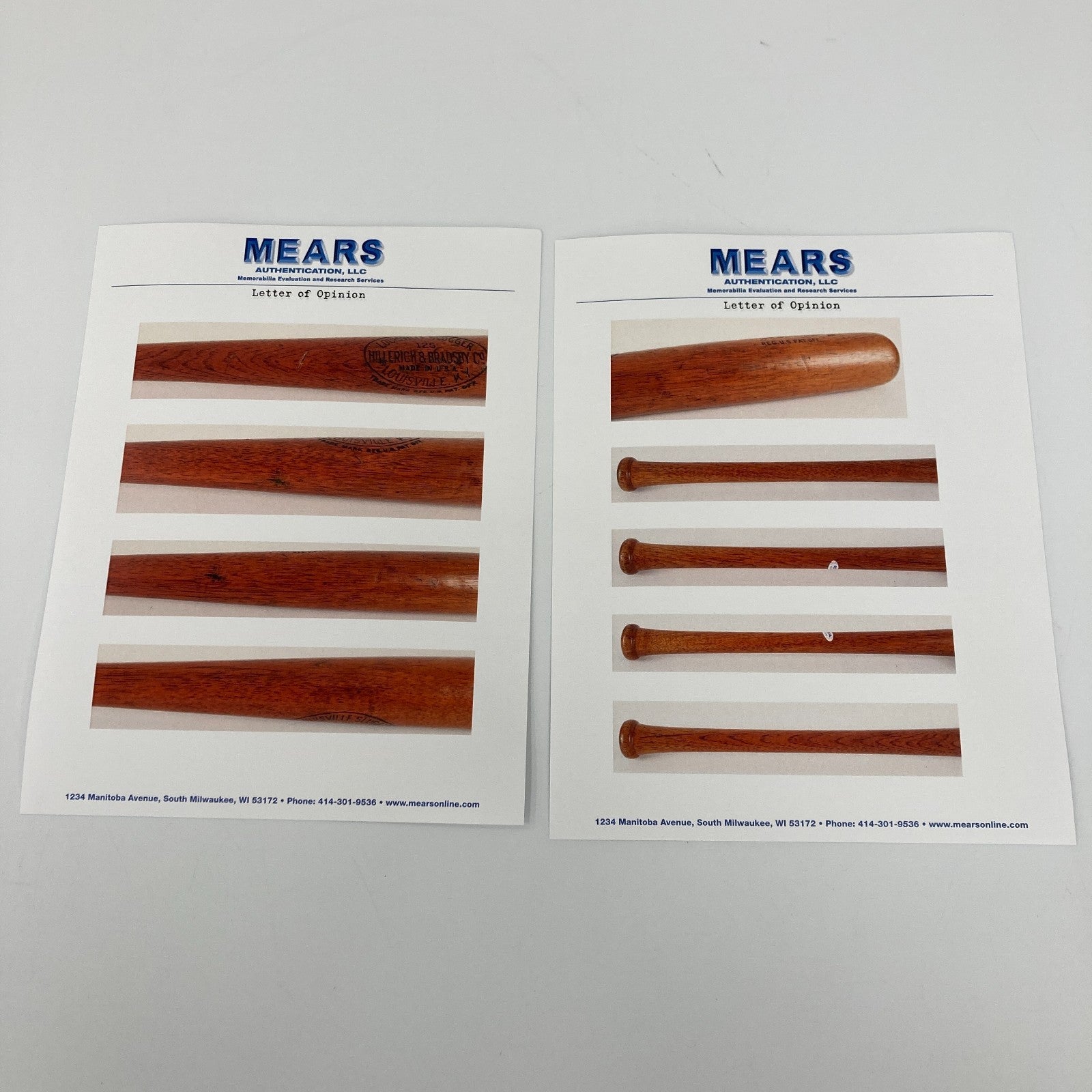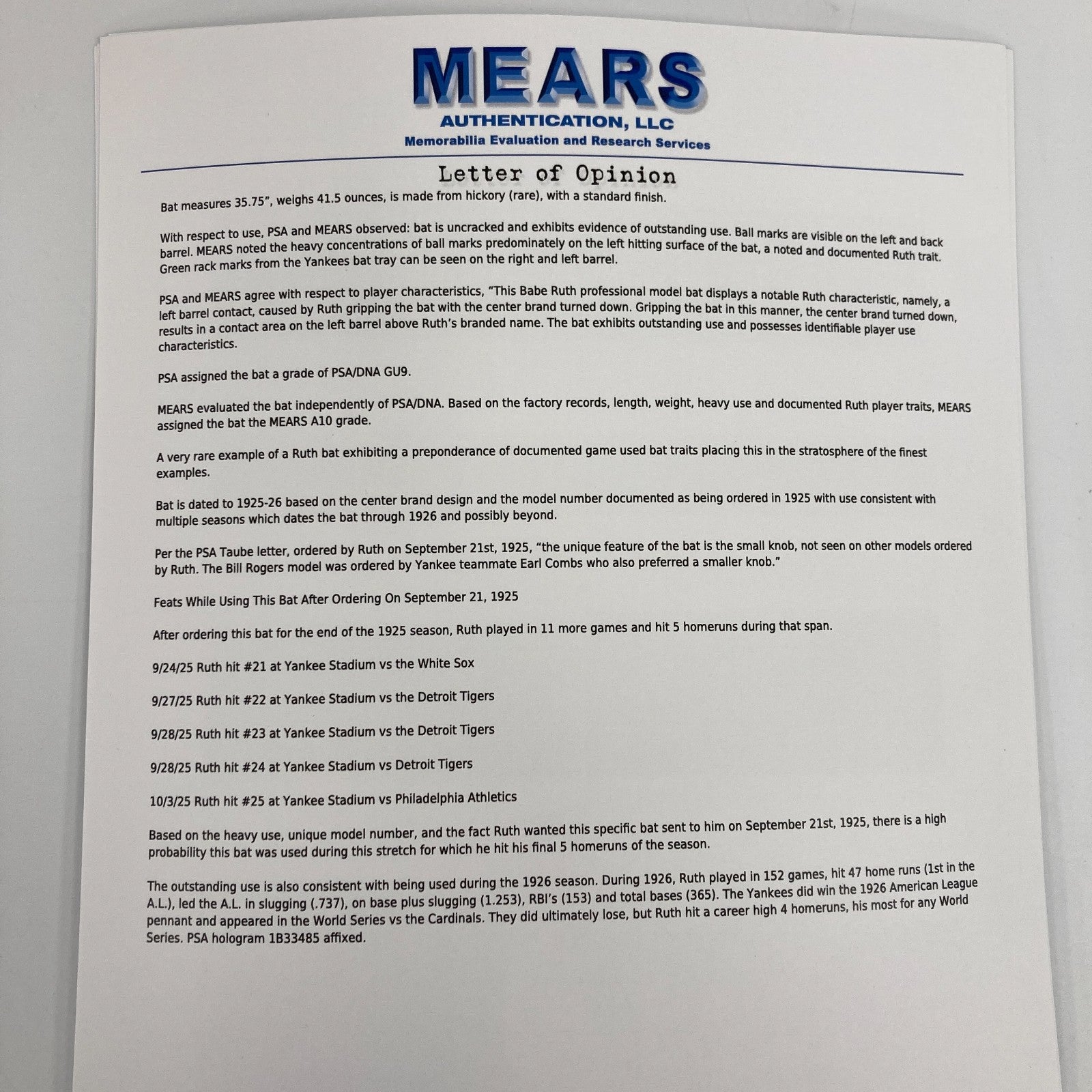 MEARS evaluated the bat independent of PSA/DNA. Based on the factory records, length, weight, heavy use and documented Ruth player traits, MEARS assigned the bat the MEARS A10 grade.