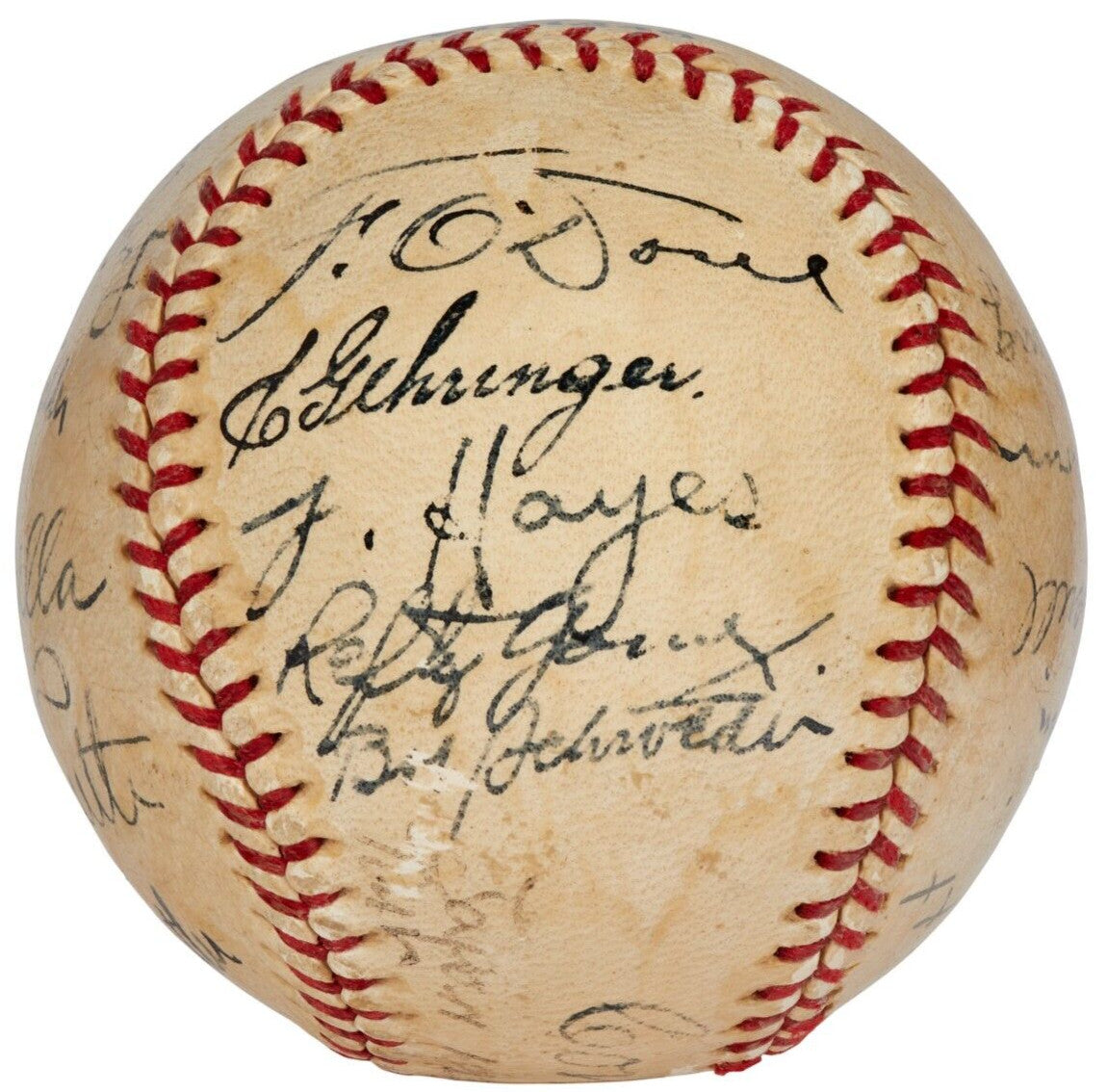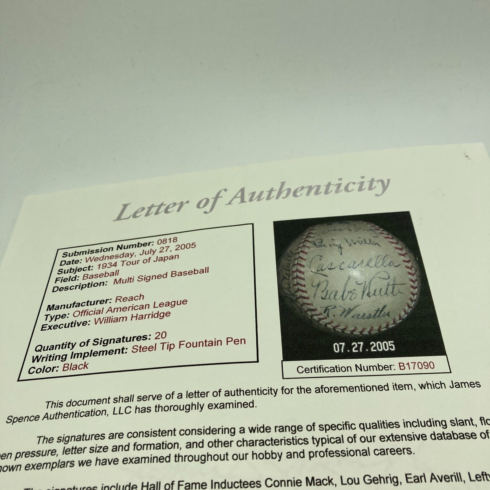William Harridge Official American League baseball signed by (20) members of the U.S. Tour of Japan All-Star team. Signatures include Babe Ruth, Lou Gehrig, Jimmie Foxx, Connie Mack, Lefty Gomez, Charlie Gehringer (twice) Earl Averill, and Moe Berg who also was serving the U.S. intelligence agency gathering information while on tour. The Tour was a resounding success drawing thousands of Japanese fans into the streets to witness the American players and most certainly the greatest of which was Babe Ruth. Although the Americans dominated the exhibition series winning the vast majority of the games, the Tour was deemed a wonderful success for the Japanese who showcased their talents against the best in the world. Additionally, the political tensions between the United States and Japan were certainly eased in part due to the success of the Tour. Upon his return, manager Connie Mack proclaimed at the New York Sportswriters Dinner "that there would be no war between the United States and Japan." Of course, history would dictate another fate than the one Mack believed. Very fine example of this highly coveted team signature baseball. Includes full LOA from PSA/DNA and full LOA from JSA.