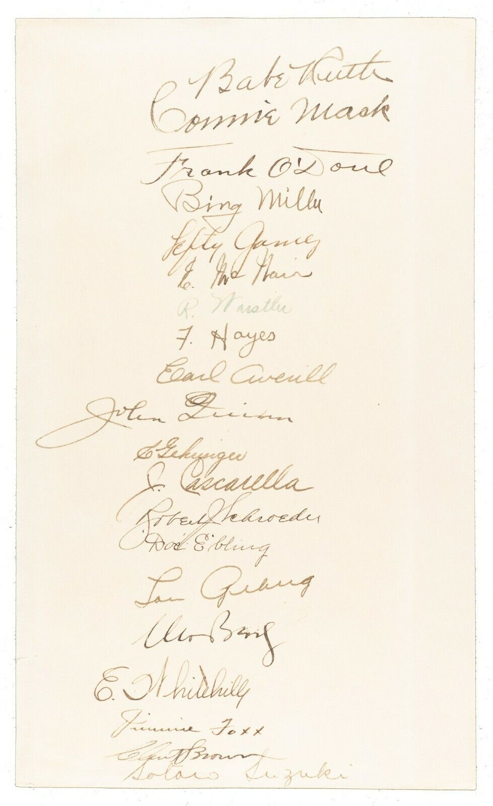 This magnificent, large-format team-signed sheet features the signatures of all twenty members of the 1934 Tour of Japan, including legendary Hall of Famers Babe Ruth and Lou Gehrig. The sheet is signed in black fountain pen by the following team members: Babe Ruth, Lou Gehrig, Jimmie Foxx, Connie Mack (Mgr.). Lefty Gomez, Earl Averill, Charlie Gehringer, Lefty O'Doul, Bing Miller, Eric McNair, Rabbit Warstler (green ink), Frank Hayes, John Quinn, Joe Cascarella, Robert Schroeder (Philadelphia A's secretary), Doc Ebling (trainer), Moe Berg, Earl Whitehill, Clint Brown, and Sotaro Suzuki (interpreter). Signatures are bold and in beautiful condition. The 1934 tour of Japan by Connie Mack's "All-American" team is considered by many to be the most famous overseas baseball tour in history. The reason is twofold. This was the only overseas tour of Babe Ruth's career, and his popularity, even in Japan, was so great that he was treated like royalty by the Japanese people. The second, lesser-known reason had to do with the fact that Moe Berg was on the team. Berg was a journeyman catcher of little note, and his inclusion on the roster was not by Mack's choosing but rather by that of the United States government. Unbeknownst to everyone at the time, Berg, a Princeton graduate who spoke seven languages, was living a dual life. On the surface he was a professional ballplayer. His other career was that of an undercover spy for the U. S. government. Intelligence officials saw the 1934 baseball tour as an ideal opportunity to acquire important information regarding Japan's major cities, and for that reason Berg was hastily added to the roster just before the team set sail. Armed with a movie camera, Berg took hundreds of reconnaissance films that were later used by the government during World War II. Berg's secret agenda aside, the tour also further fueled the popularity of baseball in Japan and in December 1934, Japan's first professional baseball league was formed. The sheet measures 6-3/4 x 11-1/4 inches and is in Excellent to Mint condition. Full LOAs from PSA/DNA and James Spence/JSA.