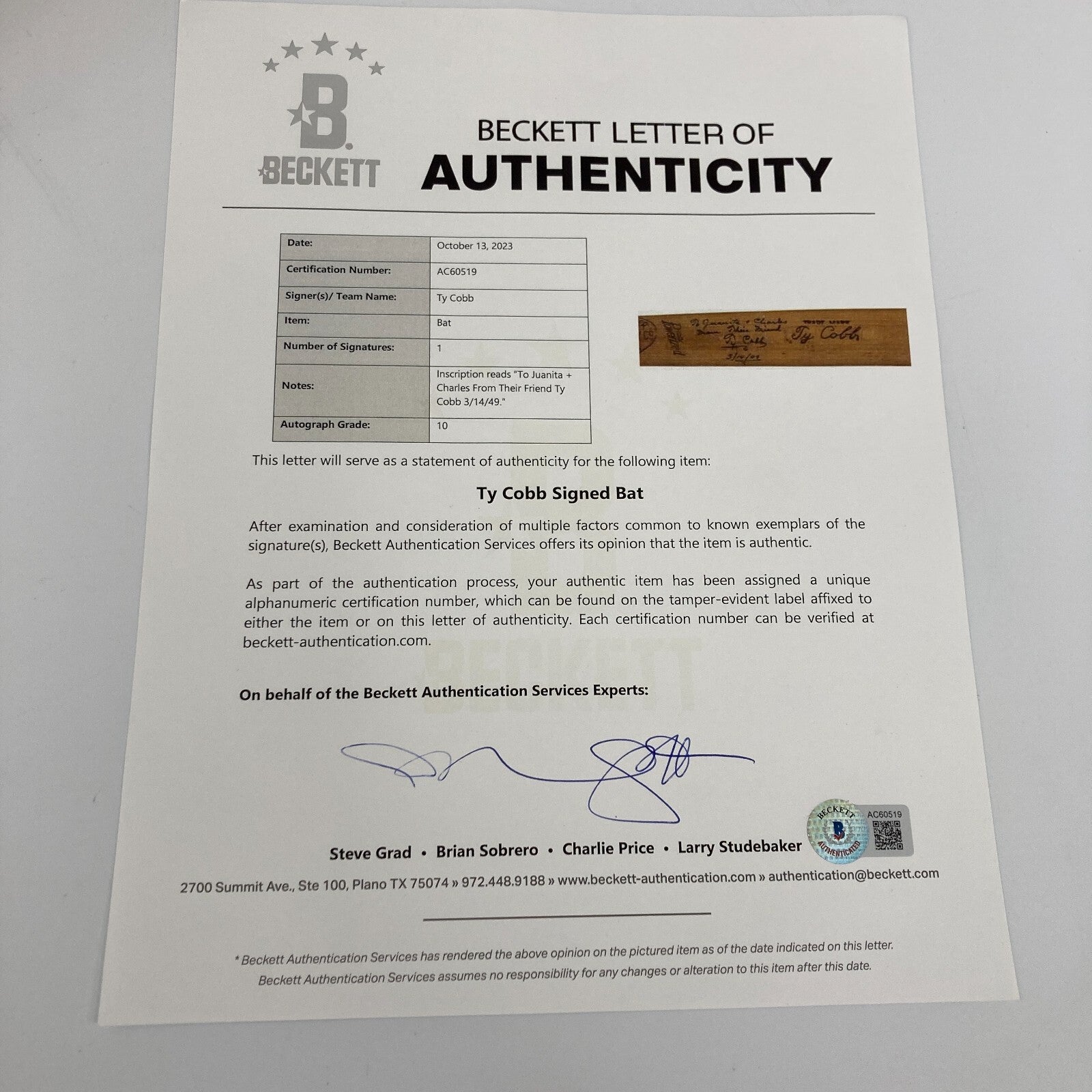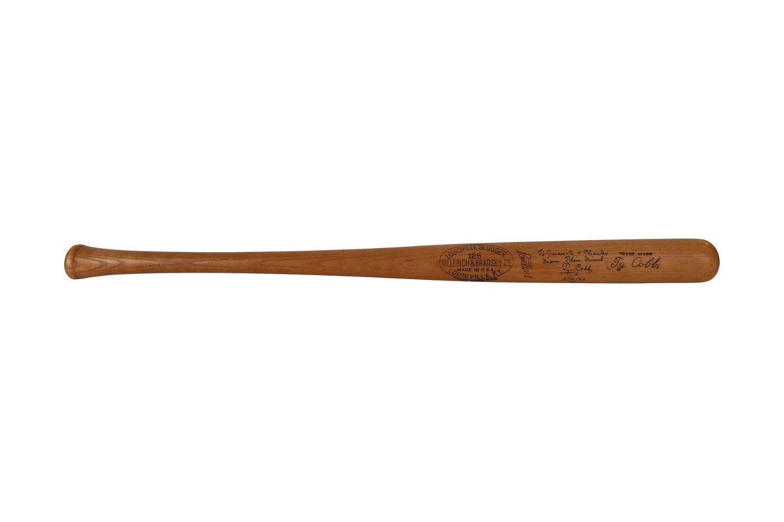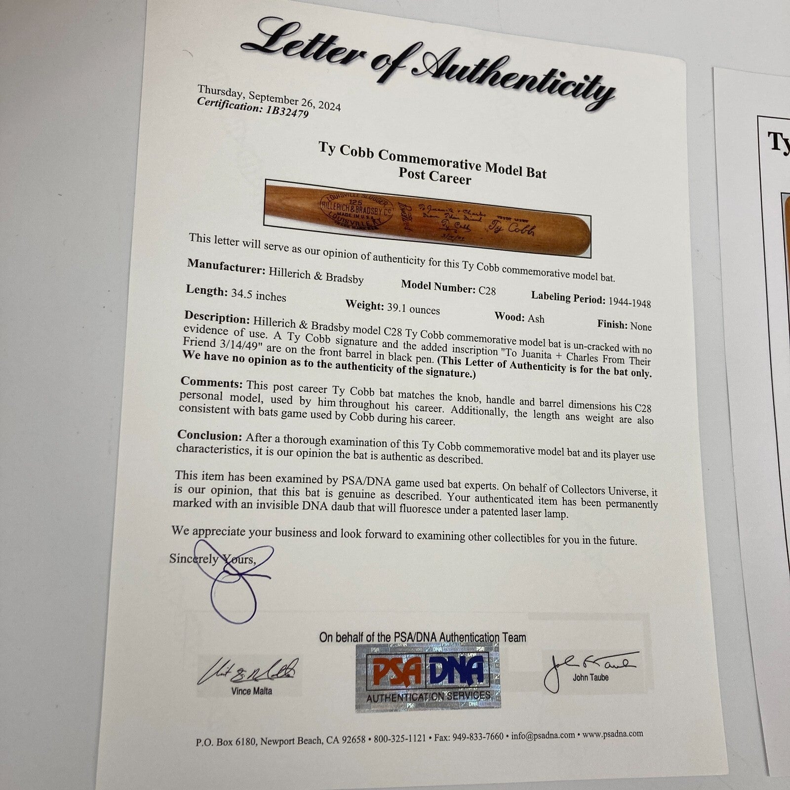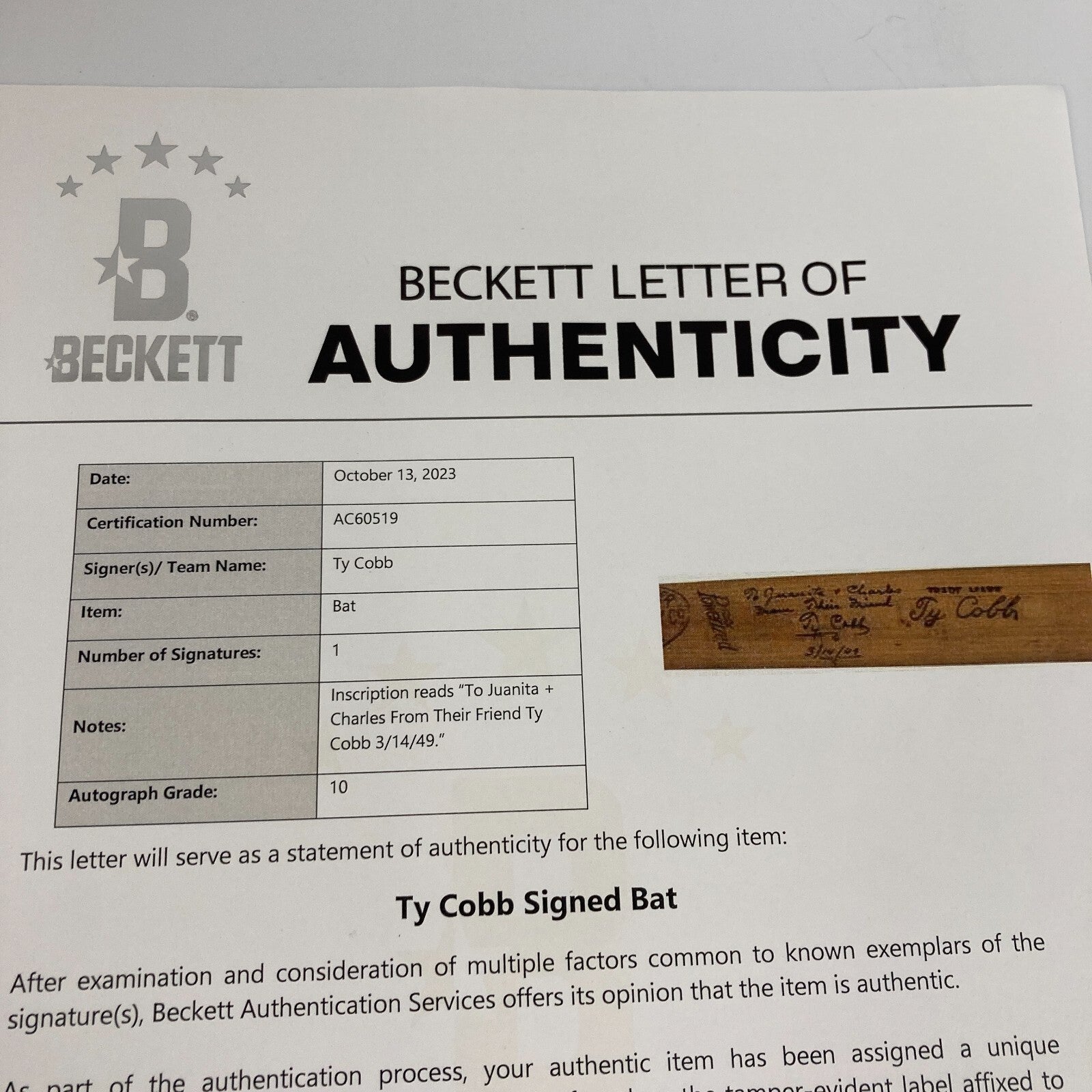 On March 14, 1949, Ty Cobb gifted one of his very own Hillerich & Bradsby personal model bats to Juanita Jennings-Ellias and Charles Ellias. The Georgia Peach signed and inscribed this remarkable keepsake in strikingly bold black ink, “To Juanita & Charles, From Their Friend, Ty Cobb, 3/14/49.” Through Ty’s friendship with Babe, the couple also shared a close bond with Cobb, who presumably was unaware of Juanita's big secret and role shaping pop culture history. The H&B ‘C28’ signature model ash bat was produced for Ty Cobb post-career during the 1944-48 period as he was still under contract with the manufacturer. Uncracked with no use, it matches the specs of ‘C28’ pro models from his playing career. The 34.5” length and 39.1 oz. weight are consistent with Cobb gamers from two decades earlier. The signature and inscription stand as the Cobb’s finest we have ever encountered on a bat, accentuated by the fascinating soap opera involving its original recipient. Includes full LOAs from PSA/DNA bat expert John Taube (authenticating it as a Cobb player model), PSA/DNA (Noting it comes from The Babe Ruth Family Collection), and Beckett (Auto. Grade 10). Sourced several years ago directly from the estate of Juanita Jennings-Ellias.