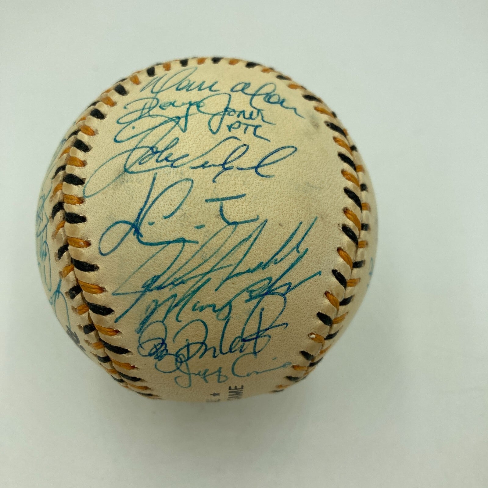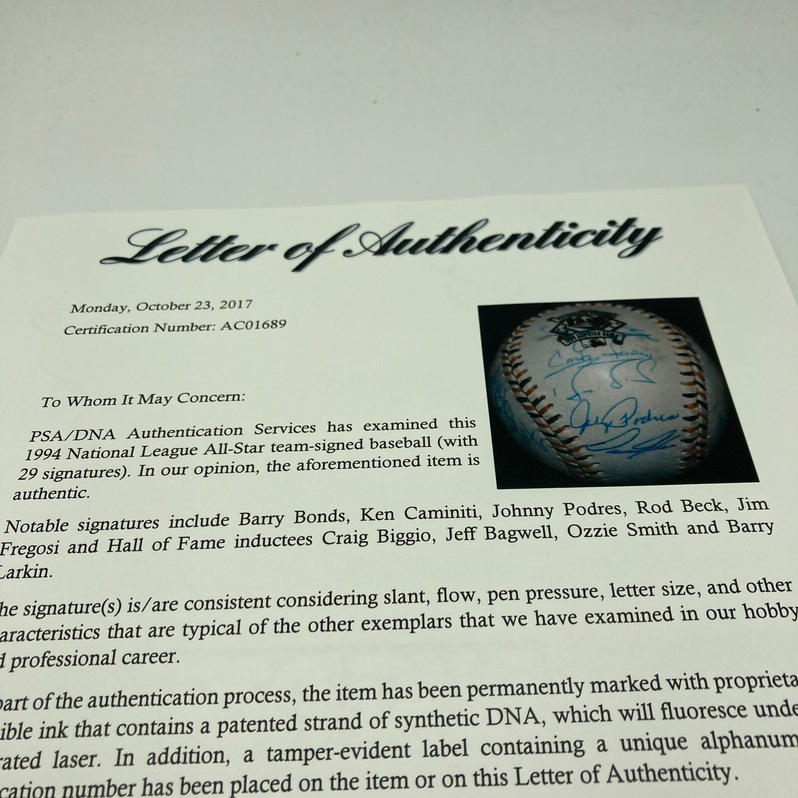 1996 National League Team Signed Official All Star Game Baseball. About 30 signatures with Barry Bonds, Ozzie Smith, Barry Larkin, Fred McGriff, Craig Biggio, Jeff Bagwell, Ken Caminiti, Rod Beck, Dusty Baker, Dante Bichette and many others. Comes with full letter Certificate Of Authenticity from PSA DNA.