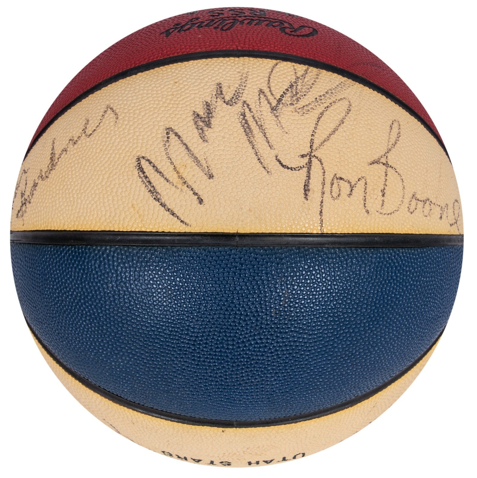 The Utah Stars were in the American Basketball Association (ABA) from 1970-76 after previously being located in Los Angeles and Anaheim. One of the more popular teams in the ABA, winning three Division Titles and one ABA Championship during their short stint in the ABA. Presented here is an Official ABA Rawlings basketball signed by 12 members of the 1975-76 Utah Stars. The red, white, and blue leather basketball features “RAWLINGS RSS OFFICAL” stamped in black on a red panel of the ball. “AMERICAN BASKETBALL ASSOCIATION ABA” is stamped in black on a white panel. “UTAH STARS” is stamped in black on another white panel. The basketball features faded signatures from 12 members of the Utah Stars team including those of Ron Boone, George Carter, Randy Denton, Dwaine Dillard, Jim Eakins, Kenneth Gardner, Steve Green, Joe Hamilton, Goo Kennedy, John Roche, Al Smith, and Donald Washington. The basketball features elements of toning and comes with an LOA from Beckett Authentication for the signatures.