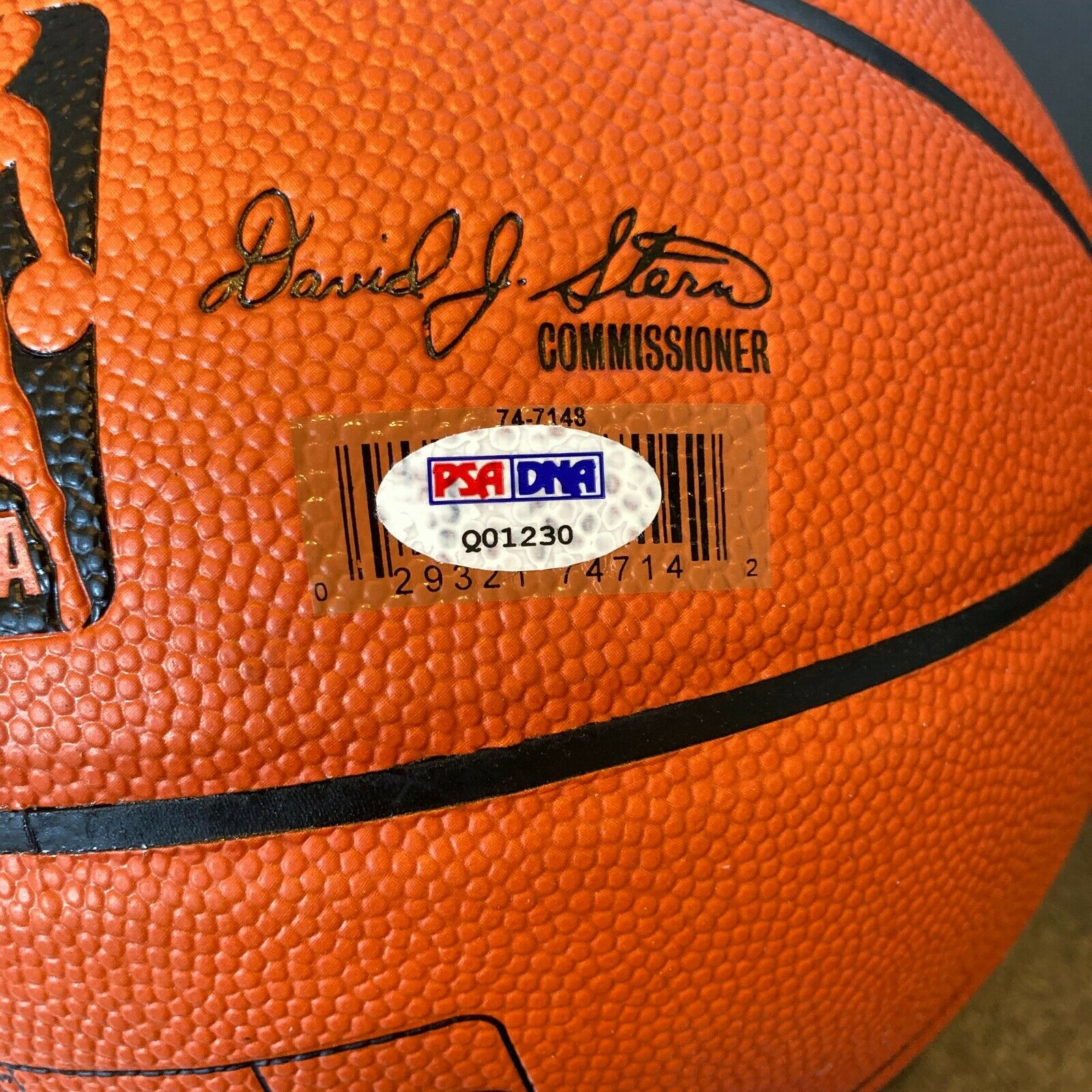 1982-83 Philadelphia 76ers team signed basketball PSA/DNA. Spalding NBA basketball signed by (8) members of the 1983 NBA champion 76ers including Moses Malone with "MVP" "FO-FO-FO" inscriptions, Julius "Dr.J" Erving, Bobby Jones with "83 Champs" inscription, Clint Richardson, Clemon Johnson, Reggie Johnson, Franklin Edwards, and Earl Cureton. Includes Full letter LOA from PSA/DNA, with matching serial #ed sticker on the ball