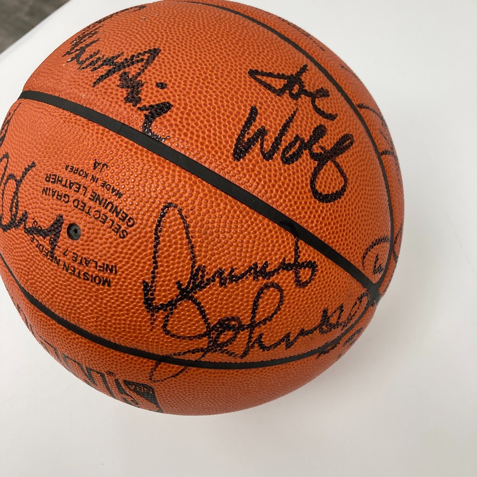 D.Stern NBA Game basketball signed by (9) members of the 1992-93 Celtics: Dennis Johnson with "DJ #3" inscription (worked as a scout post-career), Robert Parish, Dee Brown, Xavier McDaniel, Ed Pinckney, Rick Fox, Kenny Battle, Marcus Webb, and Joe Wolf