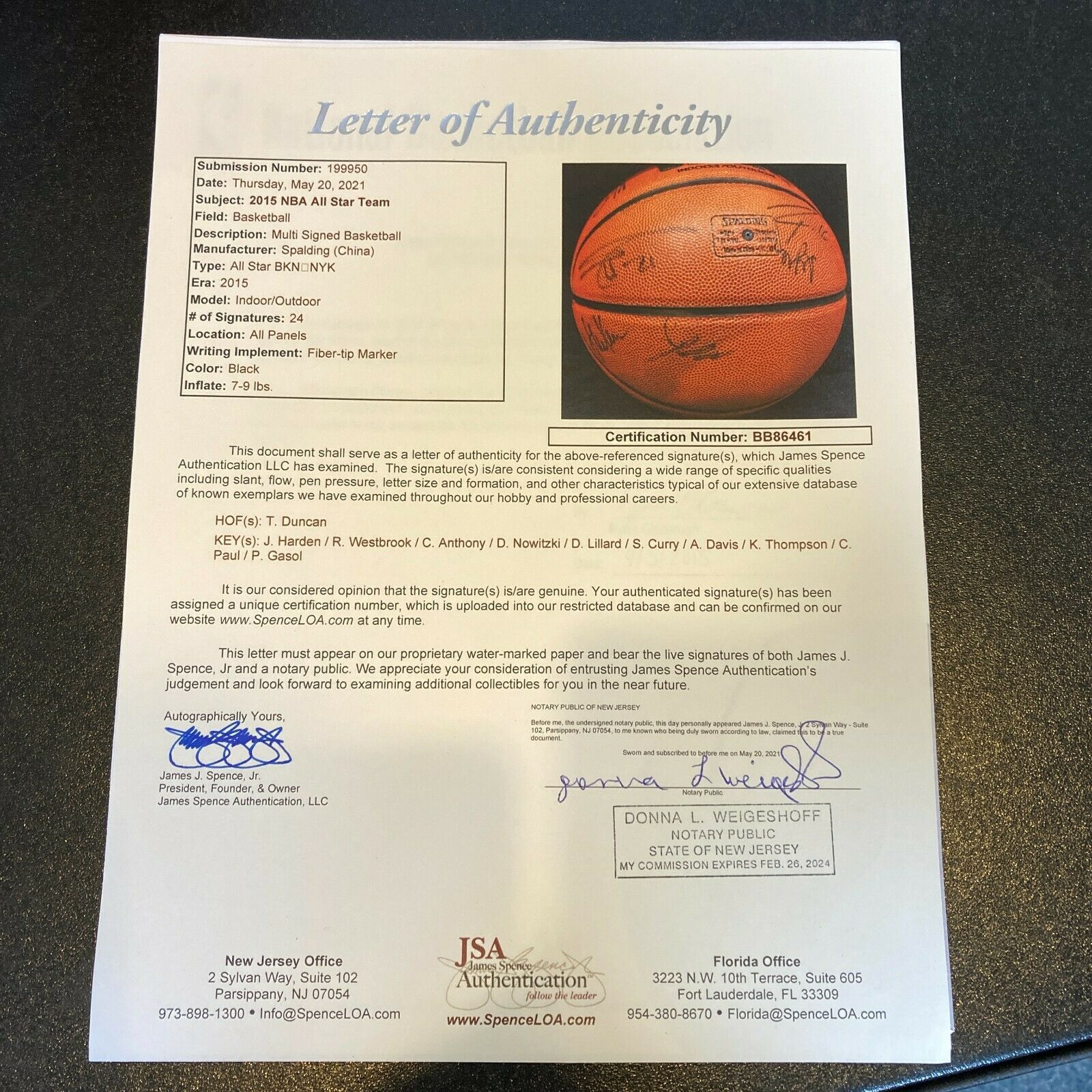 2015 NBA All Star Game Team Signed Spalding NBA Basketball. 24 signatures with Tim Duncan, Steph Curry, James Harden, Russell Westbrook, Carmelo Anthony, Dirk Nowitzki, Lillard, Klay Thompson, Chris Paul, Pau Gasol and many others. See the photos for a complete list.