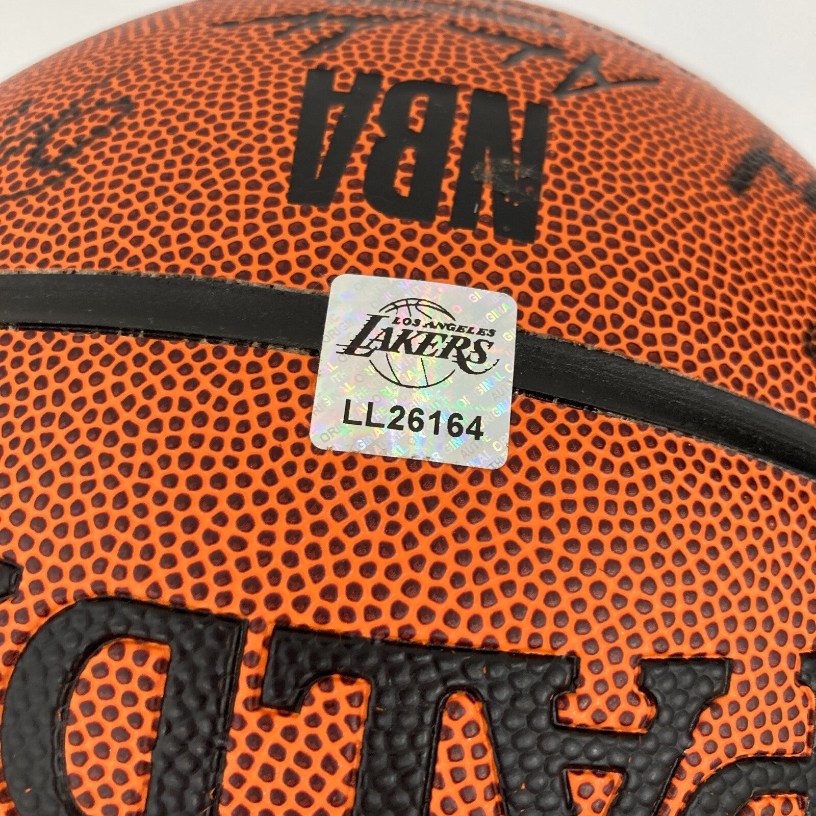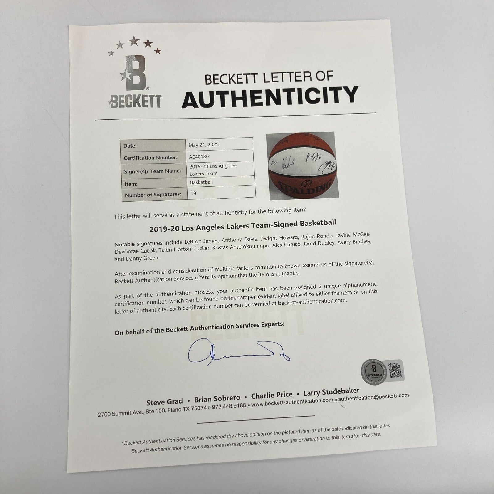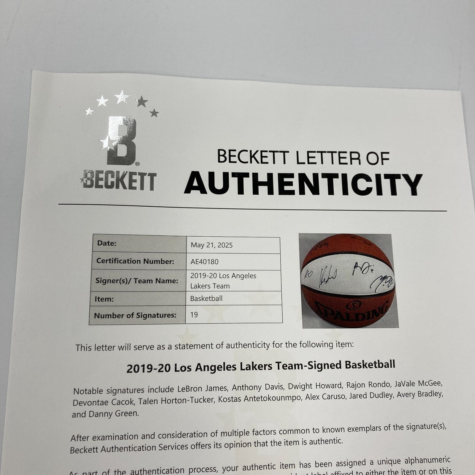 Presented is a 2020 NBA Finals Champions Commemorative Spalding basketball signed by members of the 2020 Los Angeles Lakers. The 2020 NBA Finals was a unique one, being held at the NBA Bubble at Walt Disney Resorts due to the Covid-19 outbreak. The Los Angeles Lakers defeated the Miami Heat in a thrilling six game series, and the Lakers secured their eighteenth NBA Championship. 19 members of the 2020 Lakers have signed this white panel commemorative basketball in black ink, including LeBron James, Anthony Davis, Dwight Howard, Rajon Rondo, JaVale McGee, Devontae Cacok, Talen Horton-Tucker, Kostas Antetokounmpo, Alex Caruso, Jared Dudley, Avery Bradley, and Danny Green. LOA from Beckett for the signatures accompanies.