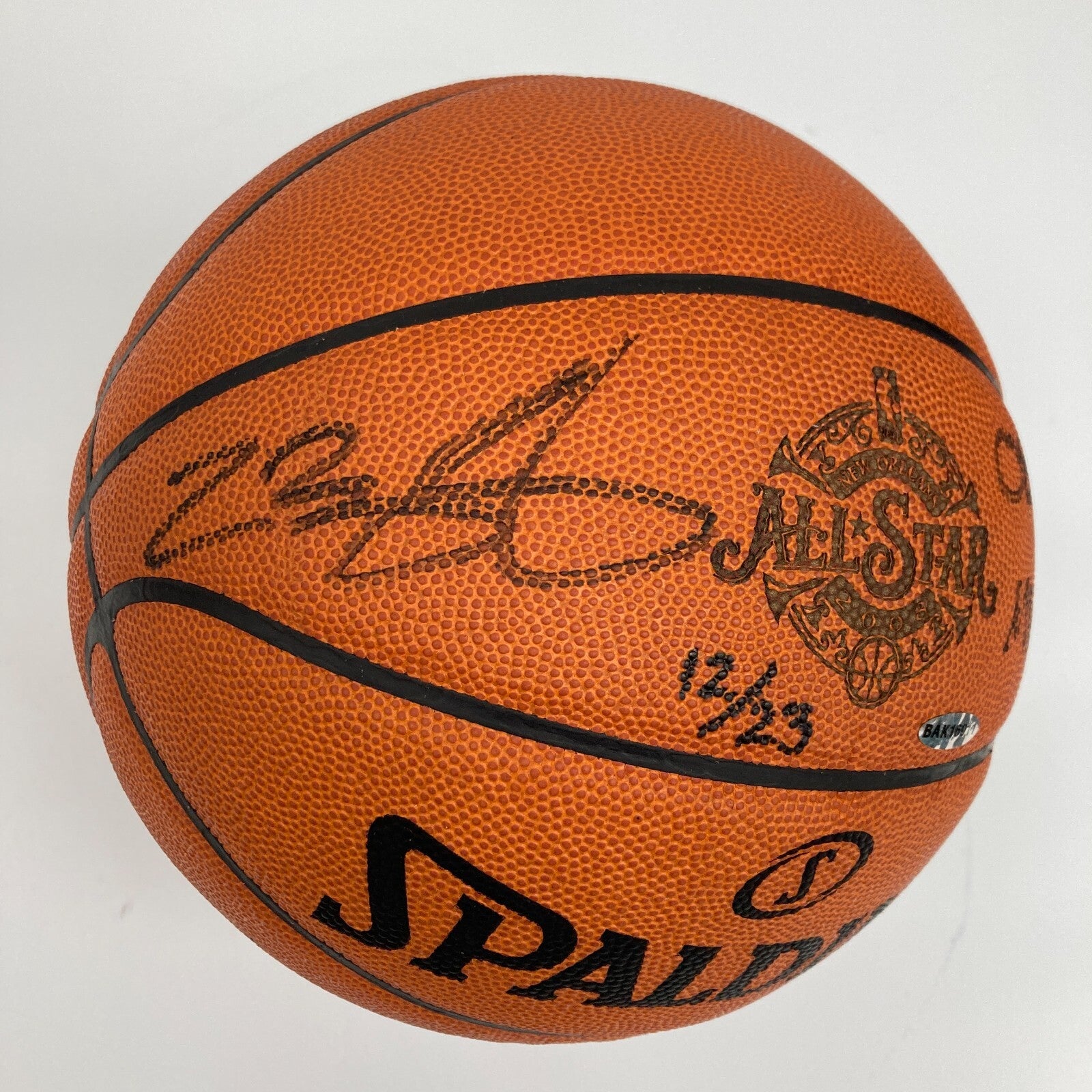 Presented is a limited-edition (#12/23) All-Star Game basketball signed by the NBA's all-time Scoring King LeBron James. James has penned his flowing signature in black marker adjacent to the official New Orleans 2008 All-Star Game stamping on the ball; James has added the inscription "08 AS MVP" on the opposite side. James scored a game-high 27 points with 9 assists and 8 rebounds in the East's 134-128 victory over the Western Conference. COA from Upper Deck Authentication (BAK16911) for signature.
