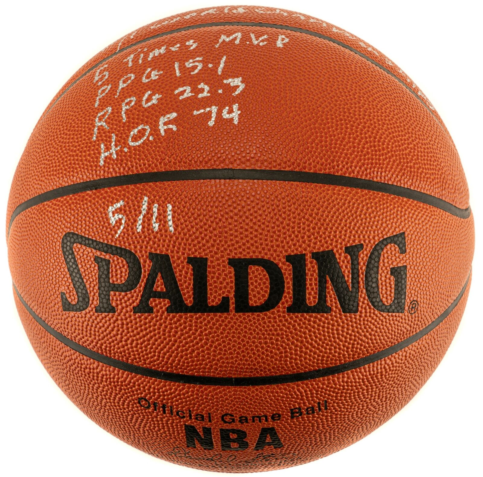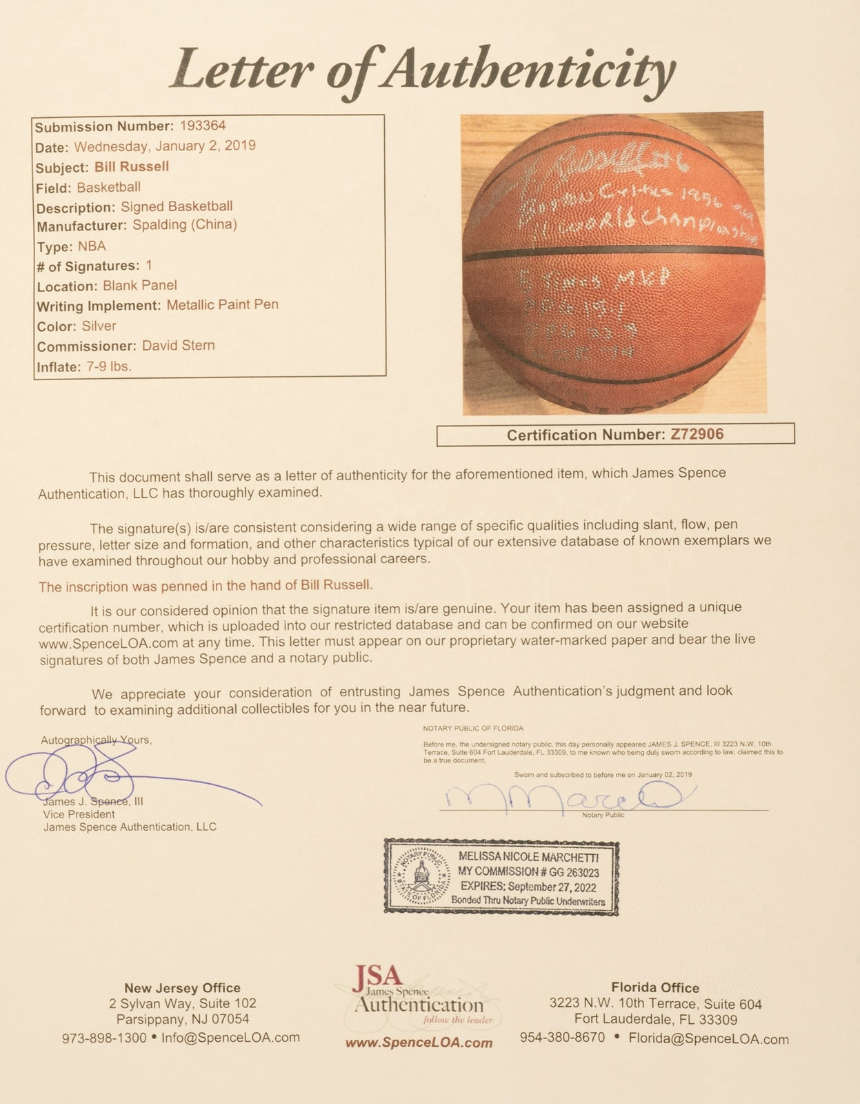 Rare limited-edition "stat" basketball signed by Hall of Fame center Bill Russell. Russell has scripted his full name and uniform number,William F. Russell #6" in silver paint pen on one of the panels, along with the printed inscription "Boston Celtics 1956-1969/11 World Championships." On the panel below he has added "5 Times M.V.P./PPG 15.1/RPG 22.3/H.O.F 74." The handwritten limitation number, "5/11," appears on the panel below. The signature and all of the inscriptions are boldly executed and grade "10." The ball remains in Mint condition. Full LOA from James Spence/JSA.