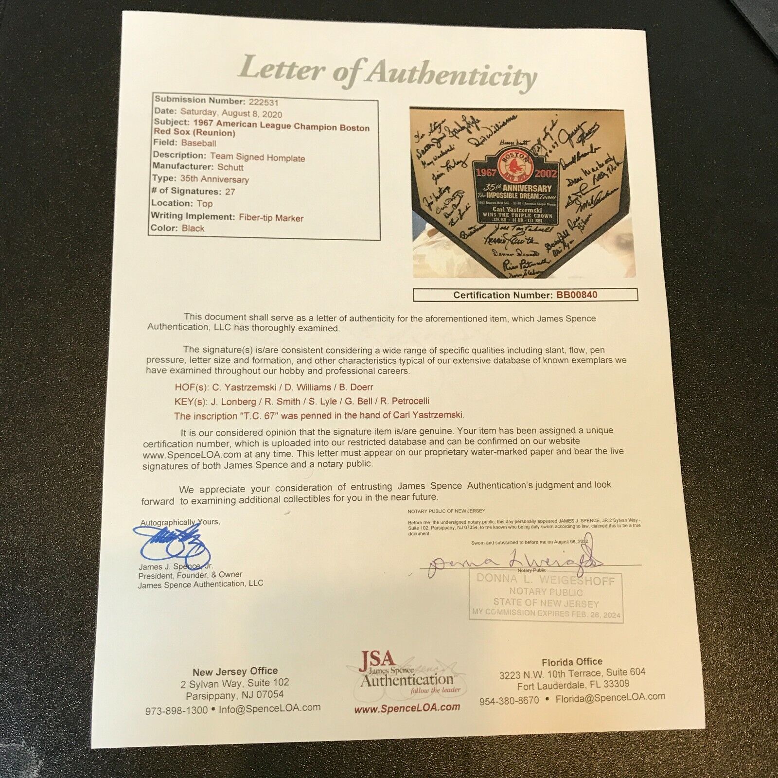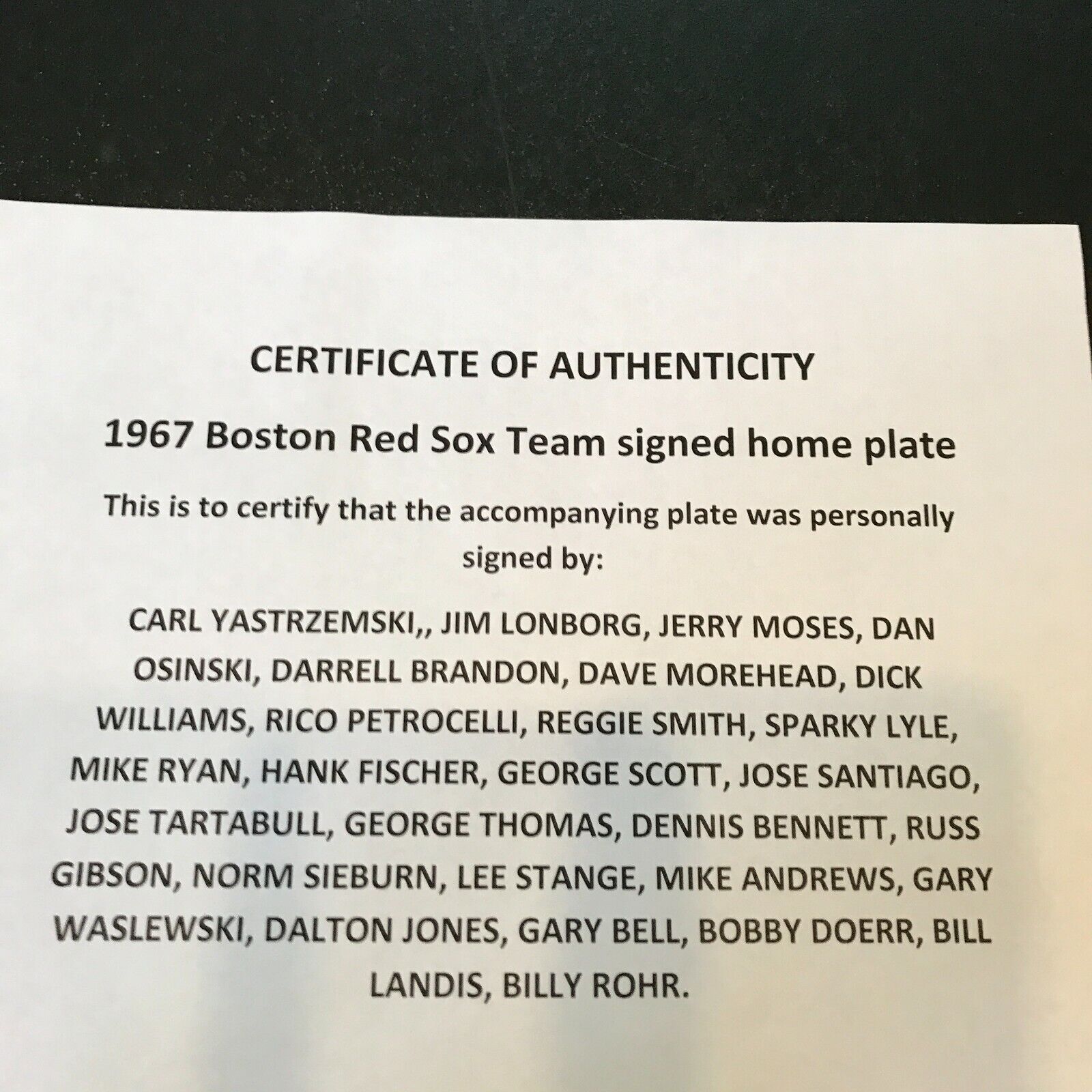 Stunning 1967 Boston Red Sox AL Champs Team Signed Authentic full size home plate. 27 signatures with Carl Yastrzemski and many others. See photos for a complete list. Full letter JSA COA.