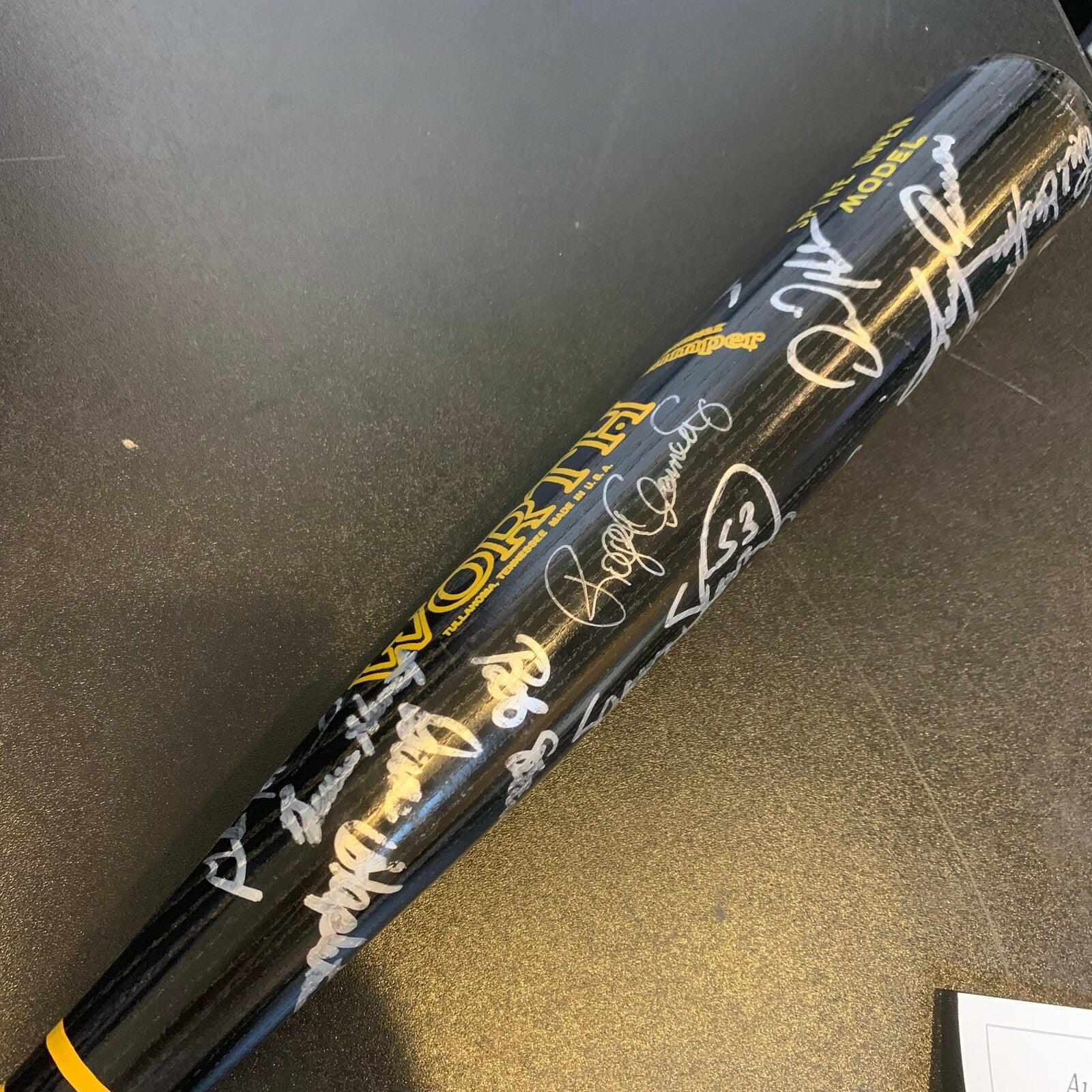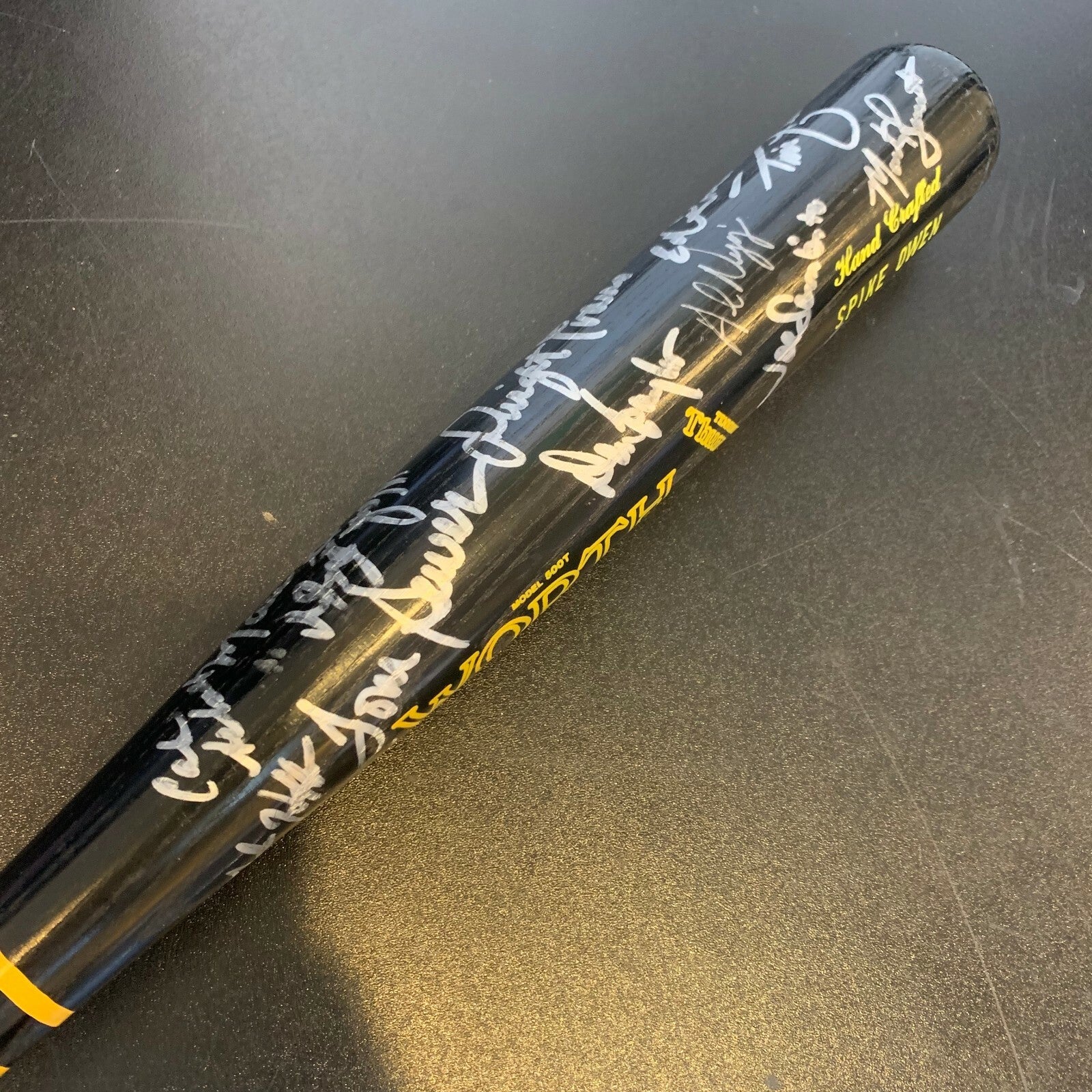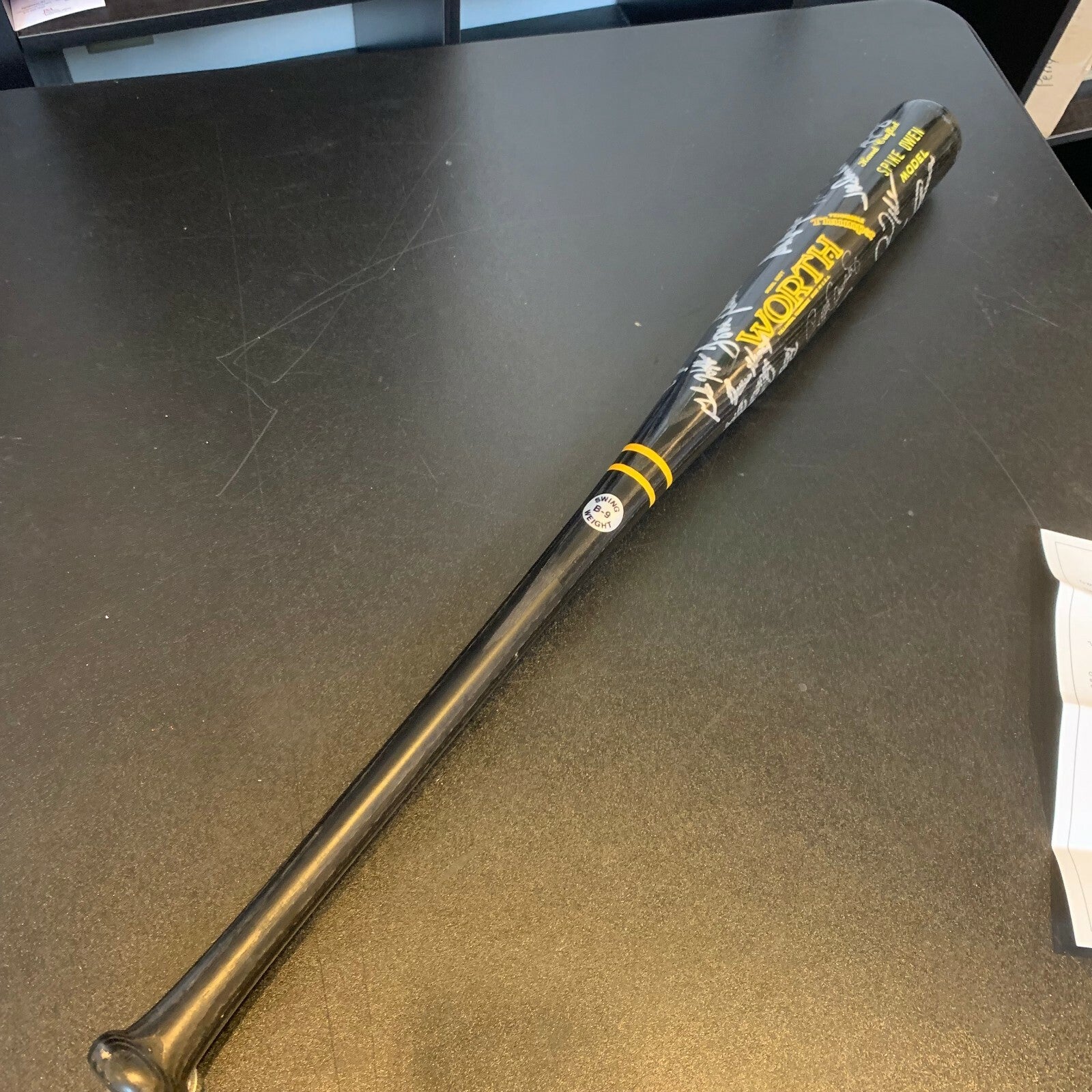Black Spike Own pro model bat. This Worth model bat has over 25 bold silver sharpie ink signatures that contrast perfectly against the bat. The autographs include Seaver, Boggs, Clemens, Baylor, Rice, Evans and Hurst. JSA COA.