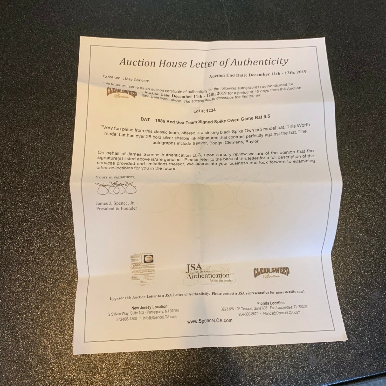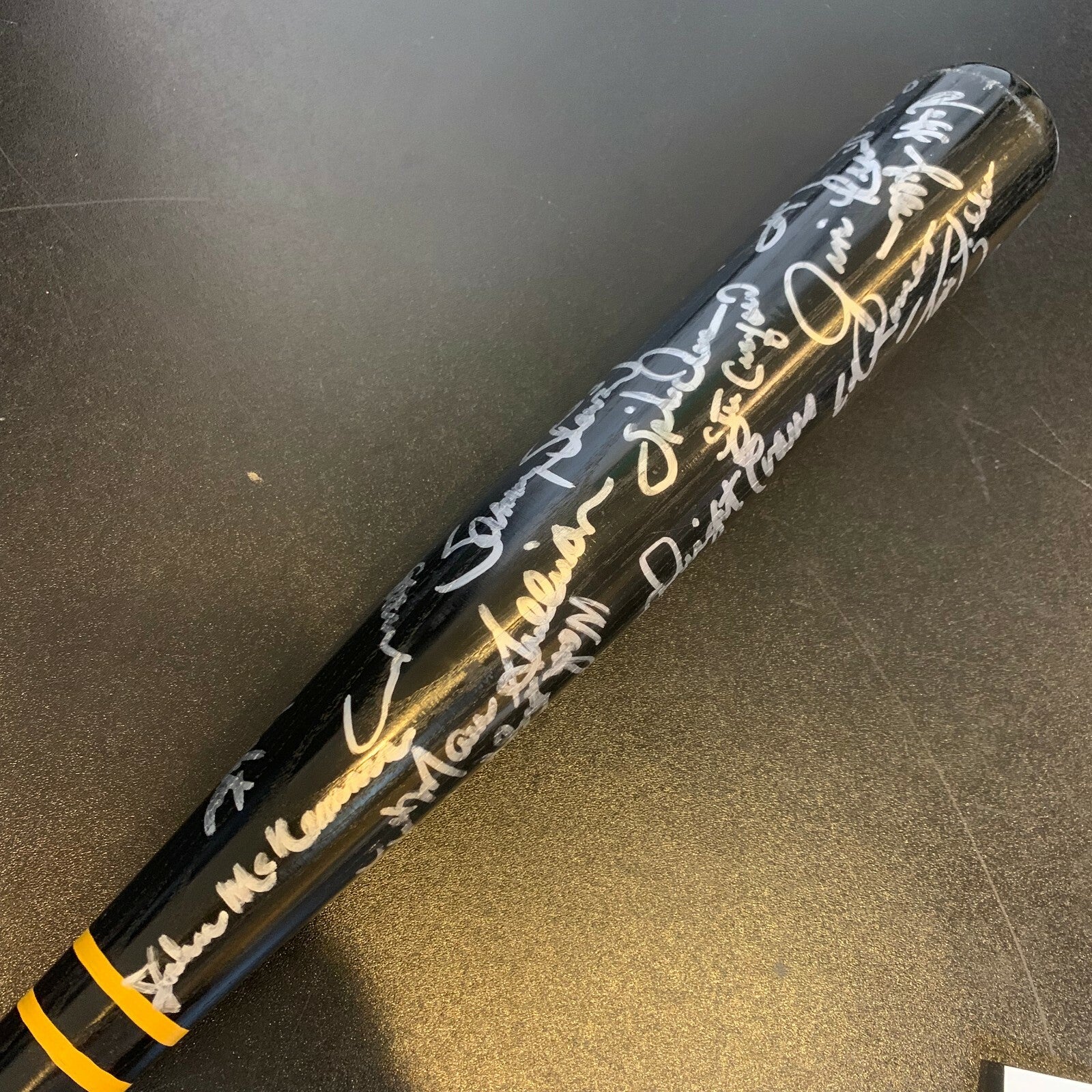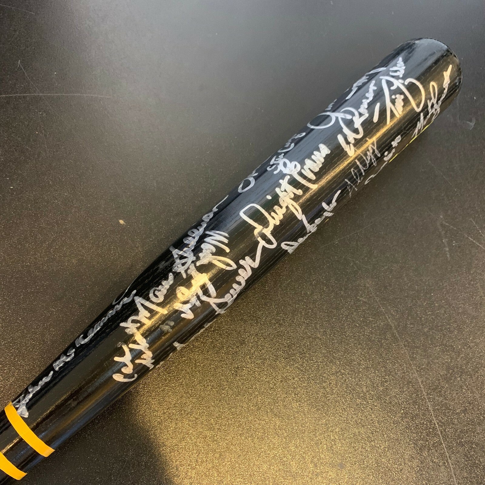 Black Spike Own pro model bat. This Worth model bat has over 25 bold silver sharpie ink signatures that contrast perfectly against the bat. The autographs include Seaver, Boggs, Clemens, Baylor, Rice, Evans and Hurst. JSA COA.