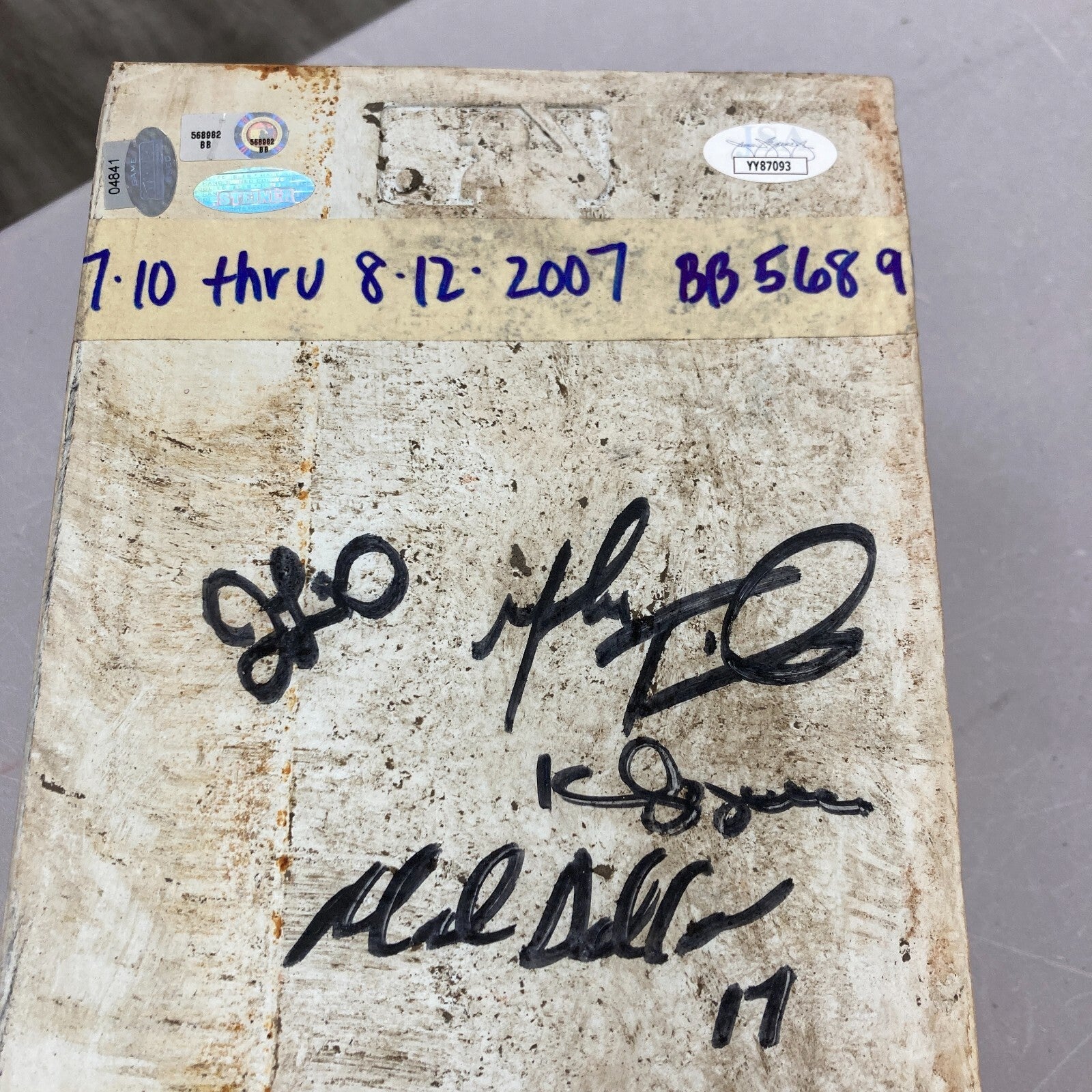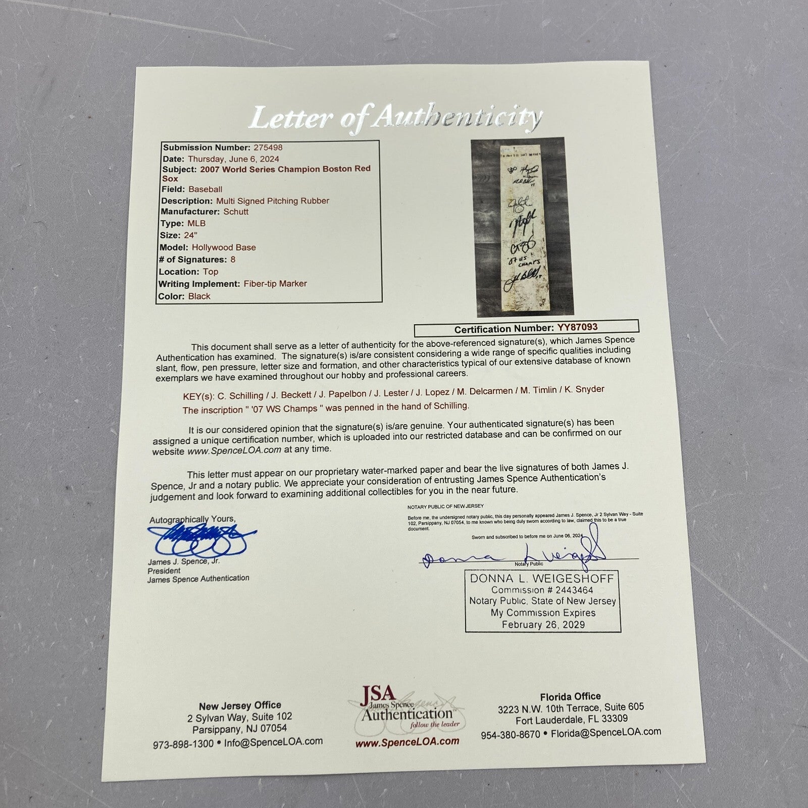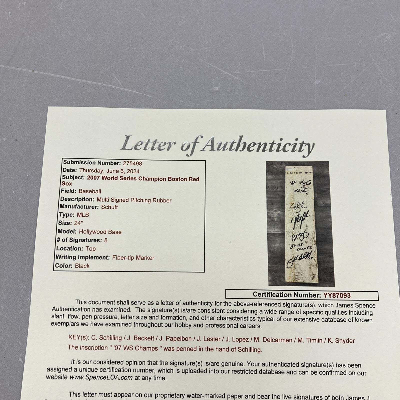 Eight members of the pitching staff have hand signed this pitching rubber including: Josh Beckett, Curt Schilling, Manny Delcarmen, Javier Lopez, Mike Timlin, Jonathan Papelbon, Jon Lester, and Kyle Snyder.