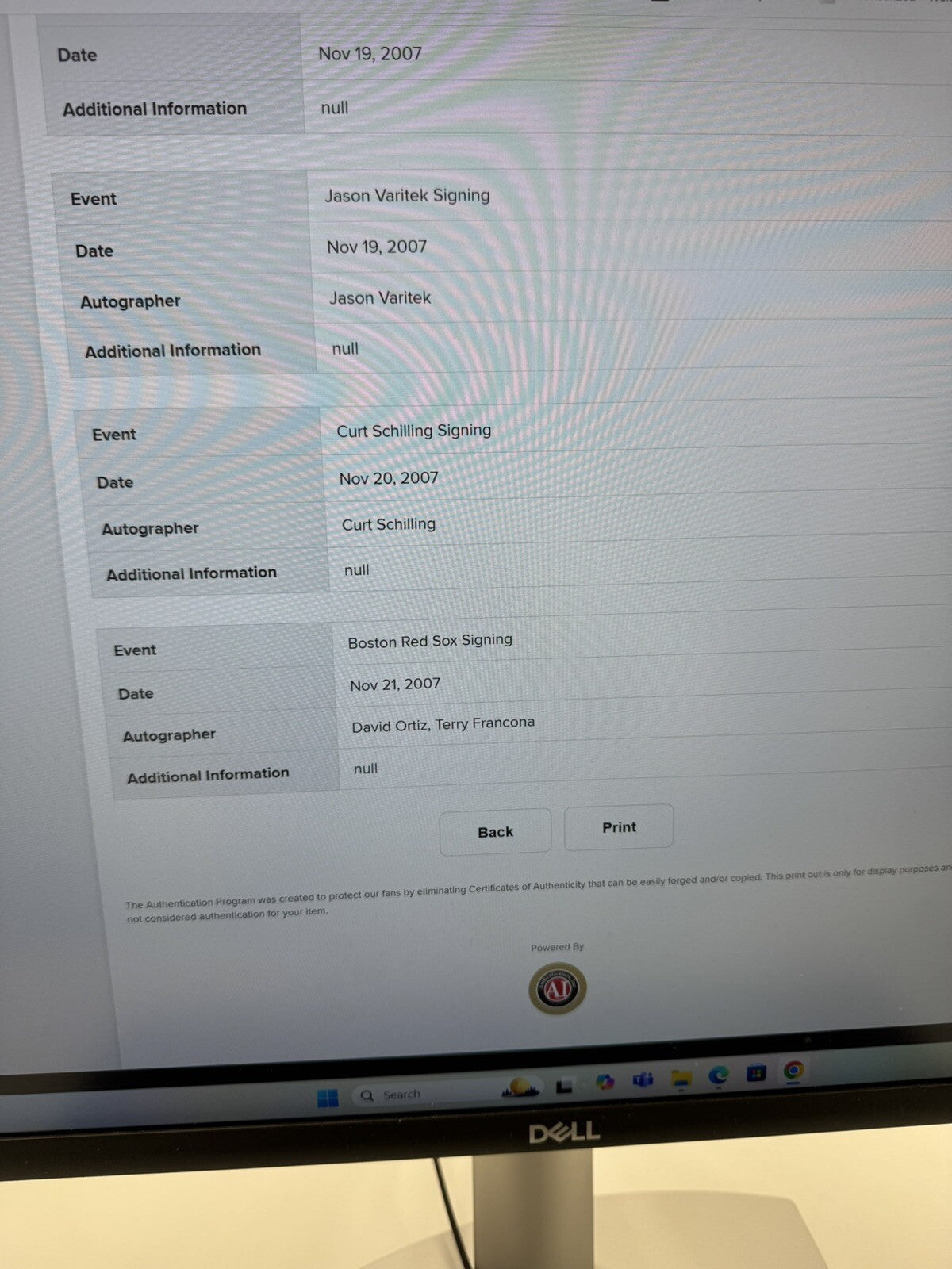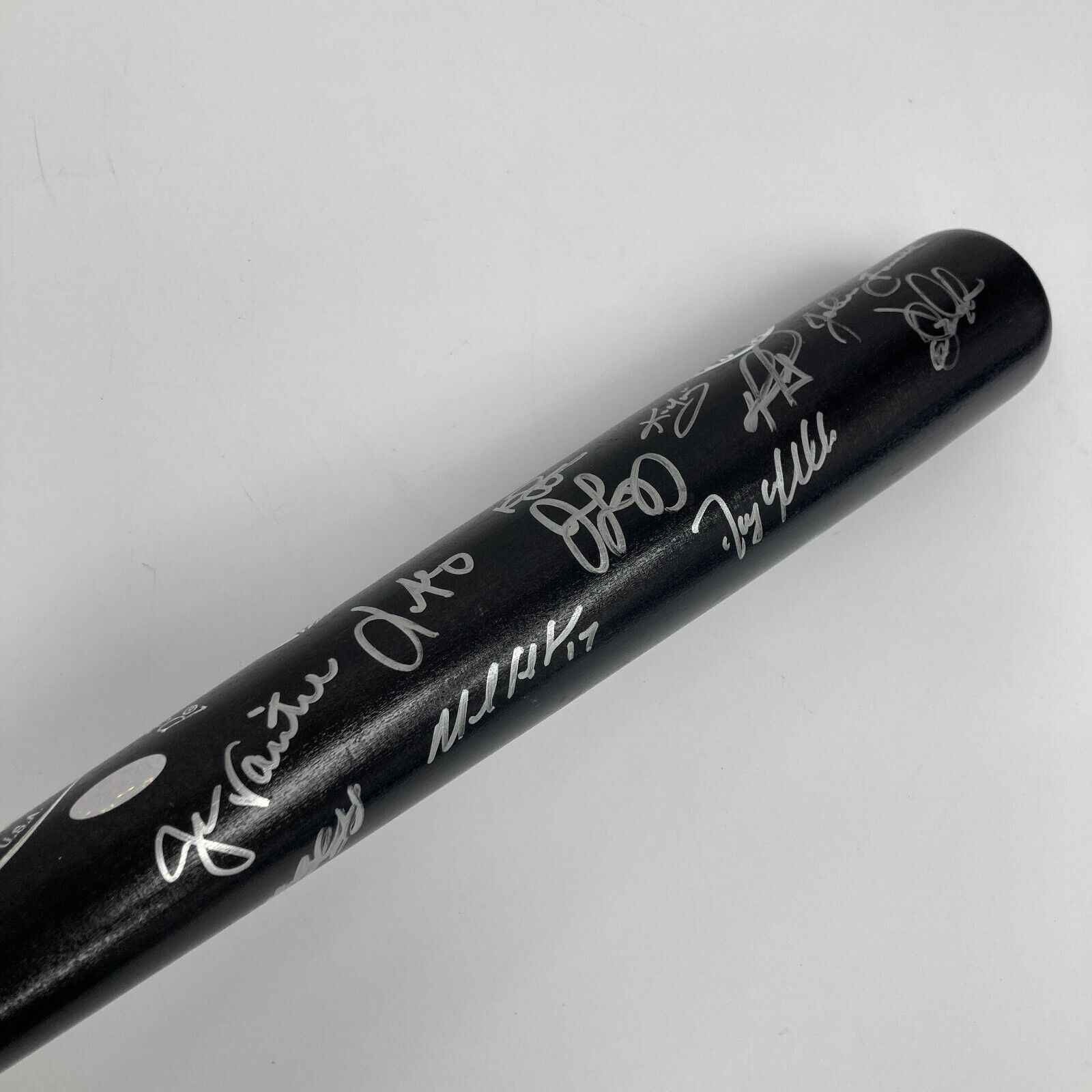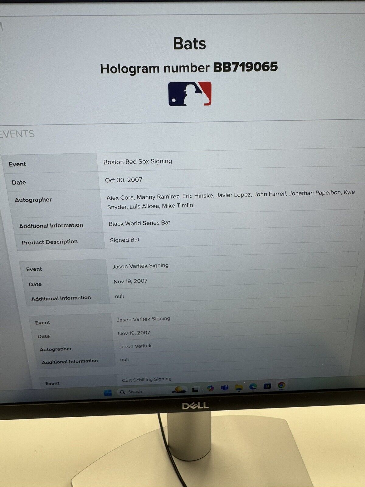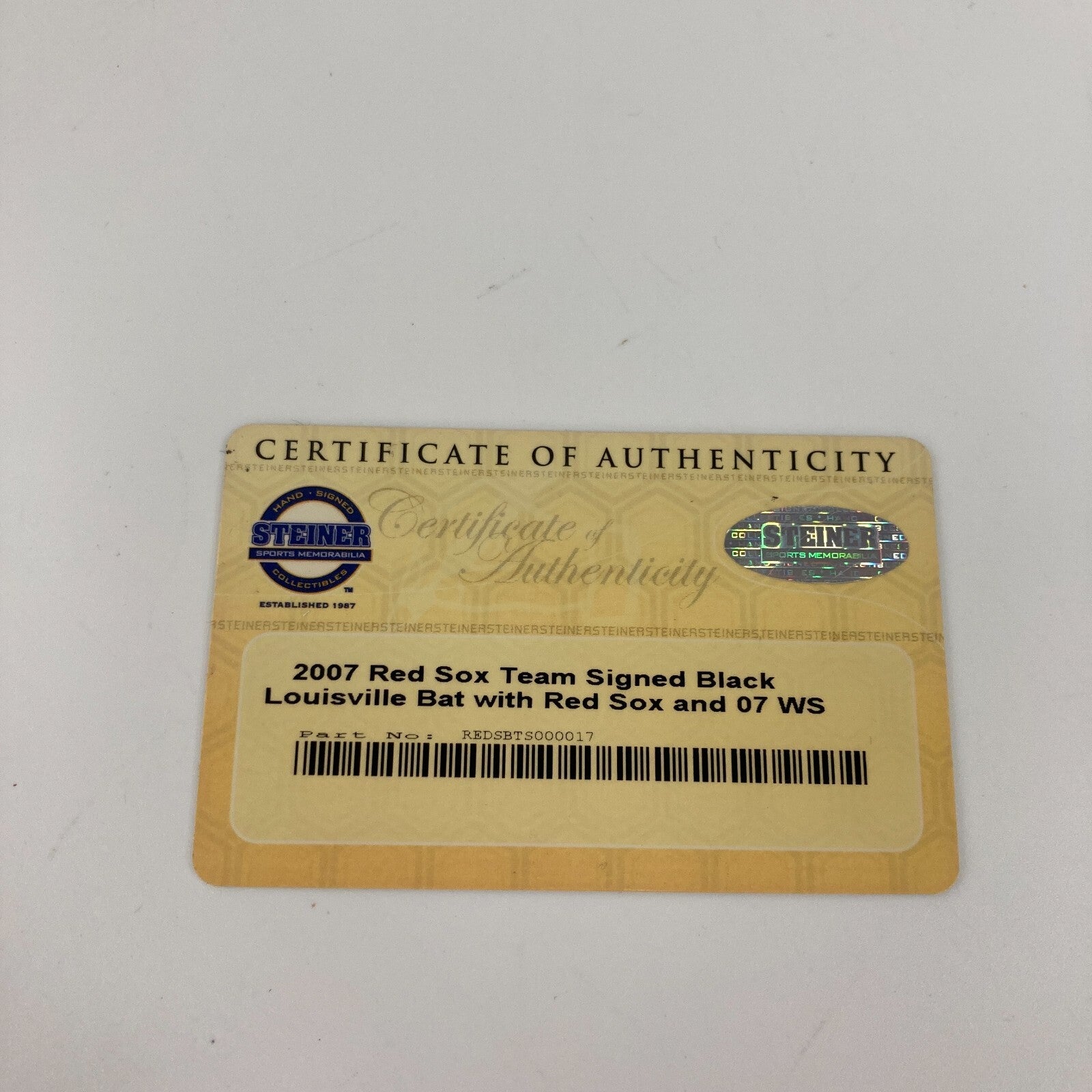 Presented is a Louisville Slugger commemorative bat signed by 14 members of the 2007 Boston Red Sox World Series Champion team. Red Sox legends including Manny Ramirez, David Ortiz, Curt Schilling and others have penned their flowing signatures in silver ink on the bat. The item comes with a COA from Steiner, as well as sticker from MLB Authentication (BB719065) for the signature.