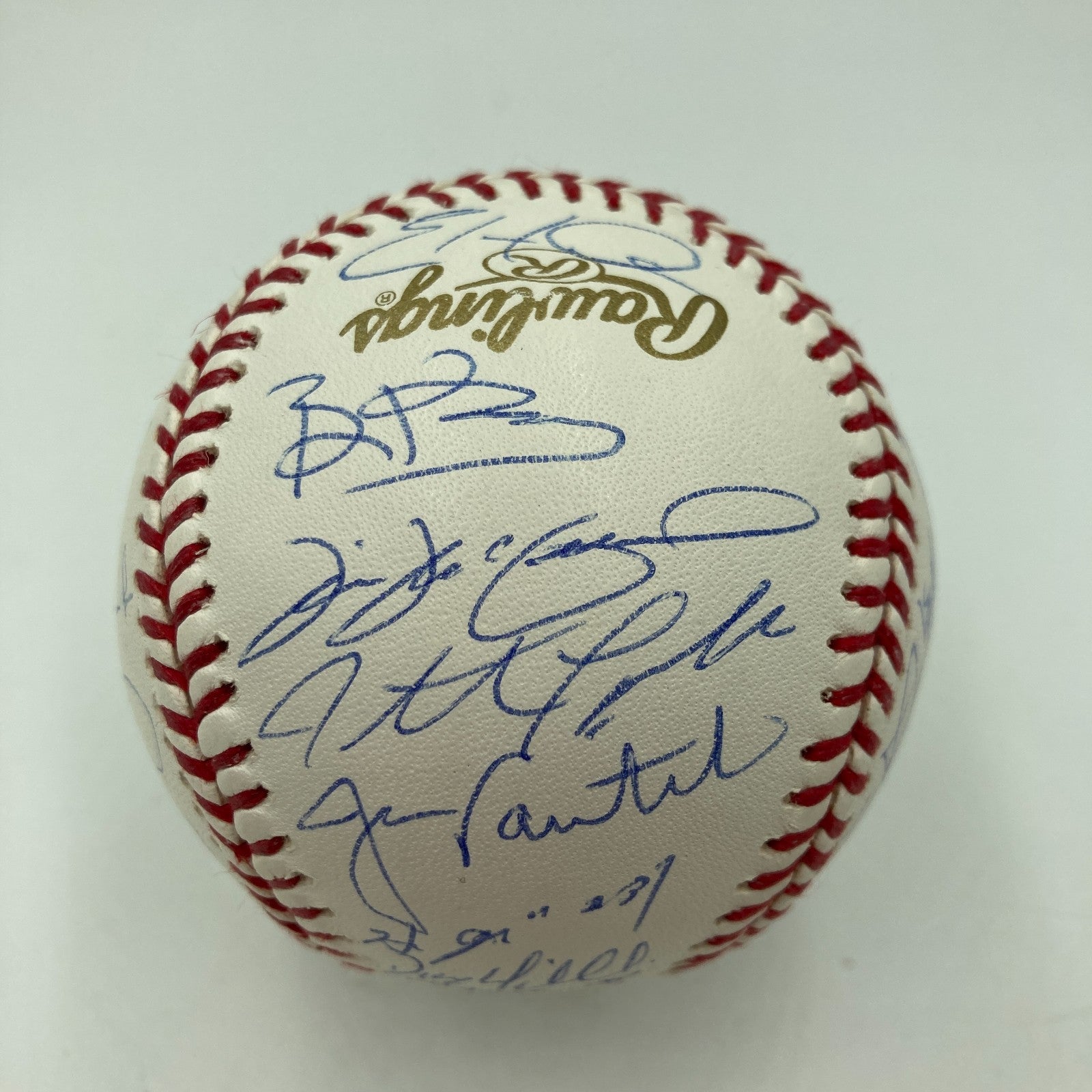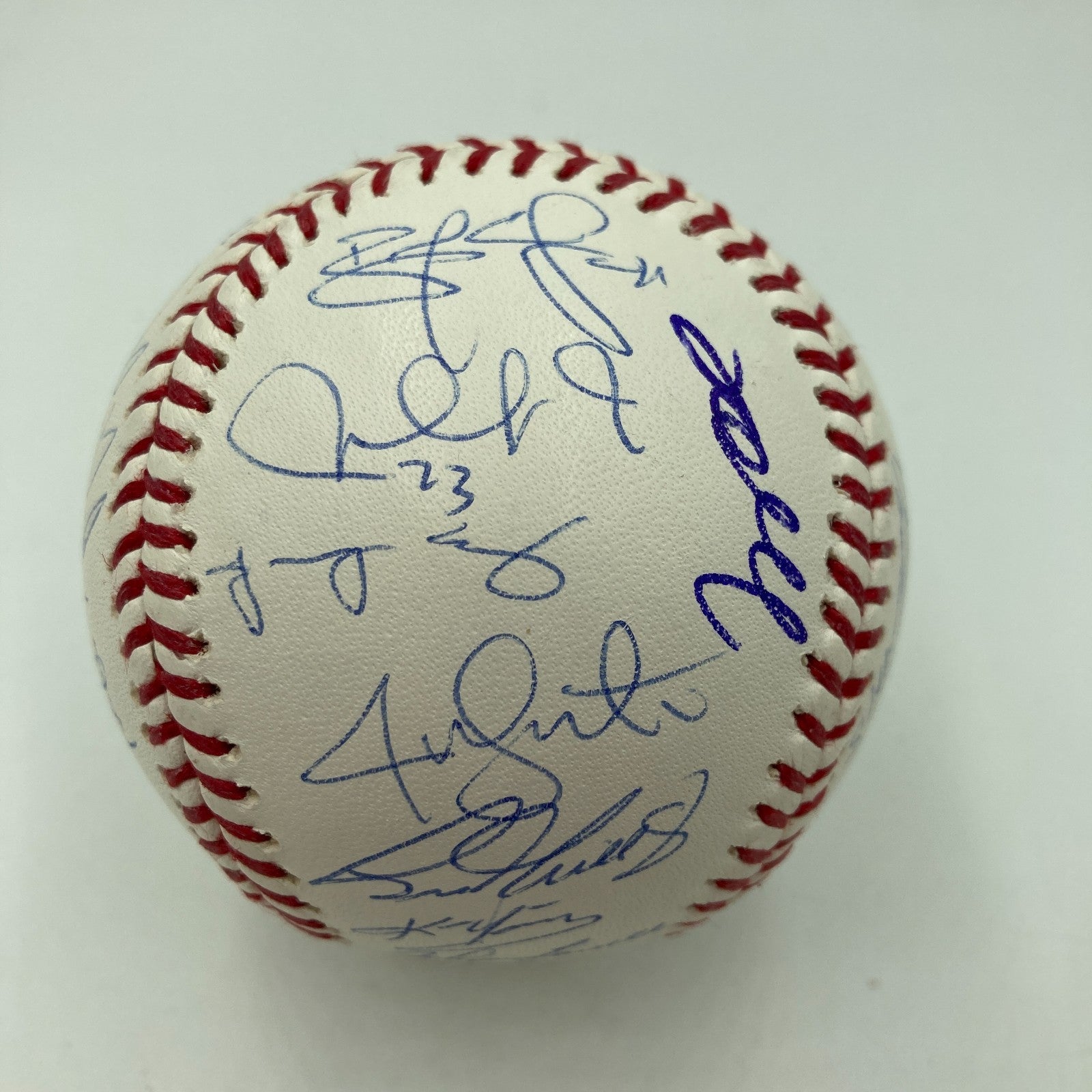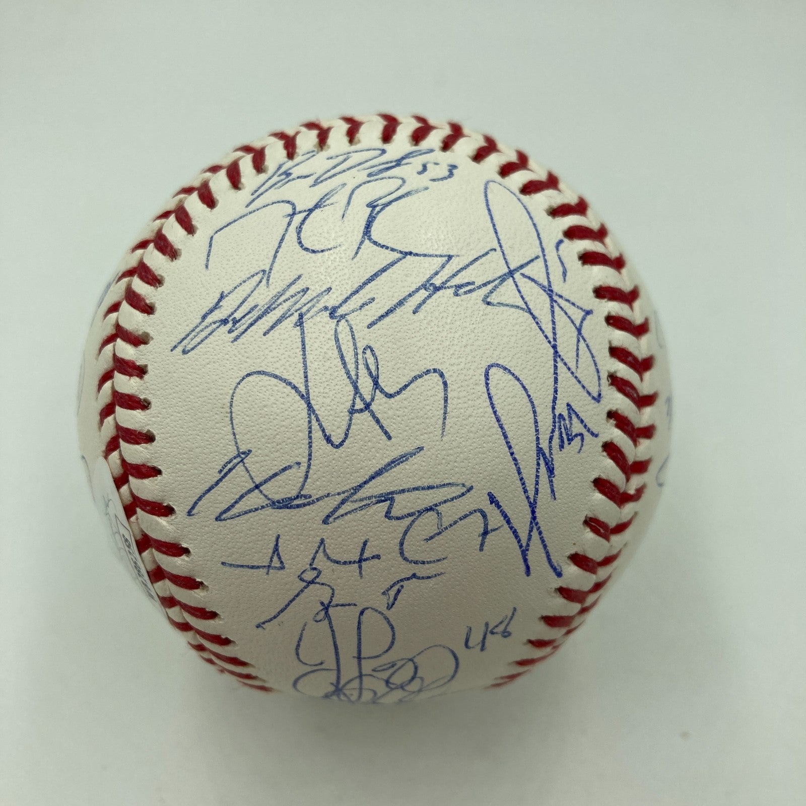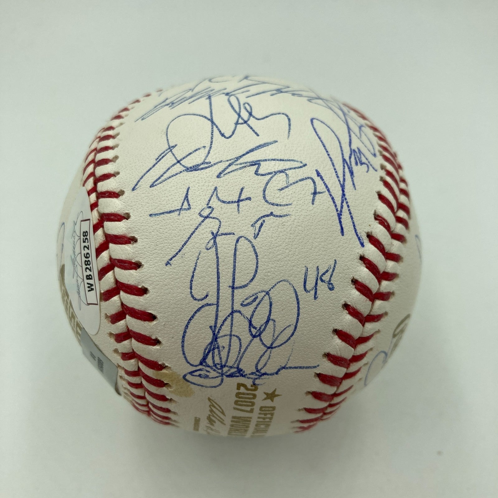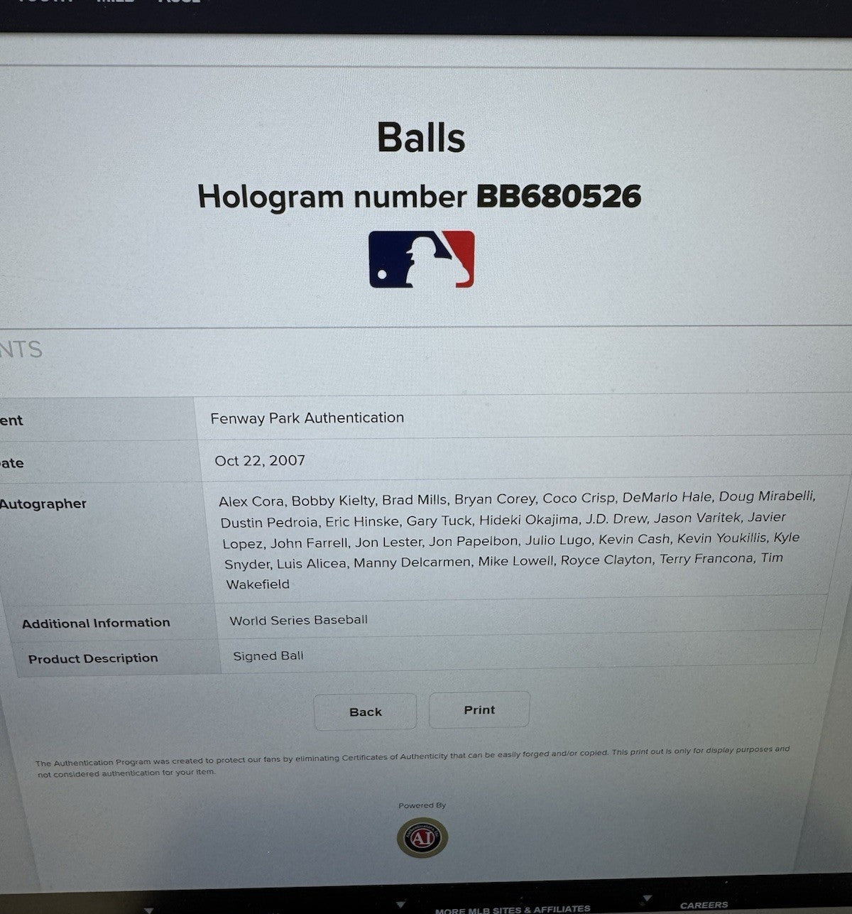 2007 World Series baseball is signed by Luis Alicea, Clay Buchholz. Kevin Cash, Royce Clayton, Alex Cora, Bryan Corey, Coco Crisp, Manny Delcarmen, JD Drew, John Farrell, Terry Francona, DeMarlo Hale, Eric Hinse, Bobby Kielty, Jon Lester, Javier Lopez, Mike Lowell, Julio Lugo, Daisuke Matsuzaka, Brad Mills, Doug Mirabelli, Hideki Okajima, David Ortiz, Jonathan Papelbon, Dustin Pedroia, Manny Ramirez, Kyle Snyder, Mike Timlin, Gary Tuck, Jason Varitek, Tim Wakefield, and Kevin Youkilis. Certified by MLB with tamper proof hologram.