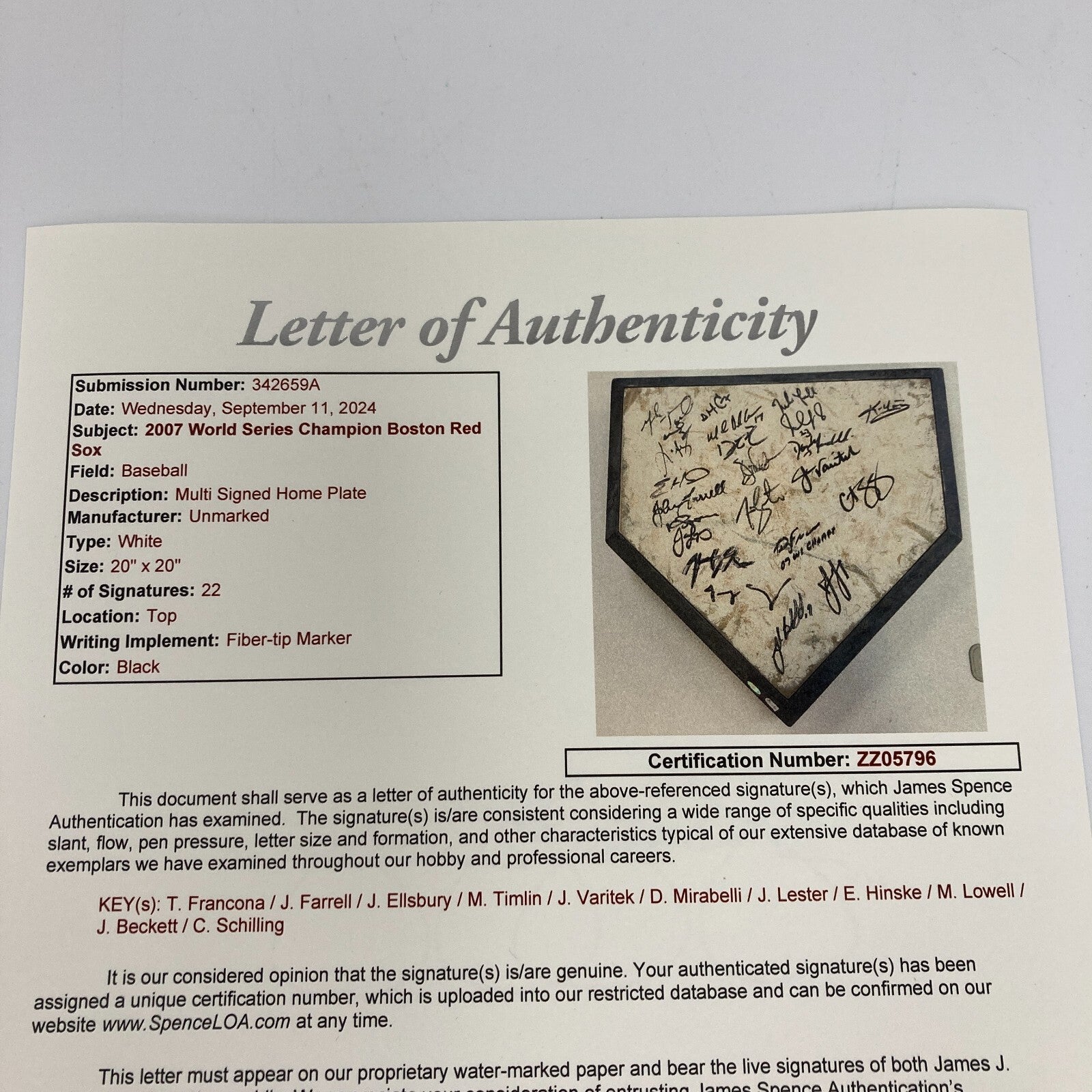 2007 Boston Red Sox World Series Champs Team Signed actual Fenway Park Game Used Home Plate. This home plate was used in May of 2007. There are 22 signatures with: David Ortiz, Curt Schilling, Terry Francona, Jason Vartiak, Kevin Youkilis, Manny Ramirez, Jon Lester, Josh Beckett, Jacoby Ellsbury and others. Comes with holograms from Steiner, MLB and JSA.