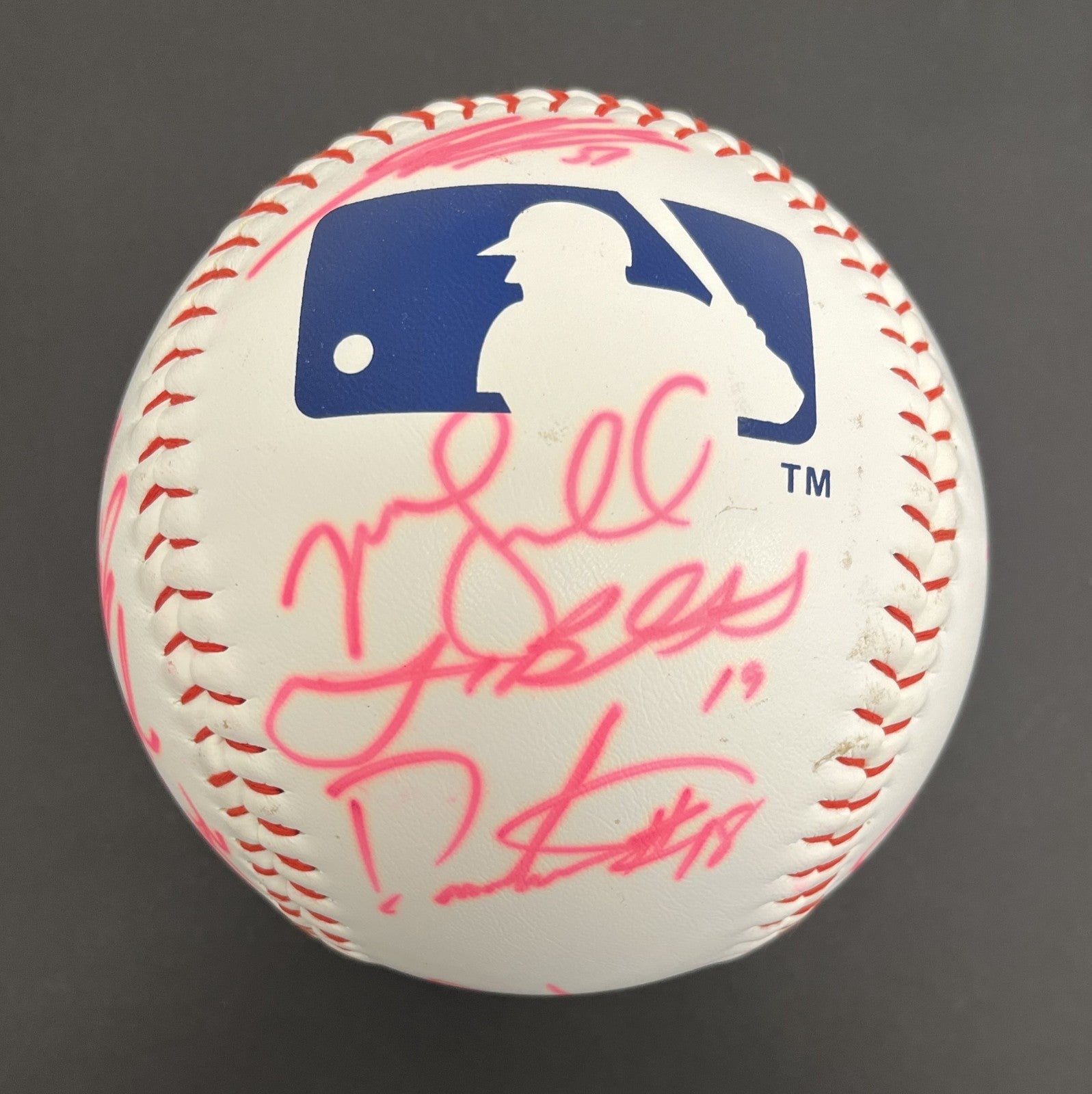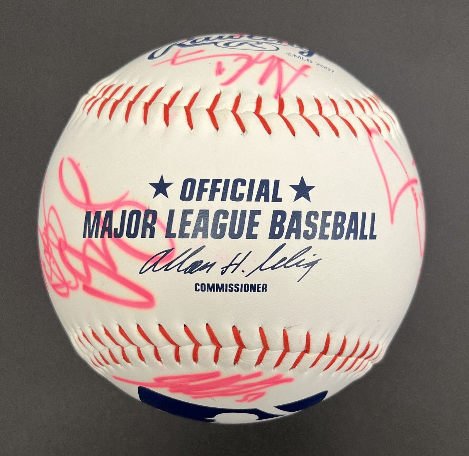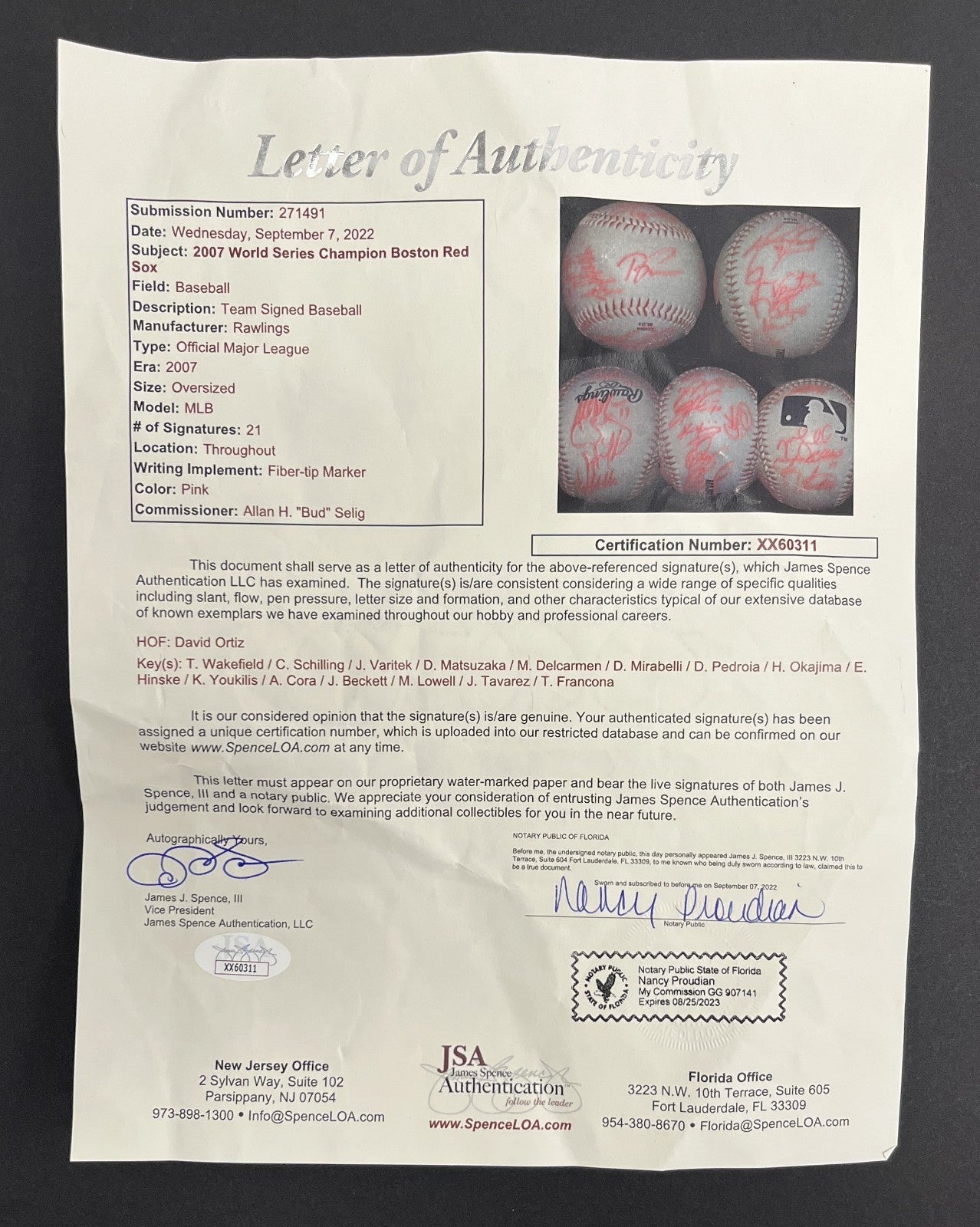 2007 Boston Red Sox World Series Champions team signed oversized baseball measuring approximately 7x7". Signed by 21 members of the 2007 World Series Champions. Signatures include Hall of Famer David Ortiz as well as Tim Wakefield / C. Schilling / J. Varitek / D. Matsuzaka / M. Delcarmen / D. Mirabelli / D. Pedroia / H. Okajima / E. Hinske / K. Youkilis / A. Cora / J. Beckett / M. Lowell / J. Tavarez and T. Francona. Accompanied by a full JSA Letter of Authenticity.