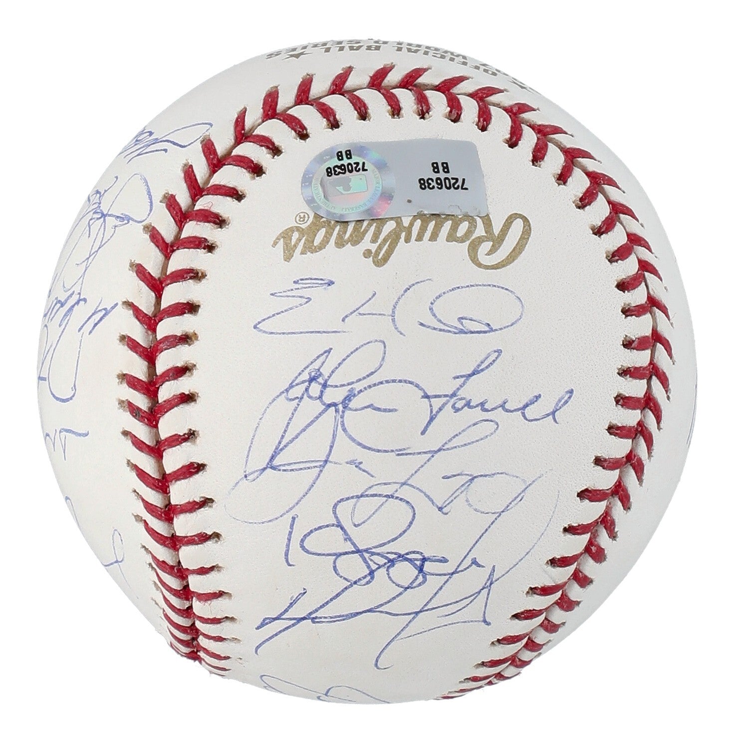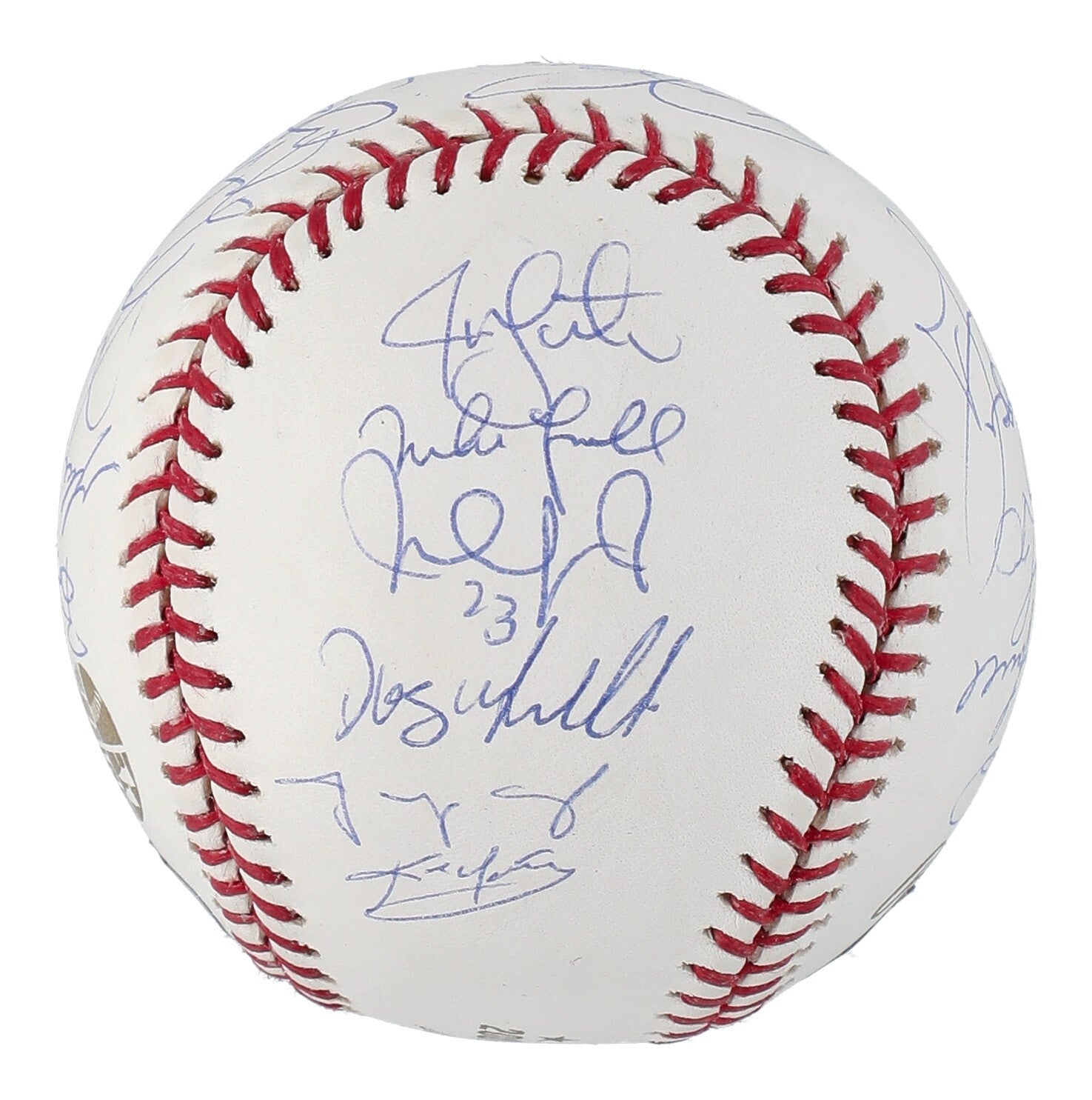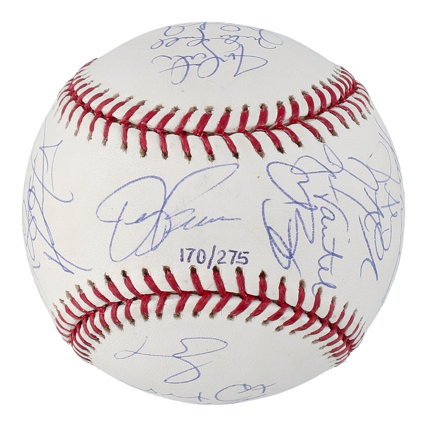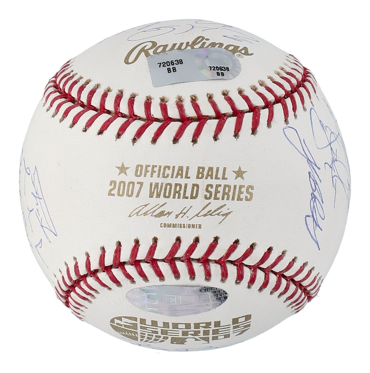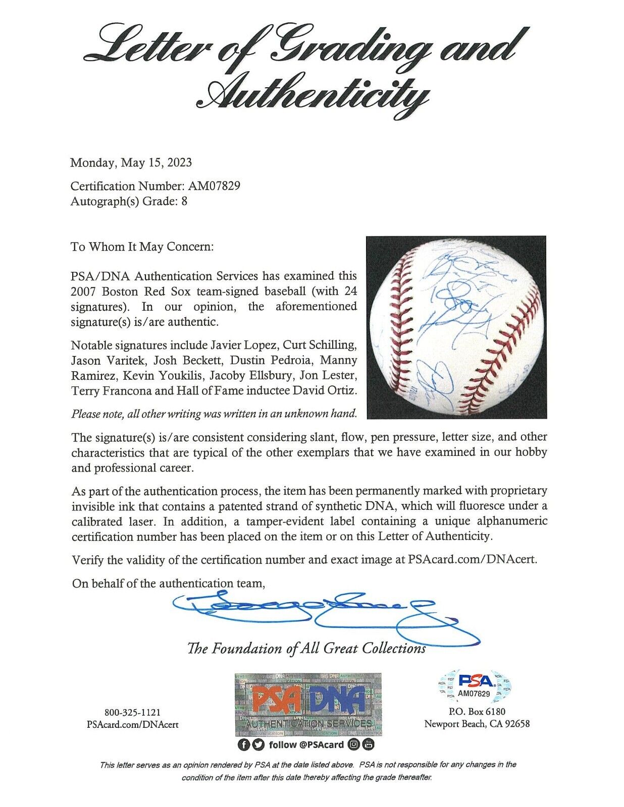 Offered is a limited edition (#170/275) 2007 Official World Series Allan H. Selig baseball signed in blue ballpoint pen by 24 members of the 2007 World Series champion Boston Red Sox. Key signatures on the ball include those of Hall of Famer David Ortiz, with additional signatures from Terry Francona, Javier Lopez, Curt Schilling, Jason Varitek, Josh Beckett, Dustin Pedroia, Manny Ramirez, Kevin Youkilis, Jacoby Ellsbury, Jon Lester, Alex Cora, Bobby Kielty, Eric Hinske, John Farrell, Johnathon Papelbon, Kyle Snyder, Luis Alicea, and Mike Timlin. The ball is accompanied by an MLB Authenticated hologram (BB720638), a hologram from Steiner, and an LOA from PSA/DNA, which gave the signatures the grade of NM-MT 8.