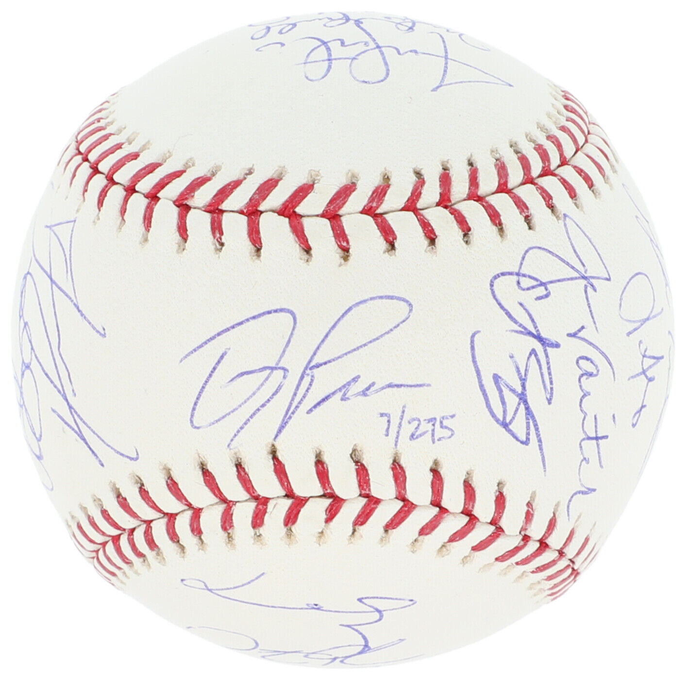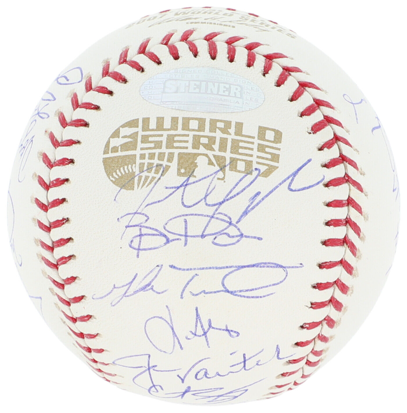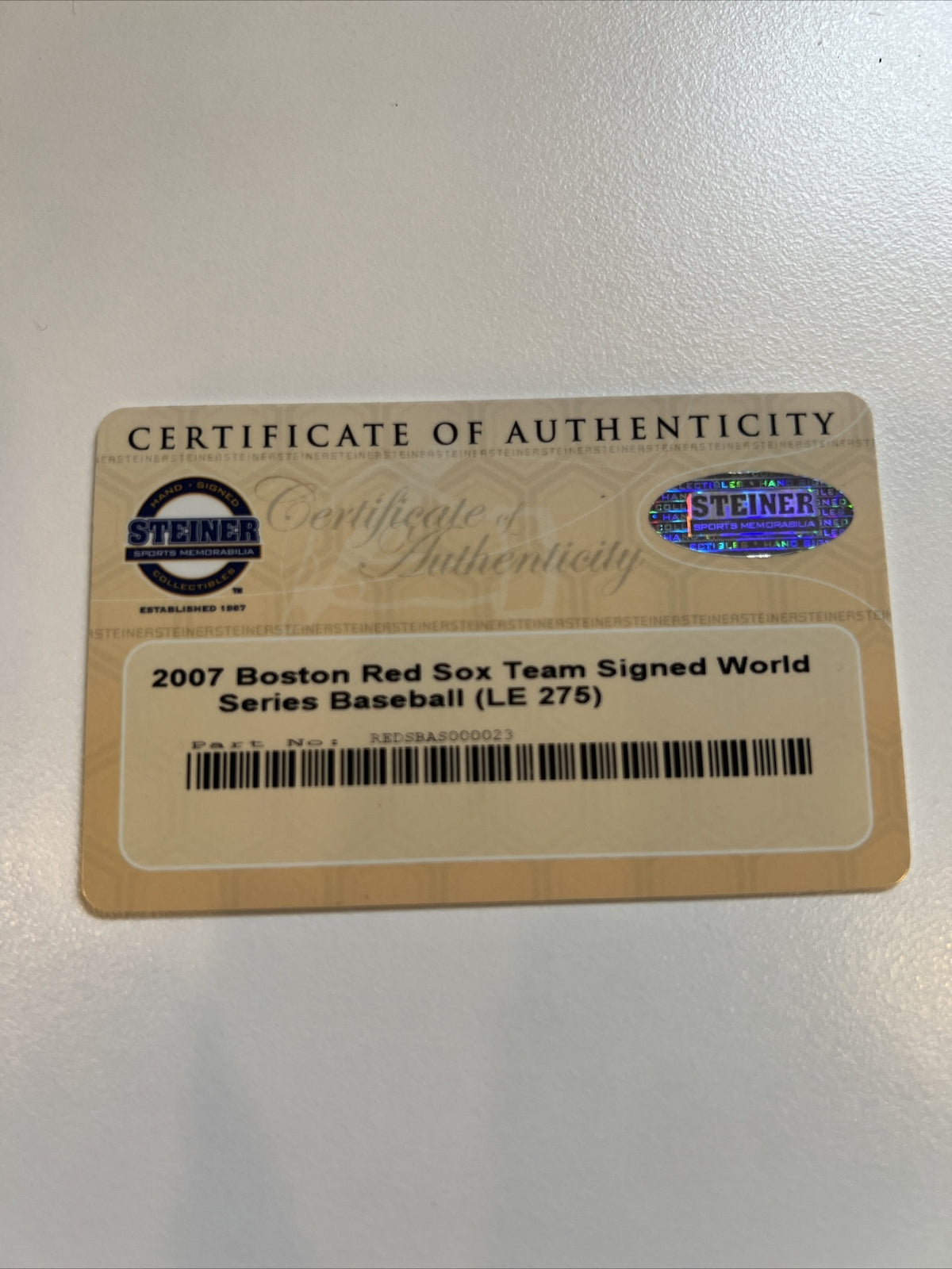 Offered here is an Official Major League Allan H. Selig World Series baseball signed by 24 members of the 2007 World Series champion Boston Red Sox. The 2007 Red Sox returned to the World Series for the first time since they broke the Curse of the Bambino in 2004. They faced the National League Champion Colorado Rockies and dominated the overmatched Rockies, sweeping them in four games and out-scoring the Rockies 29-10. Mike Lowell won the World Series MVP award, hitting .400 with a home run and 4 RBI. Manager Terry Francona signed his name on the sweet spot of this baseball. Other signatures include David Ortiz, Curt Schilling, Jason Varitek, Alex Cora, Bobby Kielty, Manny Ramirez, Eric Hinske, Javier Lopez, John Farrell, Jonathan Papelbon, Kyle Snyder, Luis Alicea, Mike Timlin, and others. The ball stands in overall excellent condition. The limited-edition piece is serial-numbered “007/275.” The baseball comes with a hologram from Steiner Sports as well as a hologram from MLB Authentication (BB720575) for the signatures.