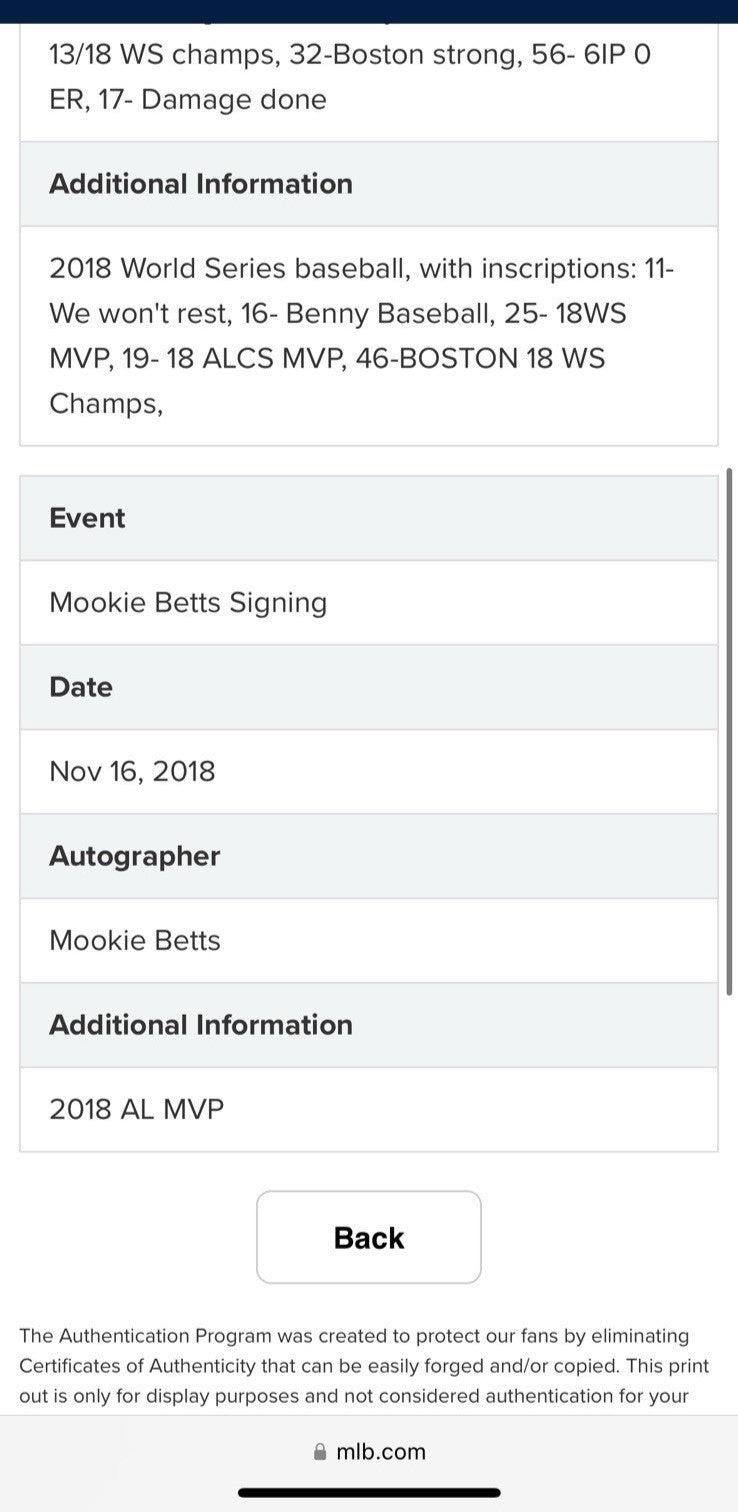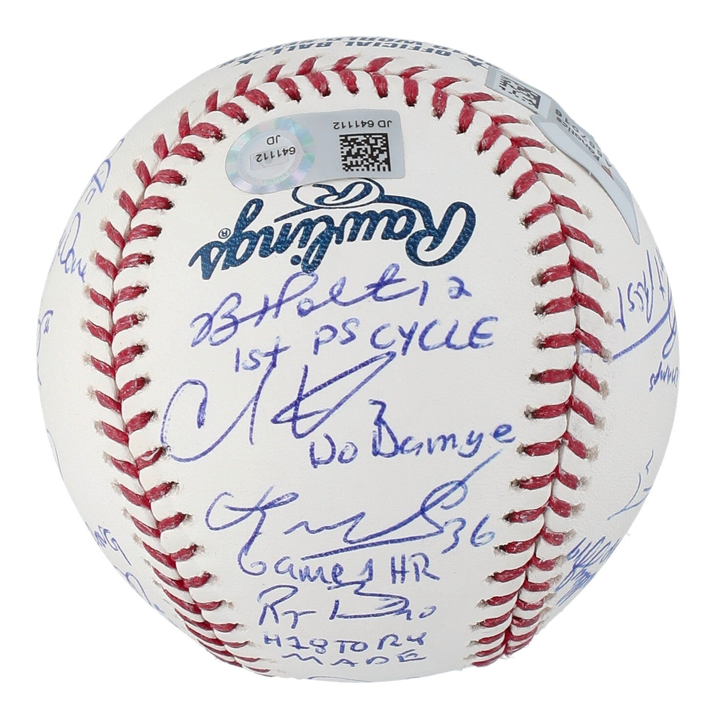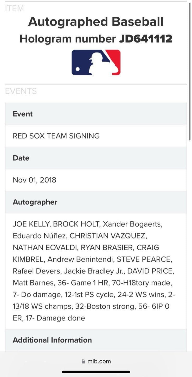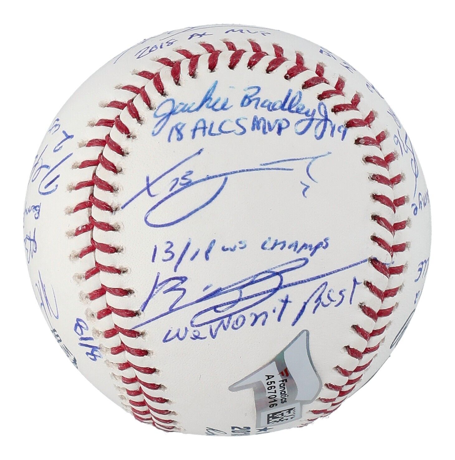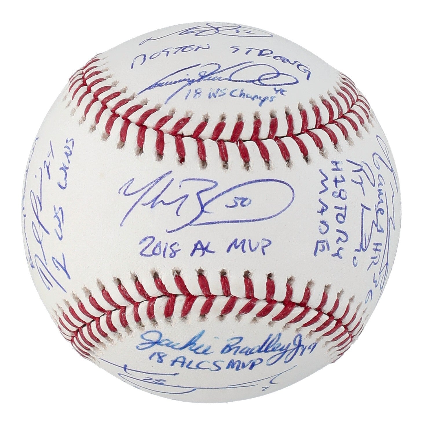 Offered is a limited edition (#8/18) 2018 Official World Series Robert D. Manfred Jr. baseball signed by 16 members of the World Series champion Boston Red Sox. Key signatures include those of Mookie Betts, who inscribed "2018 AL MVP," across the sweet spot. Jackie Bradley Jr. signed and inscribed "2018 ALCS MVP," with additional signatures from Matt Barnes, who inscribed "Boston Strong," Andrew Benintendi, Xander Bogaerts, Ryan Brasier, Rafael Devers, Nathan Eovaldi, Brock Holt, Joe Kelly, who inscribed "6 IP 0 ER," Craig Kimbrel, Eduardo Nunez, Steve Pearce, David Price, and Christian Vazquez. The ball is accompanied by an MLB Authenticated hologram (JD641112) and a hologram from Fanatics (A567016) for the signatures.