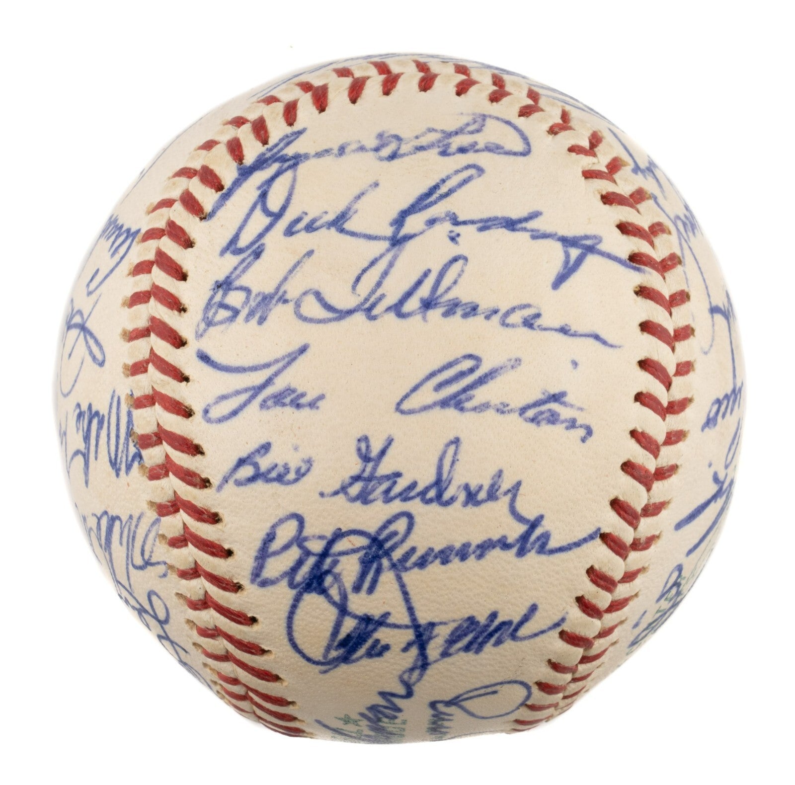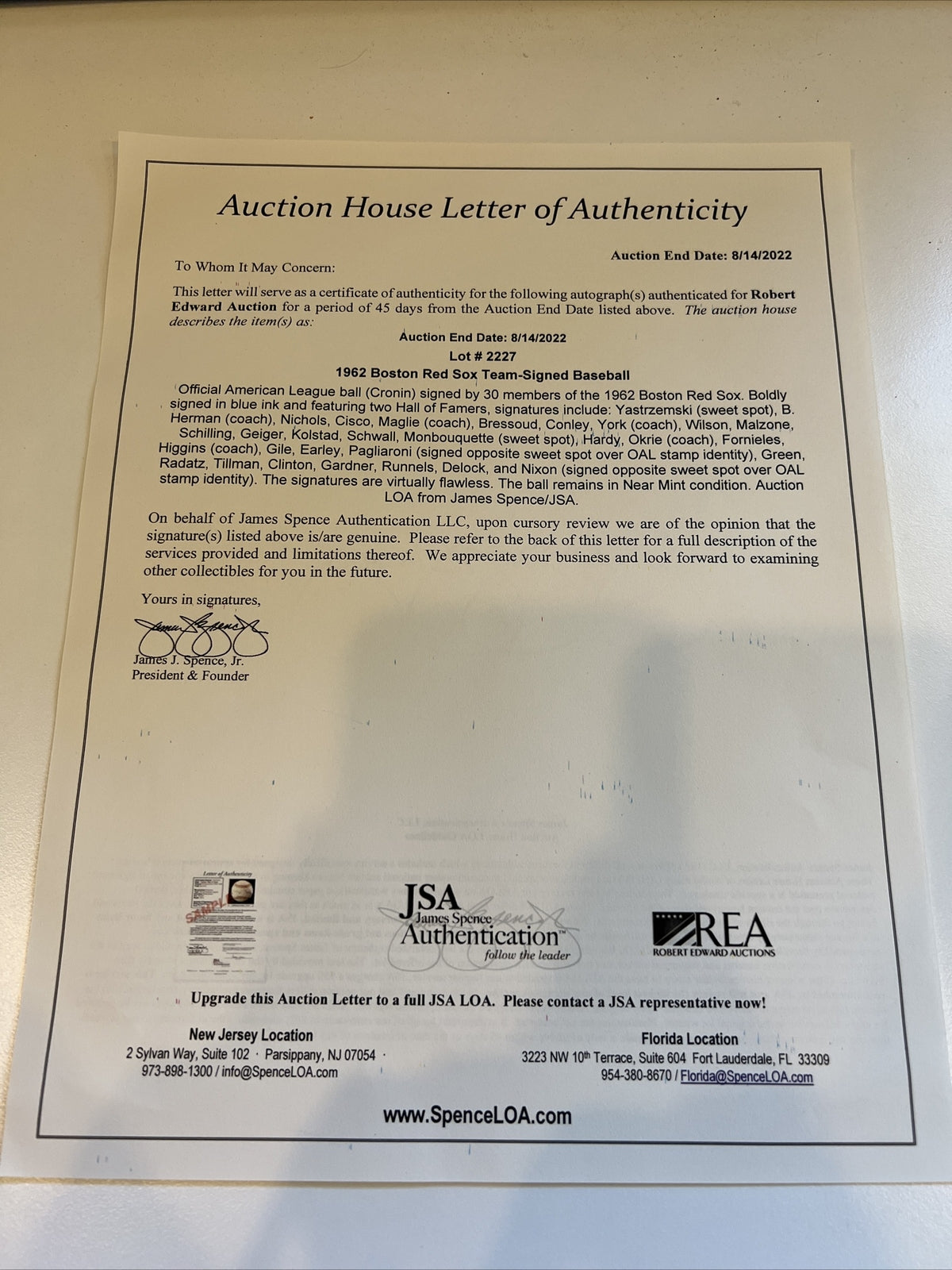 Official American League ball (Cronin) signed by 30 members of the 1962 Boston Red Sox. Boldly signed in blue ink and featuring two Hall of Famers, signatures include: Carl Yastrzemski (sweet spot), B. Herman (coach), Nichols, Cisco, Maglie (coach), Bressoud, Conley, York (coach), Wilson, Malzone, Schilling, Geiger, Kolstad, Schwall, Monbouquette (sweet spot), Hardy, Okrie (coach), Fornieles, Higgins (coach), Gile, Earley, Pagliaroni (signed opposite sweet spot over OAL stamp identity), Green, Radatz, Tillman, Clinton, Gardner, Runnels, Delock, and Nixon (signed opposite sweet spot over OAL stamp identity). The signatures are virtually flawless. The ball remains in Near Mint condition. Auction LOA from James Spence/JSA.