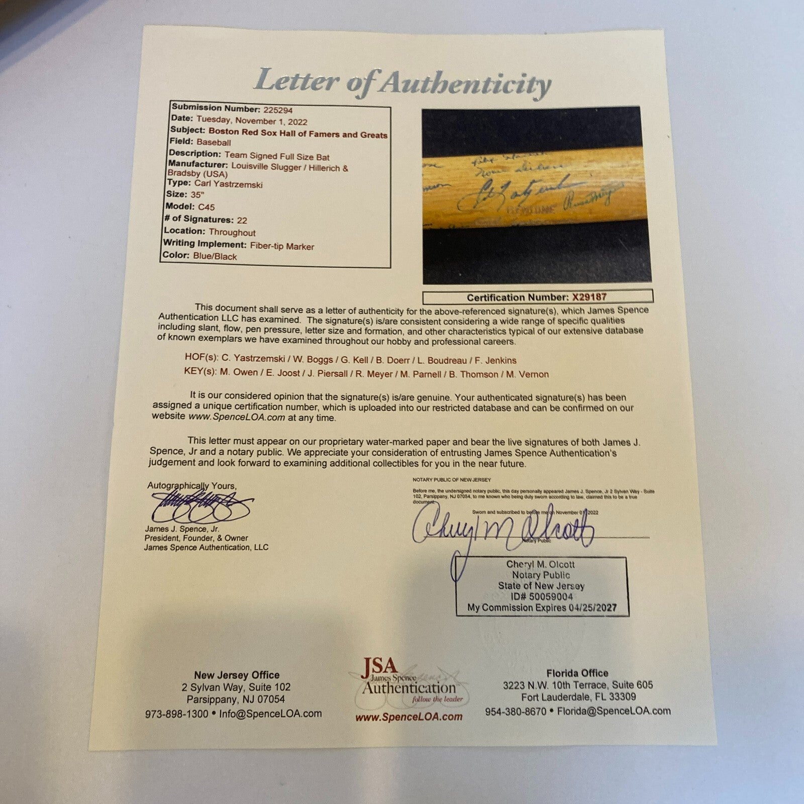 Carl Yastrzemski Boston Red Sox Legends Multi Signed Baseball Bat JSA COA