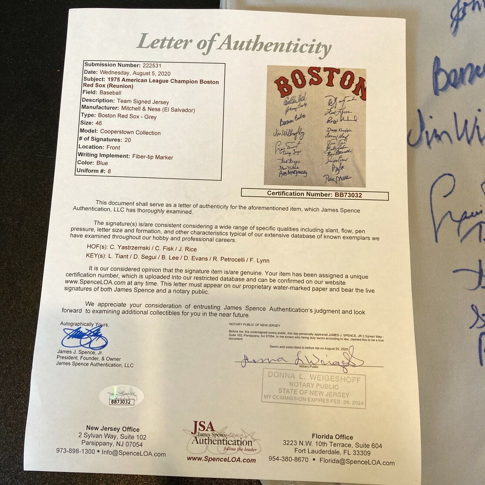 Stunning 1975 Boston Red Sox AL Champs Team Signed Authentic Mitchell & Ness Jersey. 20 signatures with Carl Yastrzemski and many others. See photos for a complete list. Full letter JSA COA.