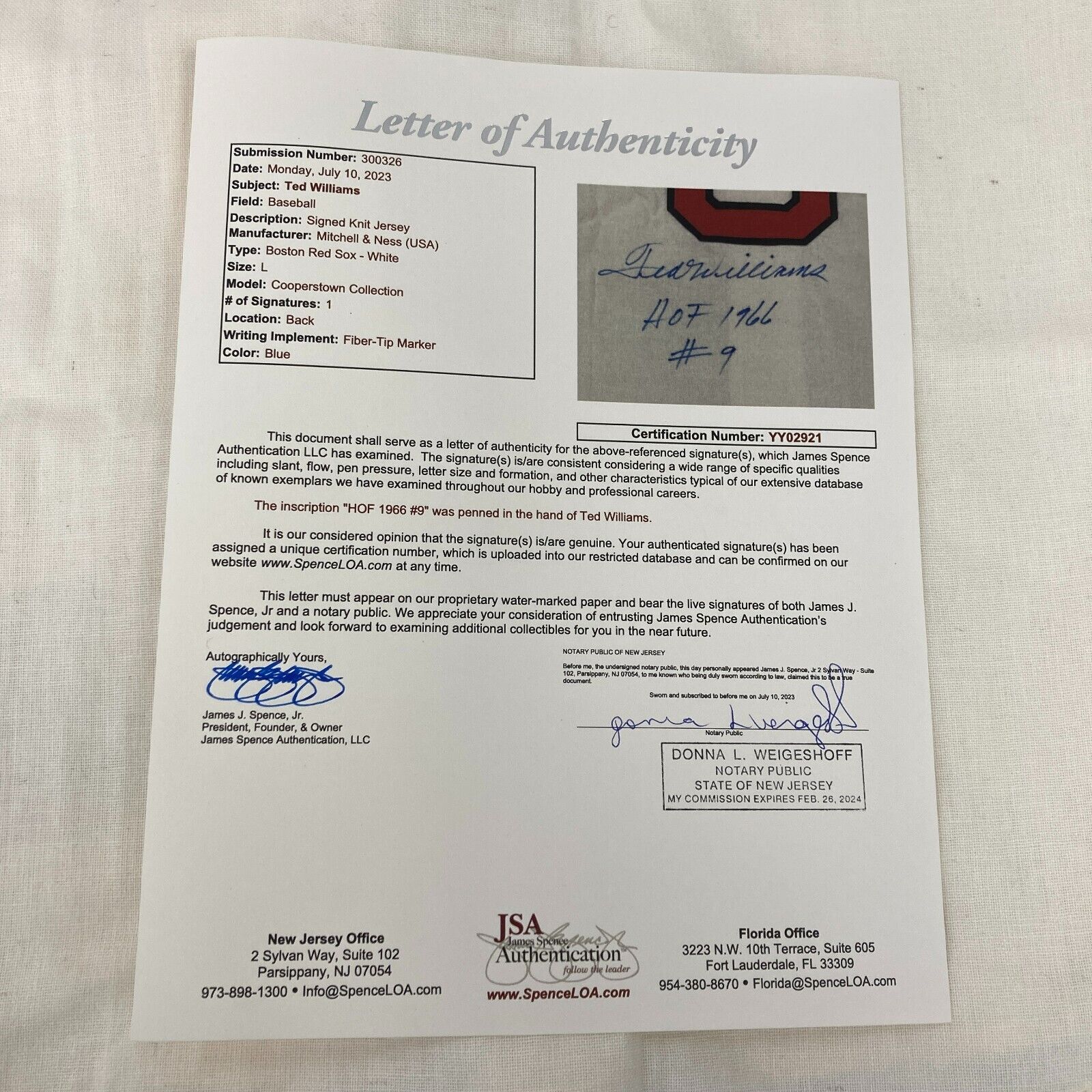 The Finest Ted Williams "Hall Of Fame 1966 #9" Signed Authentic Boston Red Sox Mitchell & Ness Jersey.