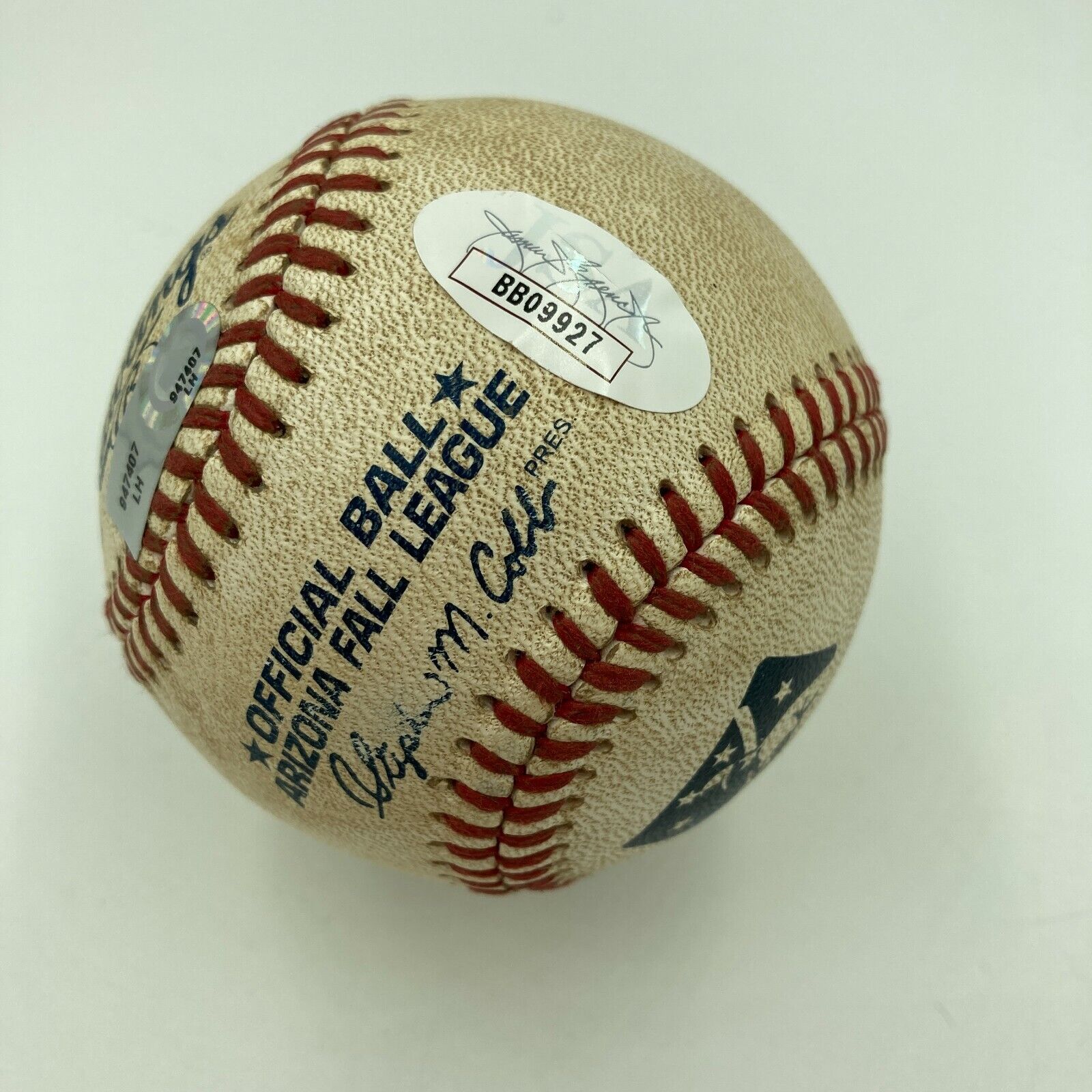 Extraordinary Bryce Harper first professional game ever played signed game used Arizona Fall League Baseball. Used in his first game 0n 10-20-2010. Full letter COA from JSA and MLB Authenticated hologram for the game use.