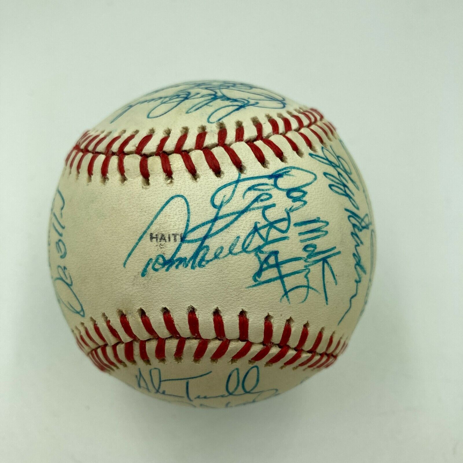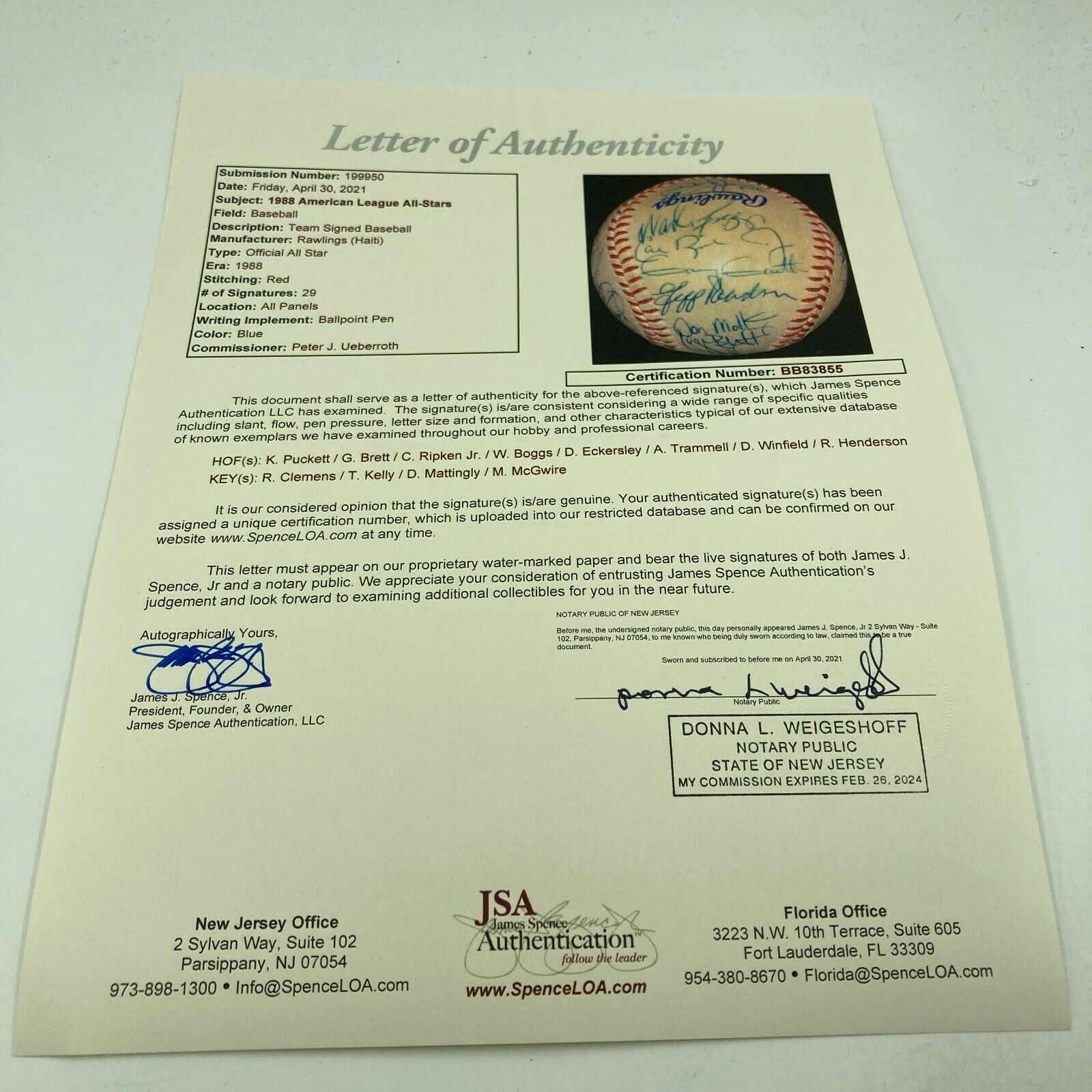 1988 American League All-Stars team signed baseball. P.Ueberroth 1988 All-Star Game ball signed by (29) members of the AL team including Tom Kelly, Kirby Puckett, Rickey Henderson, Wade Boggs, Dave Winfield, Cal Ripken Jr, George Brett, Alan Trammell, Dennis Eckersley, Mark McGwire, Roger Clemens, Terry Steinbach, Frank Viola, Don Mattingly, Dan Plesac, and others.