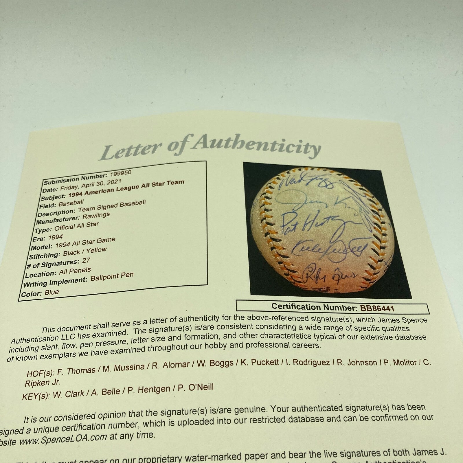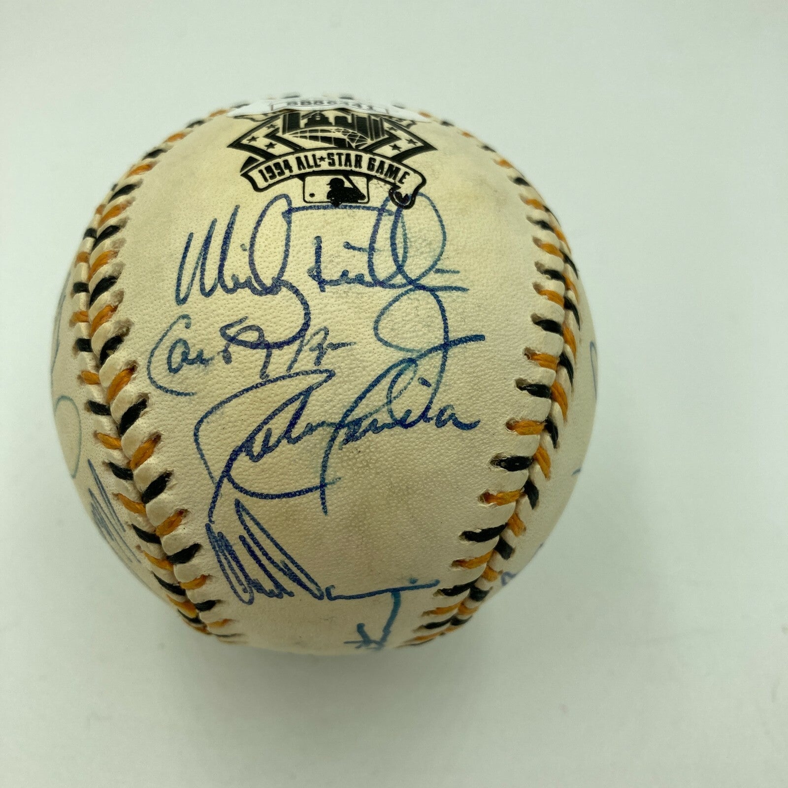 1994 American League All-Stars team signed baseball. Rawlings official 1994 All-Star Game ball signed by (27) members of the AL team including Cito Gaston, Kirby Puckett, Cal Ripken Jr, Roberto Alomar, Wade Boggs, Frank Thomas, Ivan Rodriguez, Paul Molitor, Randy Johnson, Mike Mussina, Lee Smith, Jimmy Key, Albert Belle, Mickey Tettleton, and others.