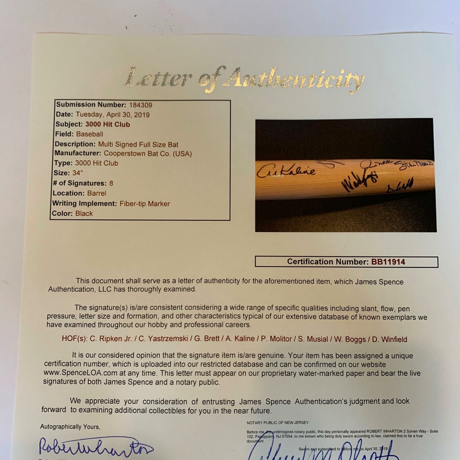 3,000 Hit Club Signed Bat. 8 signatures with Cal Ripken Jr., George Brett, Carl Yastrzemski, Stan Musial, Al Kaline, Paul Molitor, Wade Boggs and Dave Winfield. Full letter JSA COA.