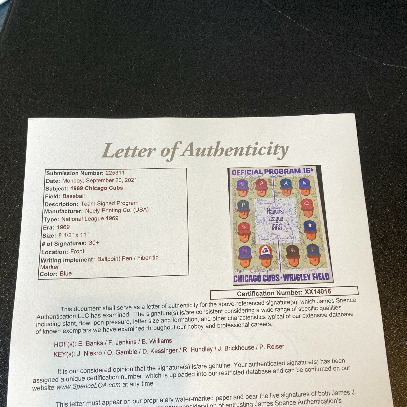 Offered is a program from a 1969 Chicago Cubs game at Wrigley Field which has been signed by over 35 team members including Nate Oliver, Paul Popovich, Joe Niekro, Al Spangler, Fergie Jenkins, Don Nottebart, Glenn Beckert, Adolfo Phillips, Billy Williams, Jack Brickhouse, Ernie Banks, Don Kessinger, Randy Hundley, Phil Regan, Oscar Gamble, Bill Hands, Jim Hickman, Gene Oliver, Jimmy Qualls and more.