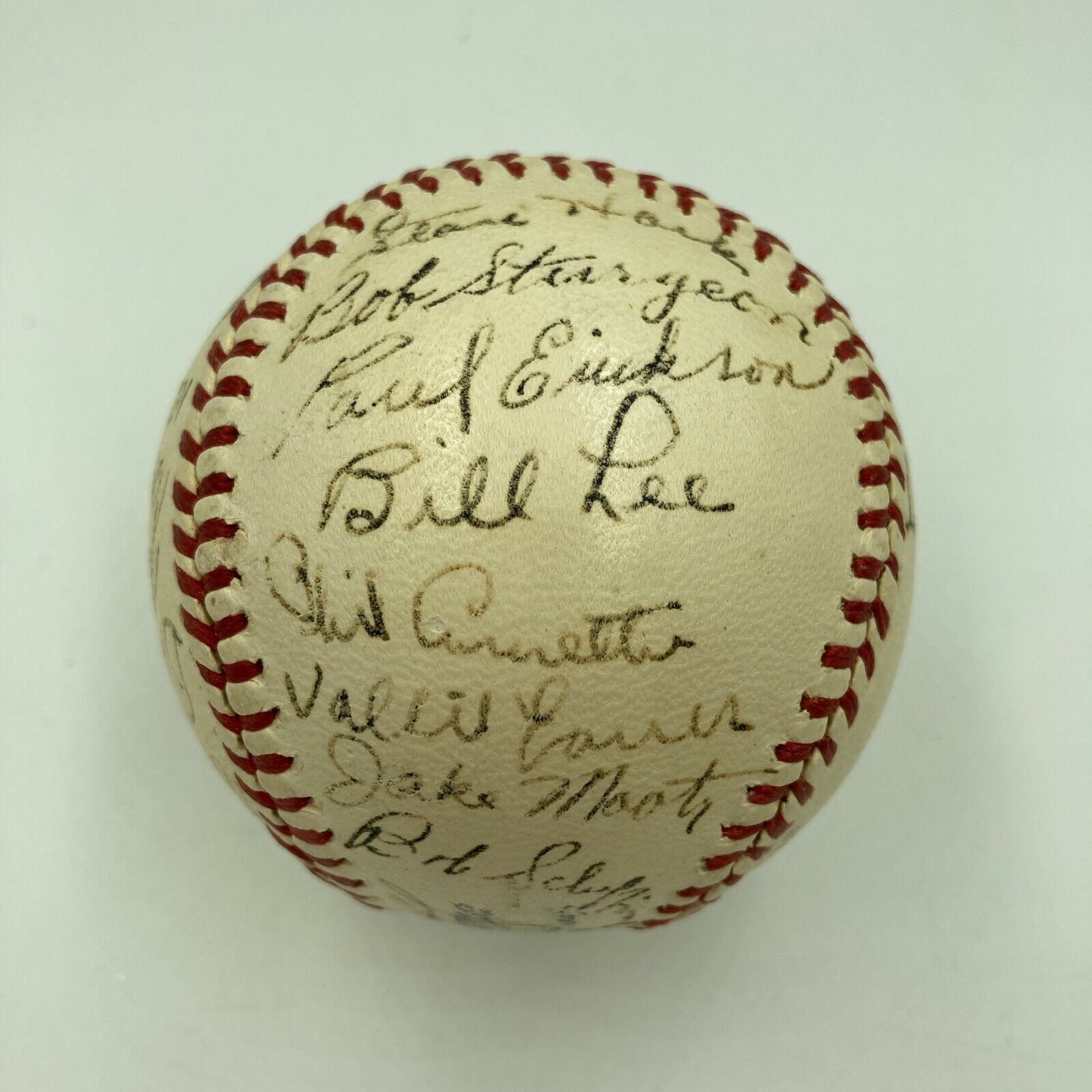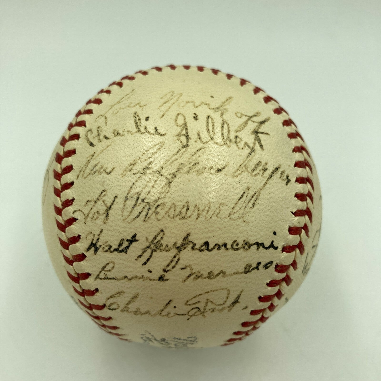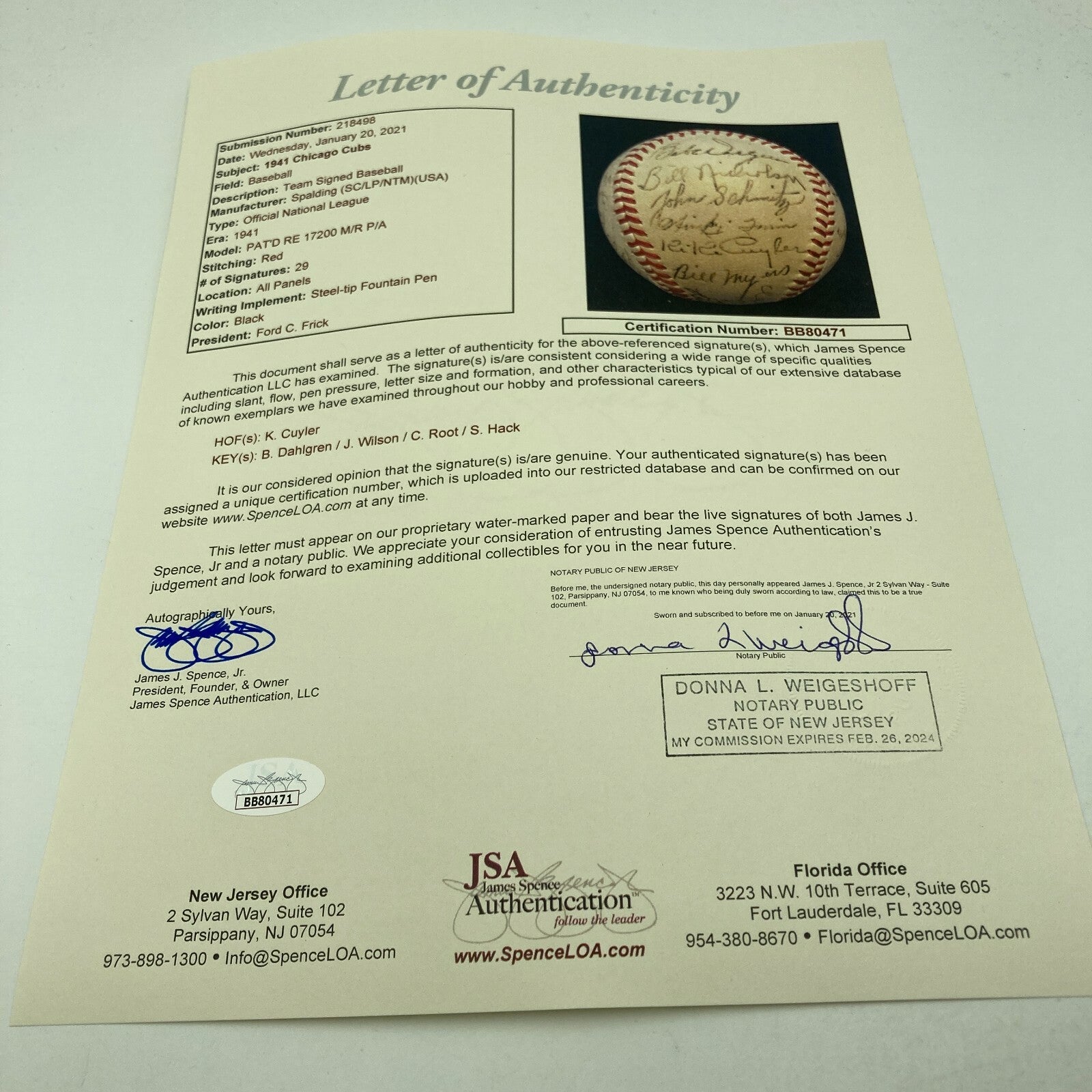 Official National League (Frick) ball features 28 black fountain ink signatures of the 1941 Cubs including the extremely rare autograph of Wimpy Quinn, signed during his brief 3-game career. His unfortunate death at the age of 36 in 1954 helps to account for his extreme rarity. Other signers include Ki Ki Cuyler, Lou Novikoff, Bill Lee, Charlie Root, Stan Hack, Jim Wilson, Bill Nicholson, Babe Dahlgren, Claude Passeau, and Phil Cavarretta. Ball presents in MINT condition; Full letter JSA COA.